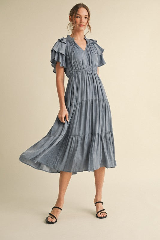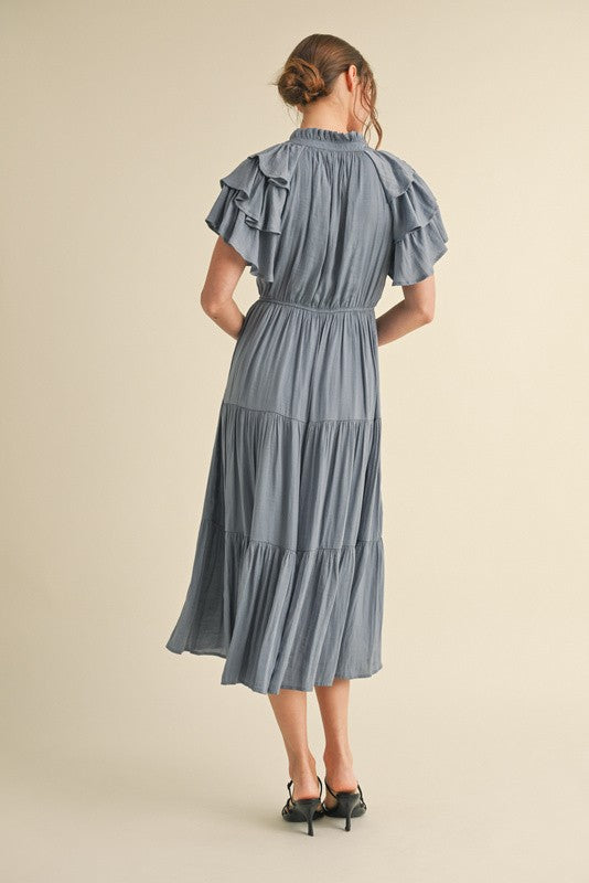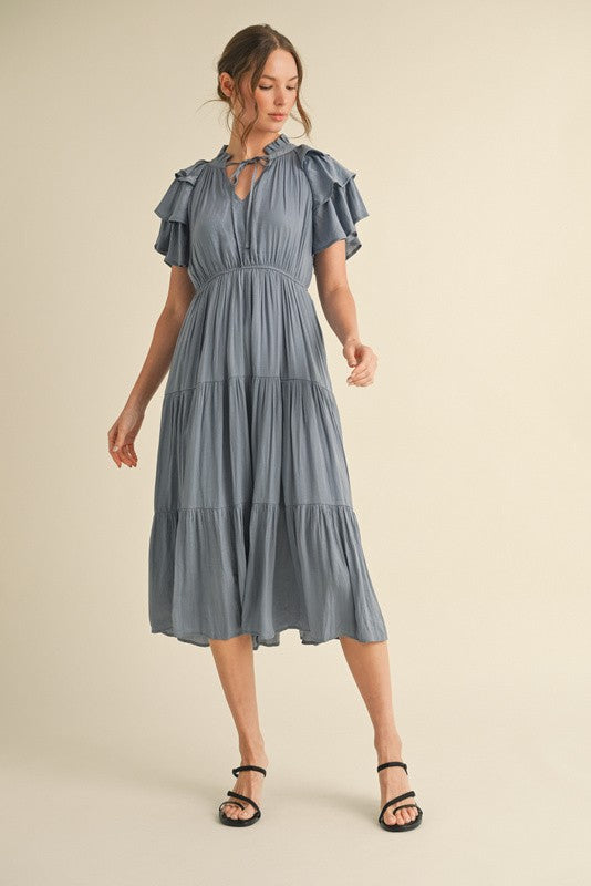 Solid wrinkle midi dress with frilled tie neck, layer ruffly cap sleeves, and tiered layer