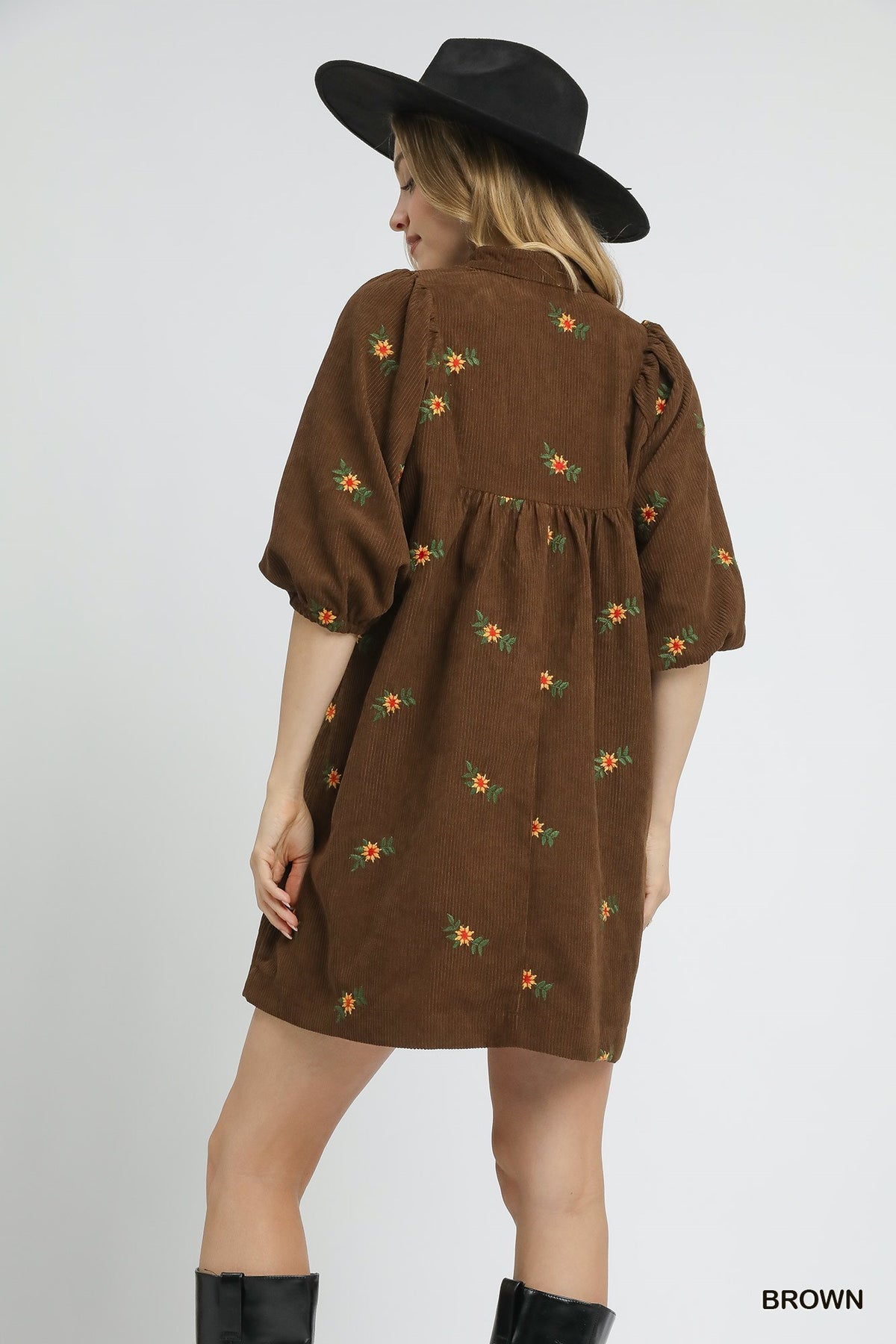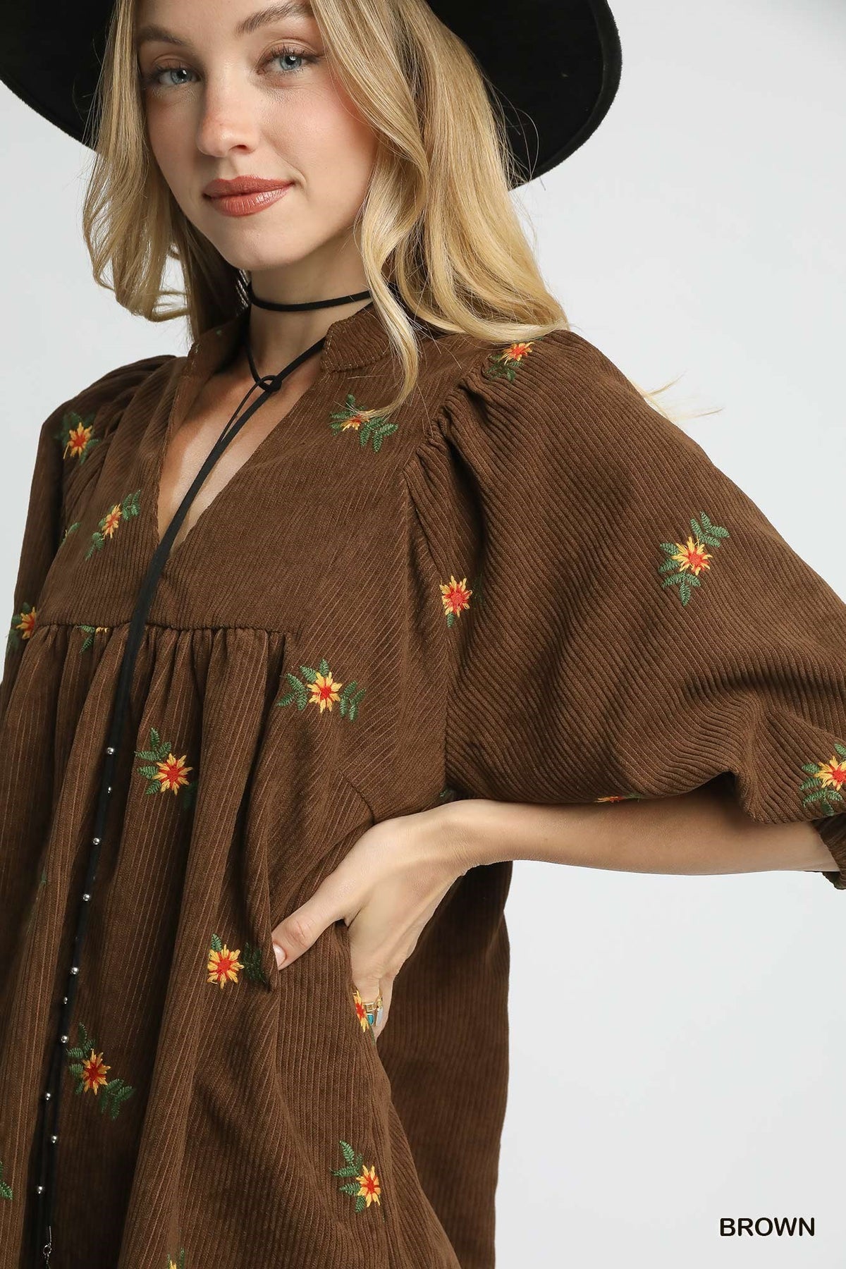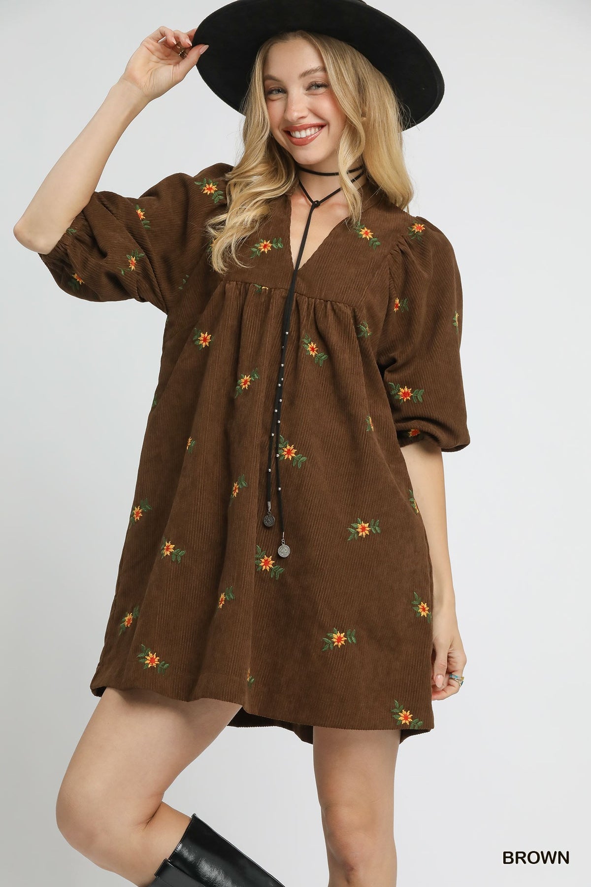 This Autumn in Corduroy Tunic/Dress features delicate floral embroidery that adds a refined, feminine touch. The flattering V-neckline enhances the silhouette while maintaining comfort. Three-quarter puff sleeves with gathered hems provide a stylish, vintage-inspired detail. Crafted from soft corduroy, this babydoll dress offers both warmth and effortless elegance for cooler seasons.