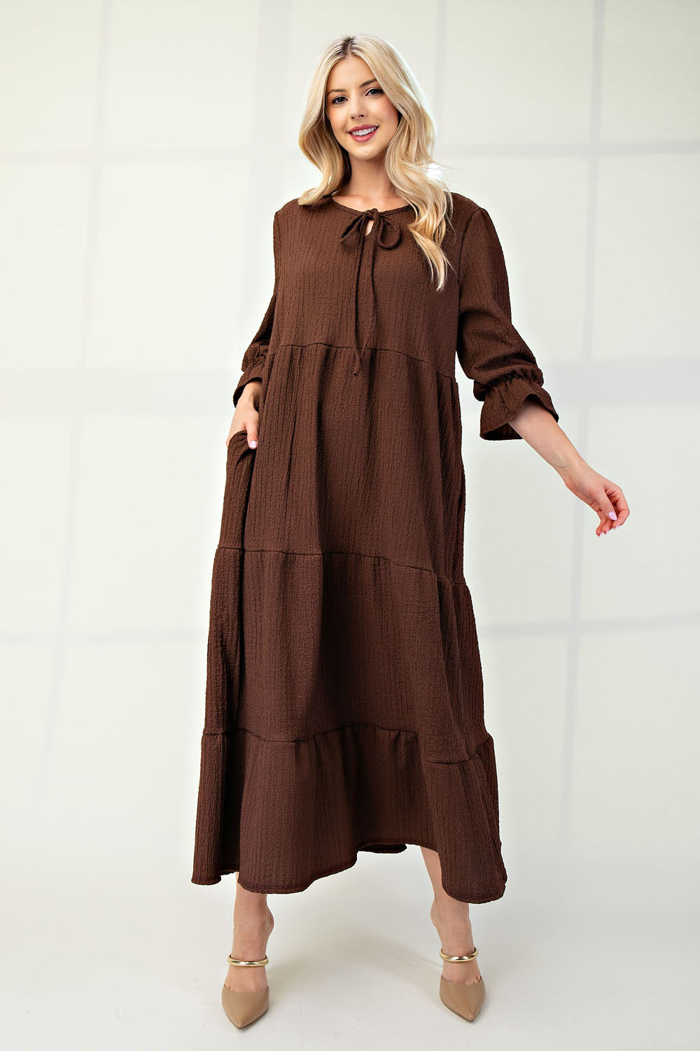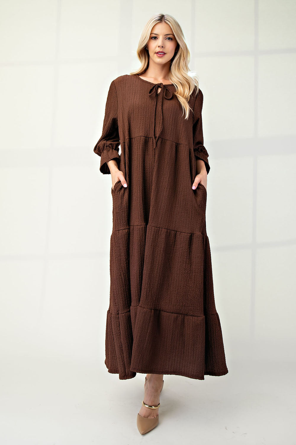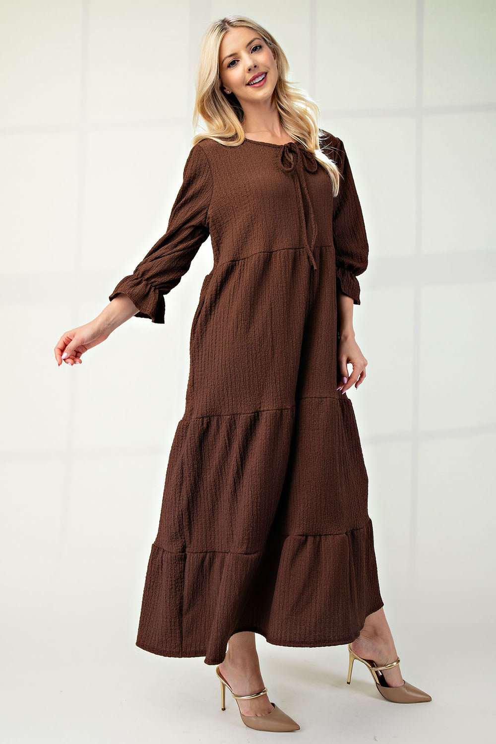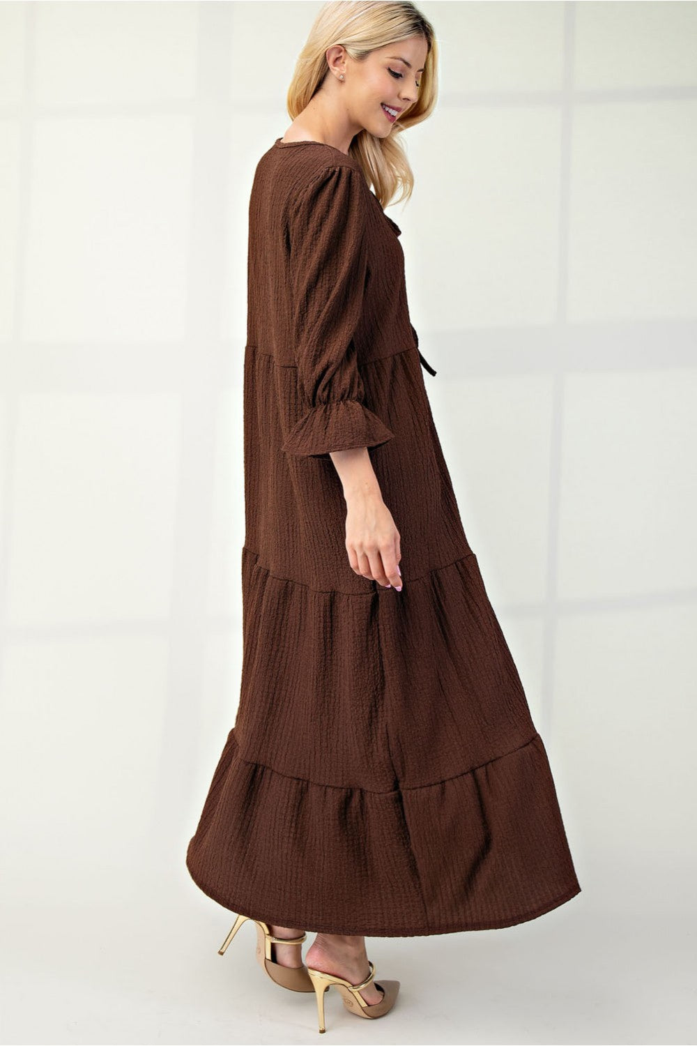 A solid textured, tiered maxi dress featuring puff sleeves, ruffle elastic cuff, and tie key hole front