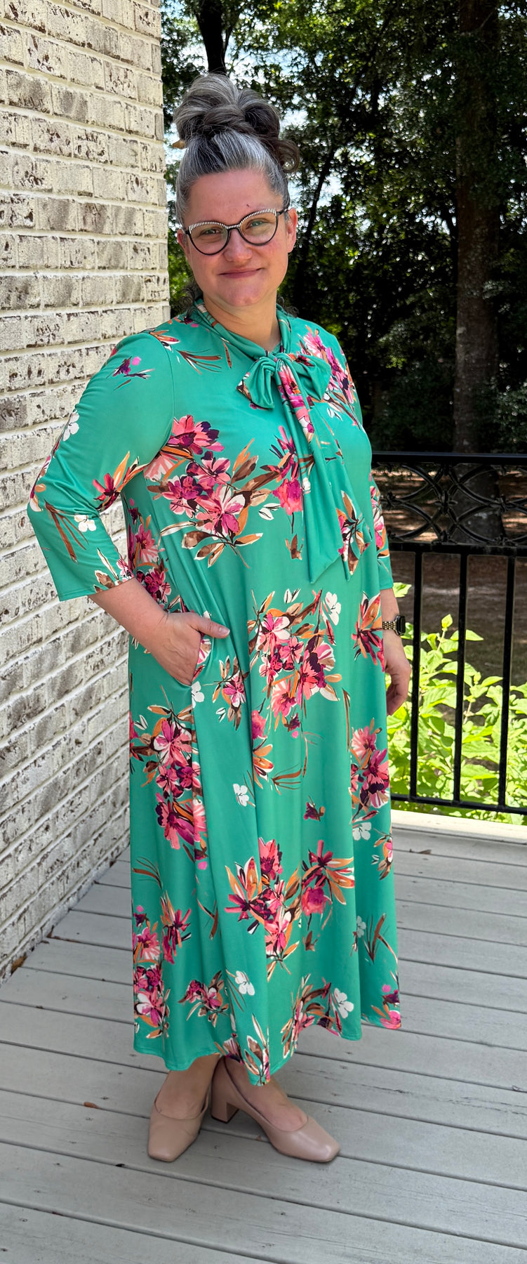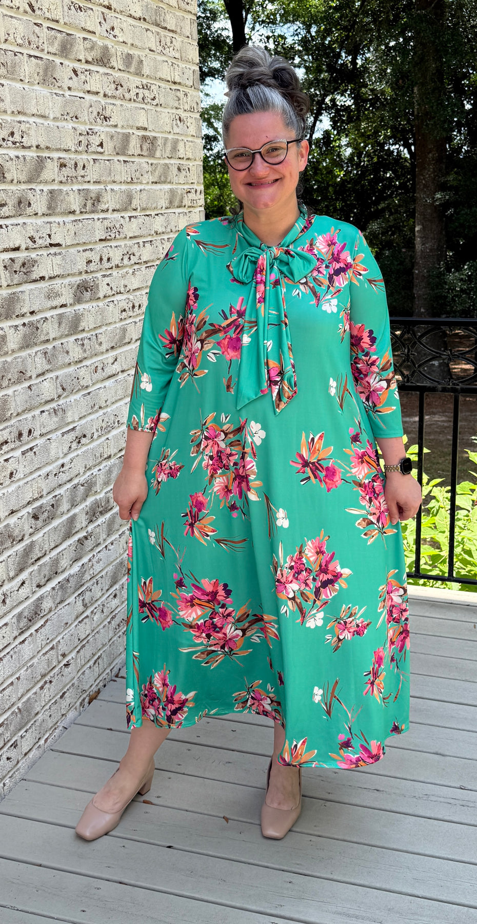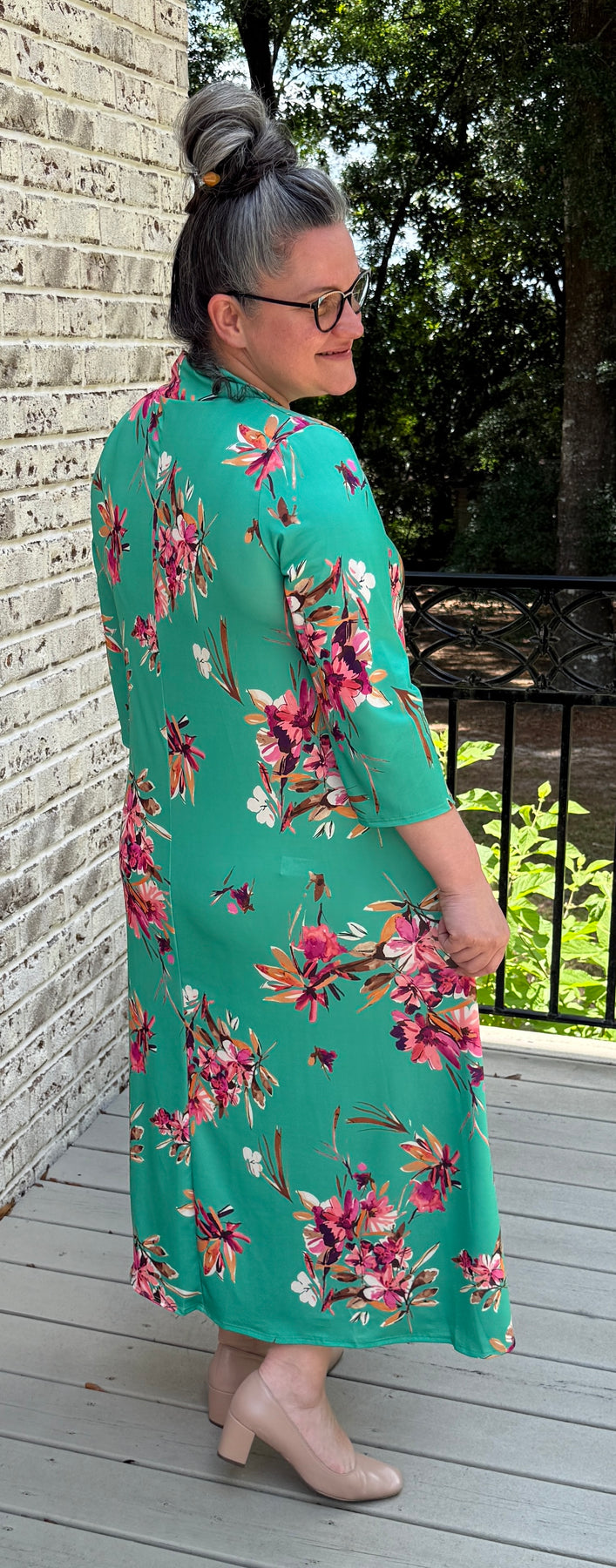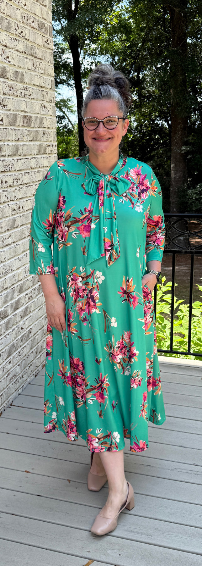 It’s made of a stretchy polyester spandex fabric. It has pockets and this gorgeous tie that ties right at the neckline. Three-quarter sleeve and a modest length made with you in mind.