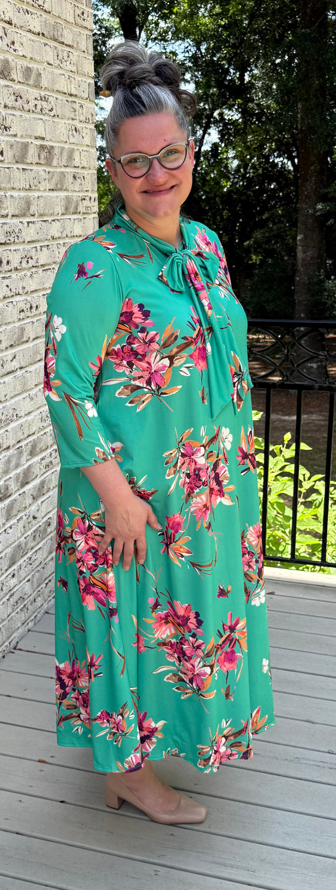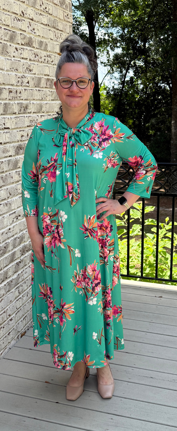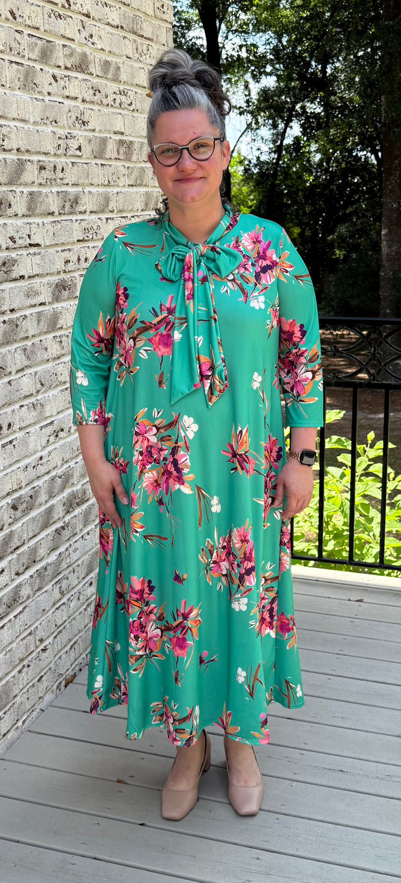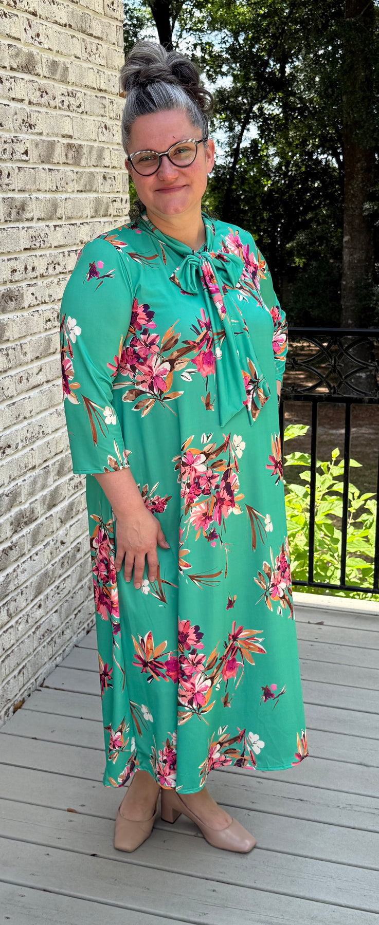 It’s made of a stretchy polyester spandex fabric. It has pockets and this gorgeous tie that ties right at the neckline. Three-quarter sleeve and a modest length made with you in mind.