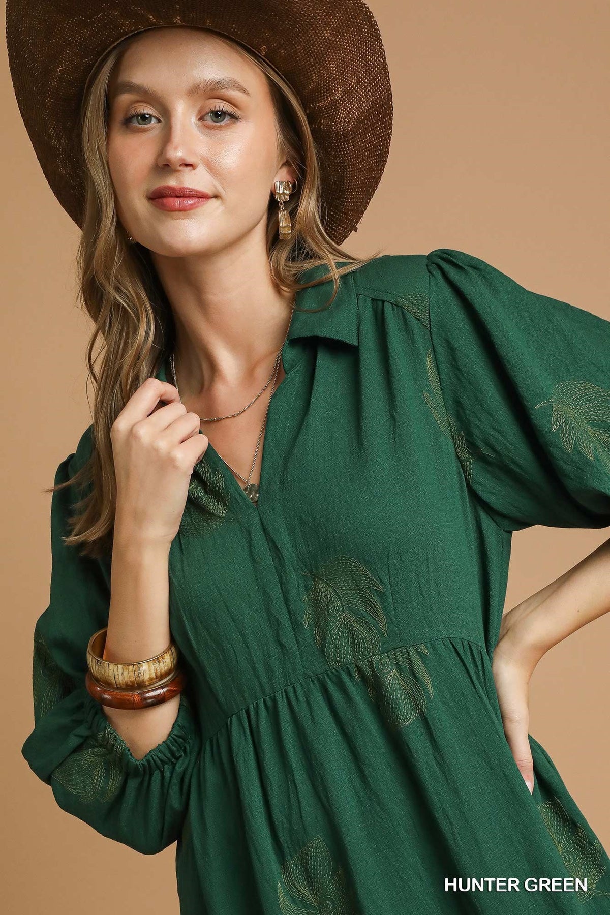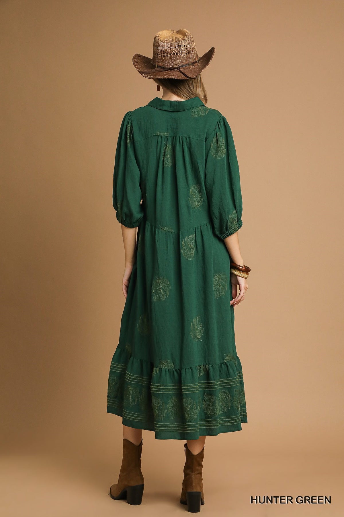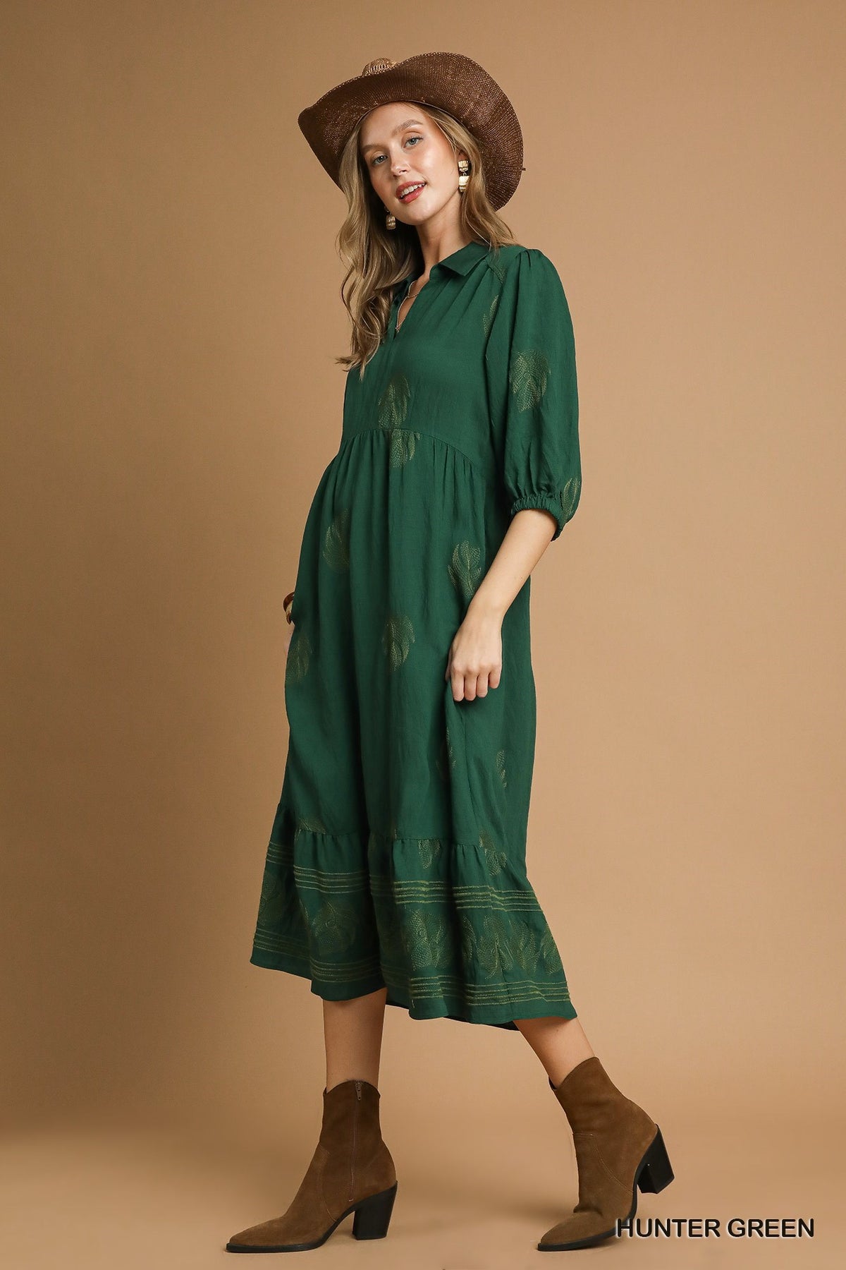 The Ellie Embroidered Dress in navy features a delicate embroidered design that adds subtle elegance. Its V-neck with a soft collar frames the neckline gracefully, enhancing sophistication. The 3/4 puff sleeves provide a stylish, vintage-inspired silhouette while ensuring comfort. Falling to a midi length, the dress offers versatile wear for various occasions. A tiered ruffled hem adds movement and a feminine touch, completing this expertly crafted piece.