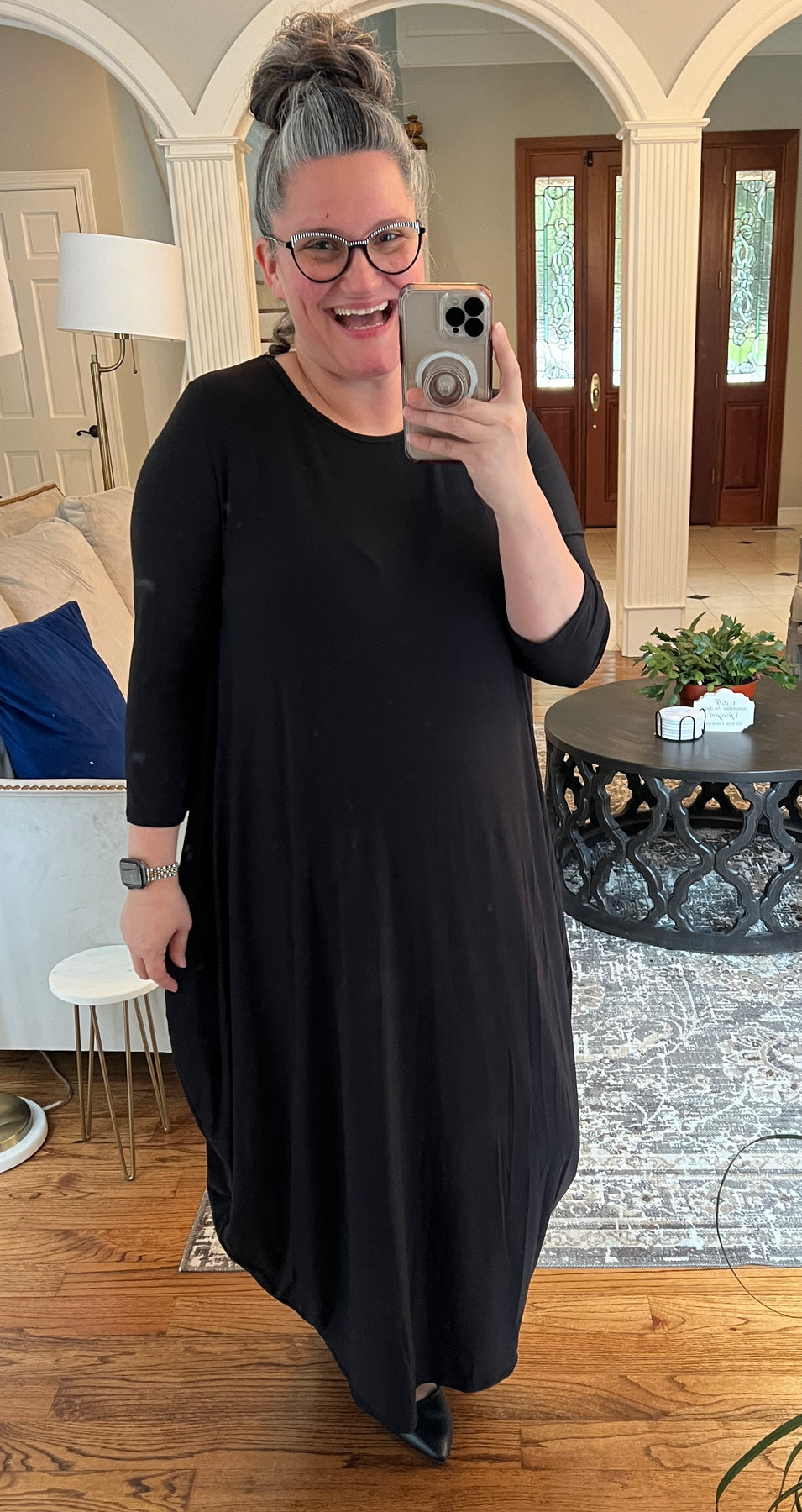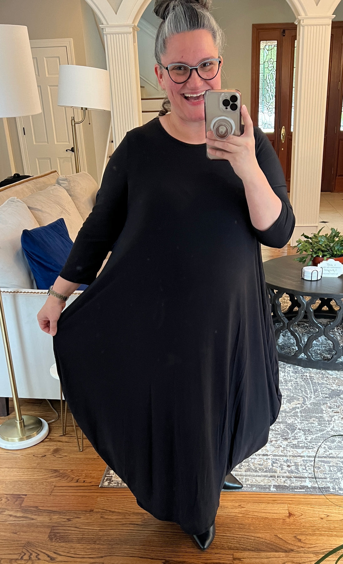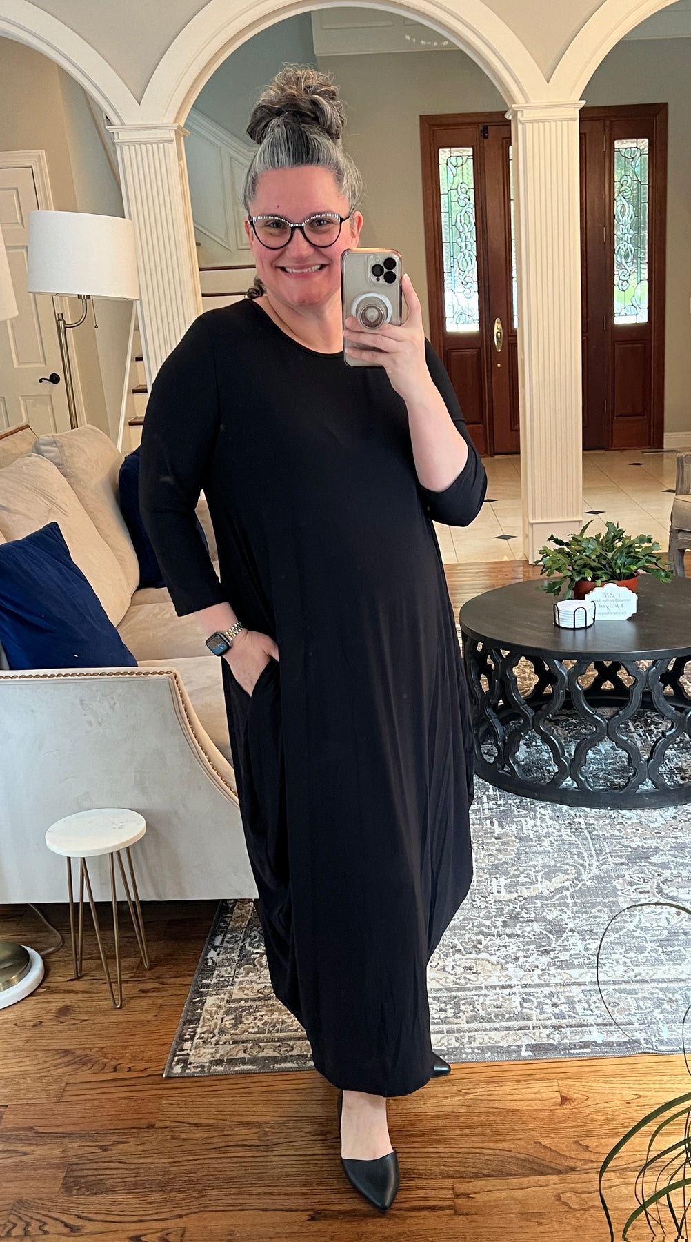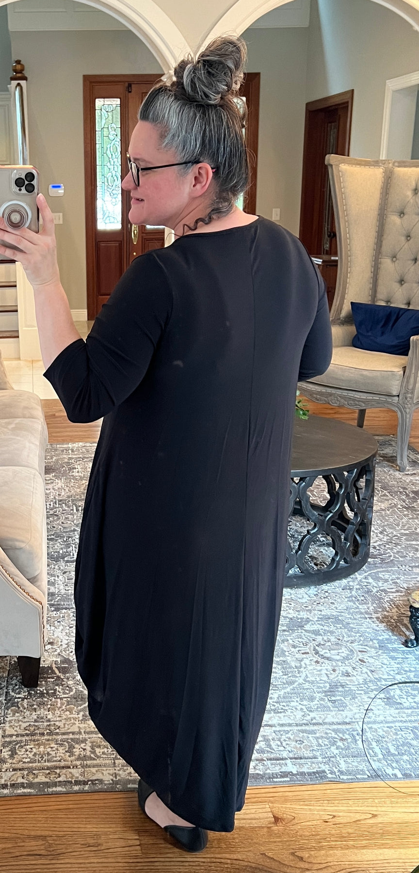 One of our best selling dresses! Fiona features a modest neckline, 3/4 sleeve, bubble style through the hip & thigh area that drapes so nice on any body type, tapering at the hem and pockets! No layering needed!