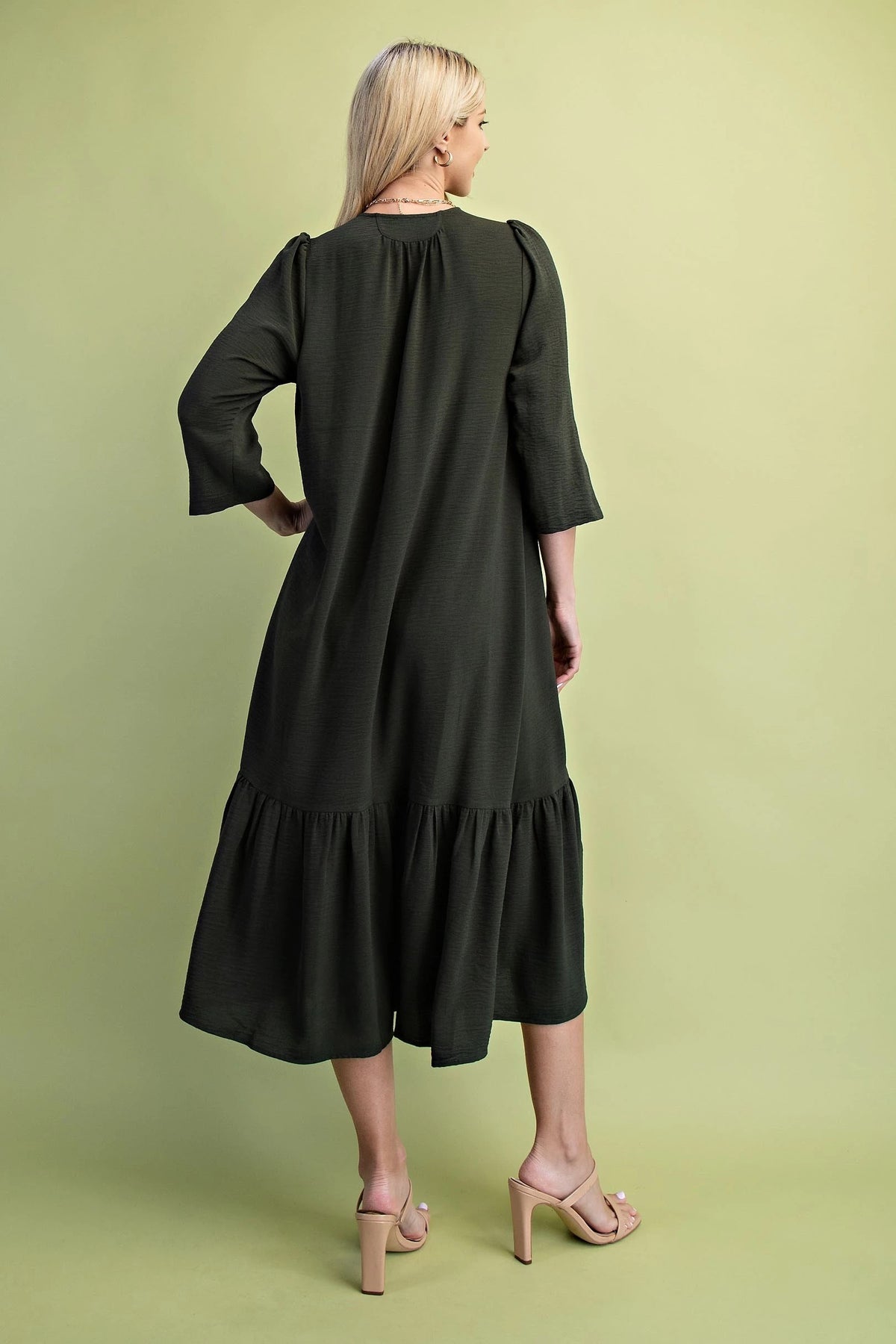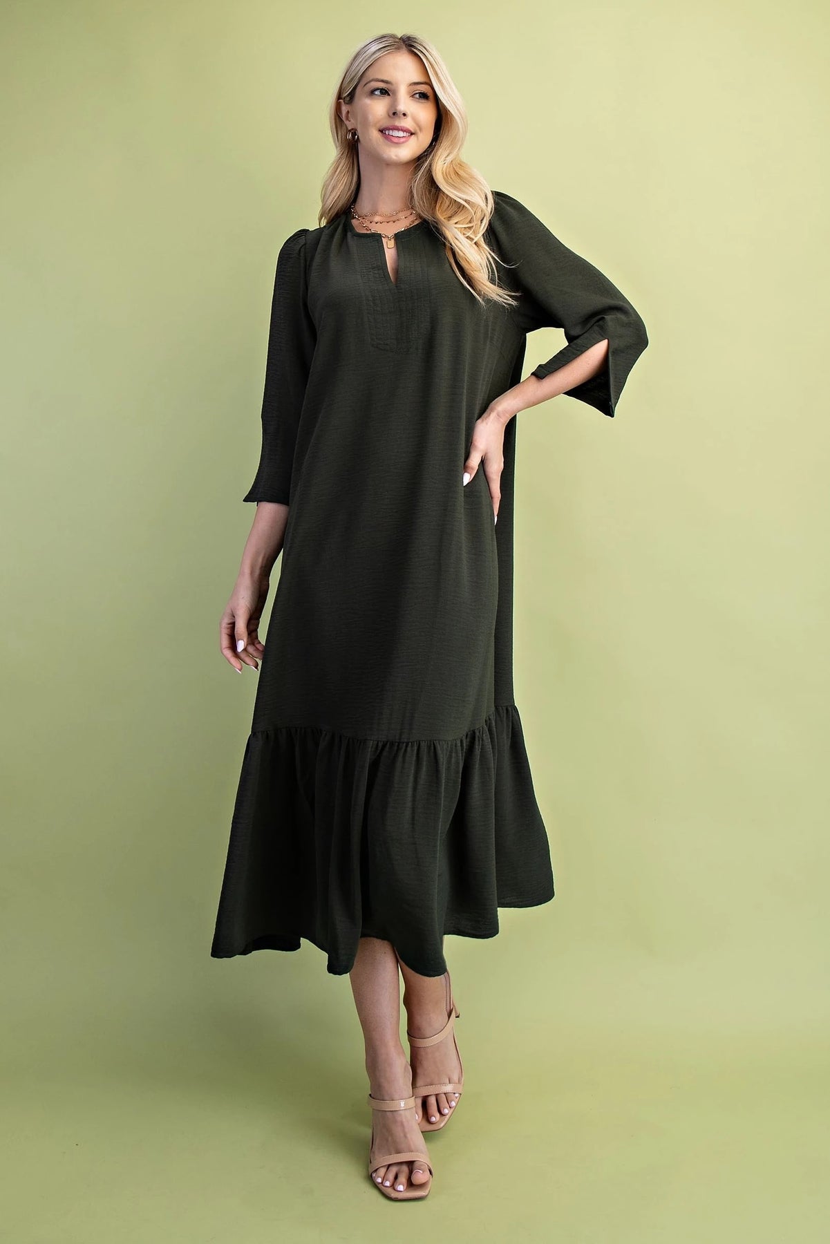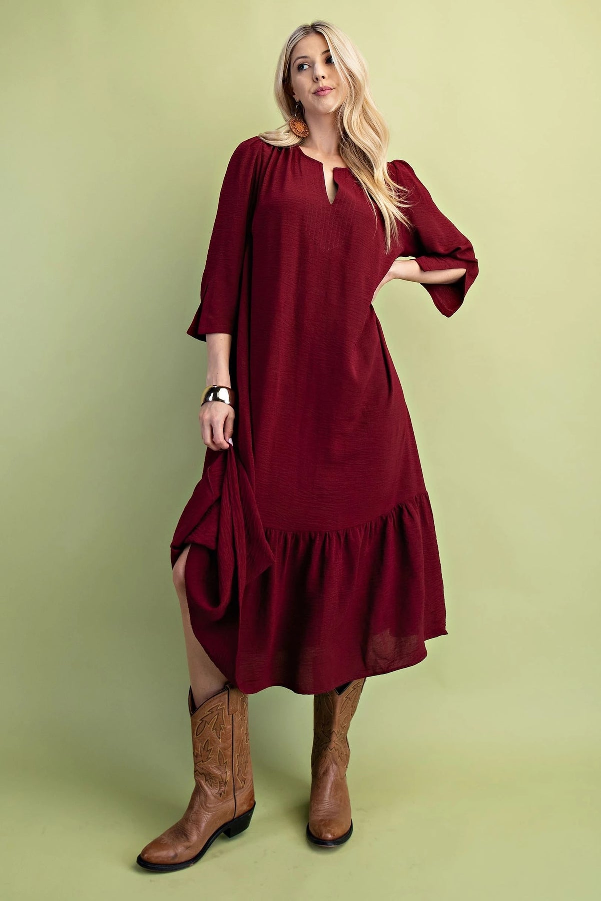 The First Love in Fall Dress features a flattering midi length and long sleeves, perfect for cooler seasons. Its notched sleeves add a refined, tailored detail that elevates the overall design. Pleated accents introduce subtle texture and movement, enhancing the dress’s sophisticated silhouette. Available in rich fall colors, this dress seamlessly blends seasonal warmth with timeless elegance.