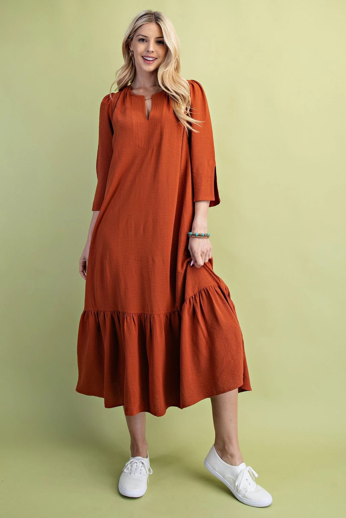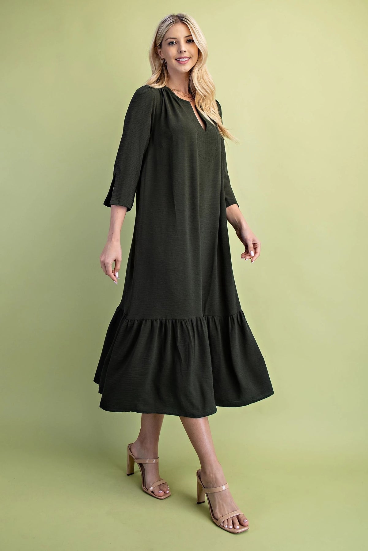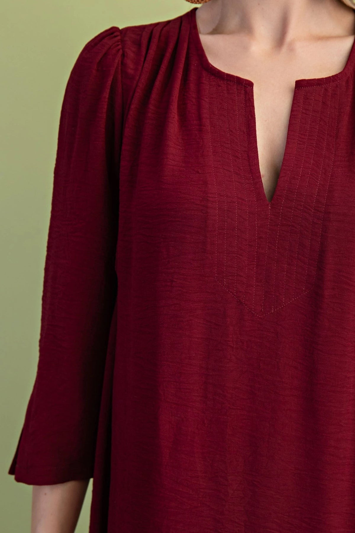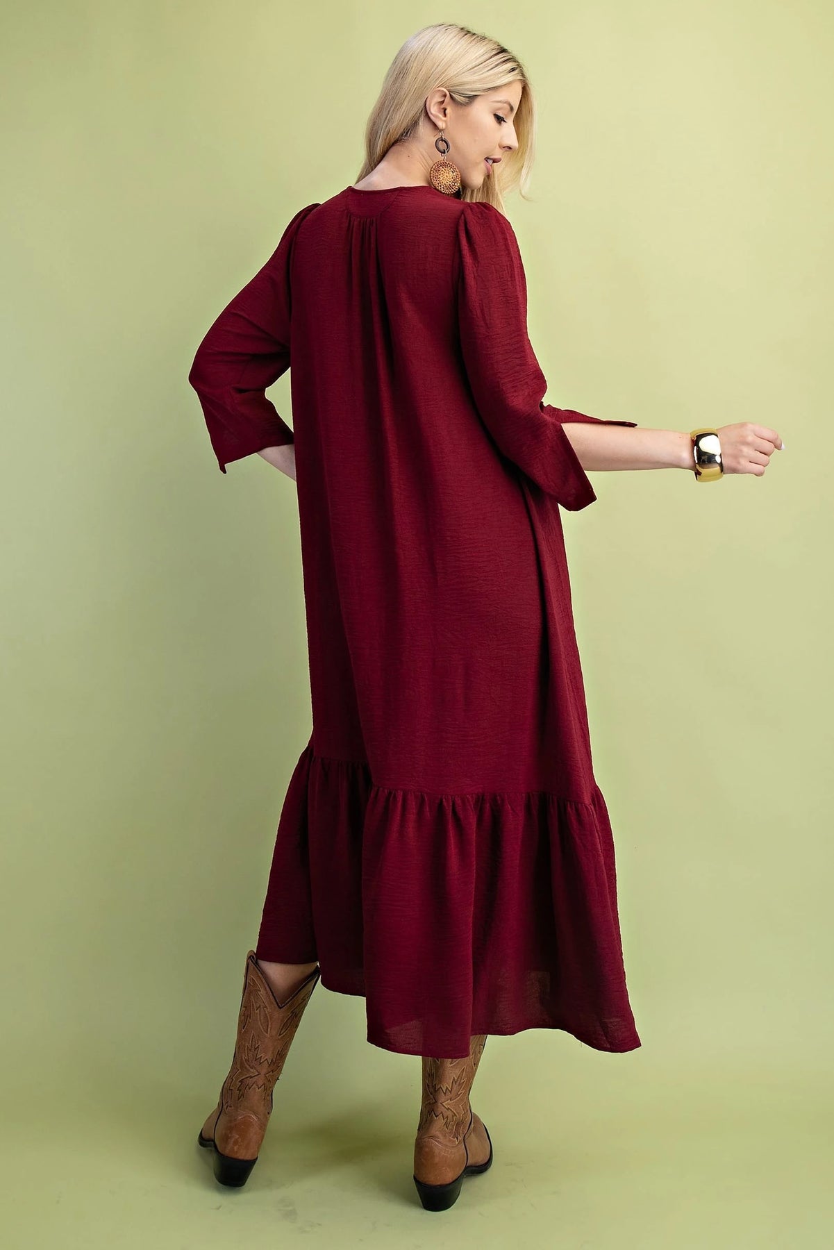 The First Love in Fall Dress features a flattering midi length and long sleeves, perfect for cooler seasons. Its notched sleeves add a refined, tailored detail that elevates the overall design. Pleated accents introduce subtle texture and movement, enhancing the dress’s sophisticated silhouette. Available in rich fall colors, this dress seamlessly blends seasonal warmth with timeless elegance.