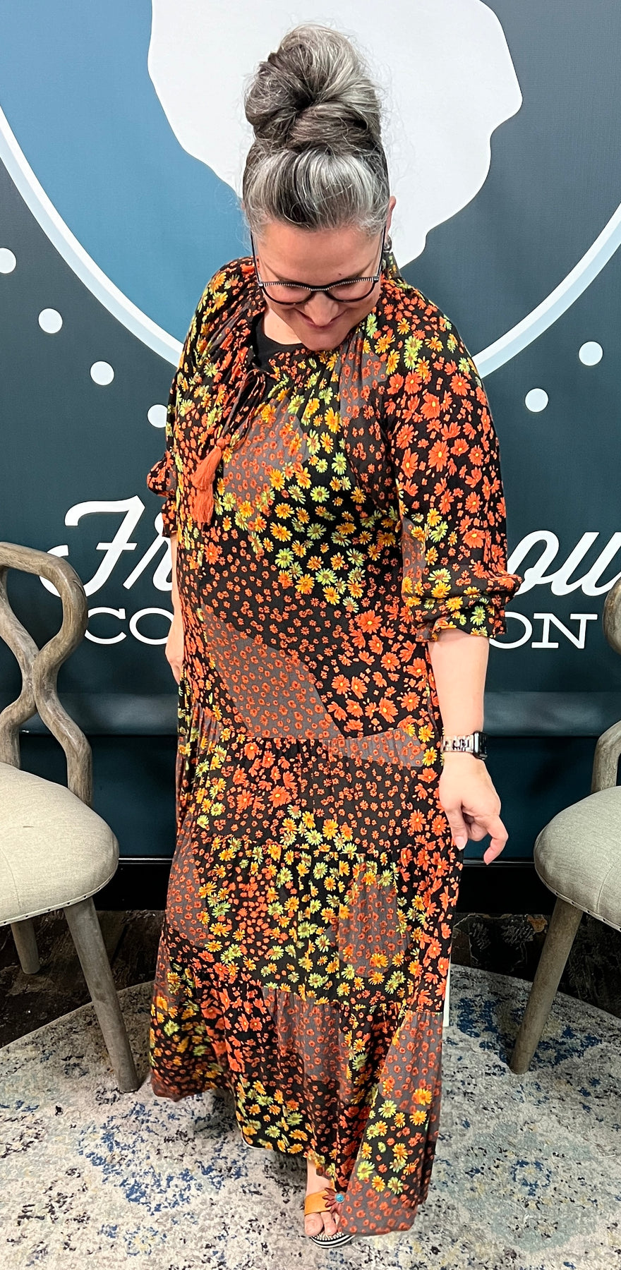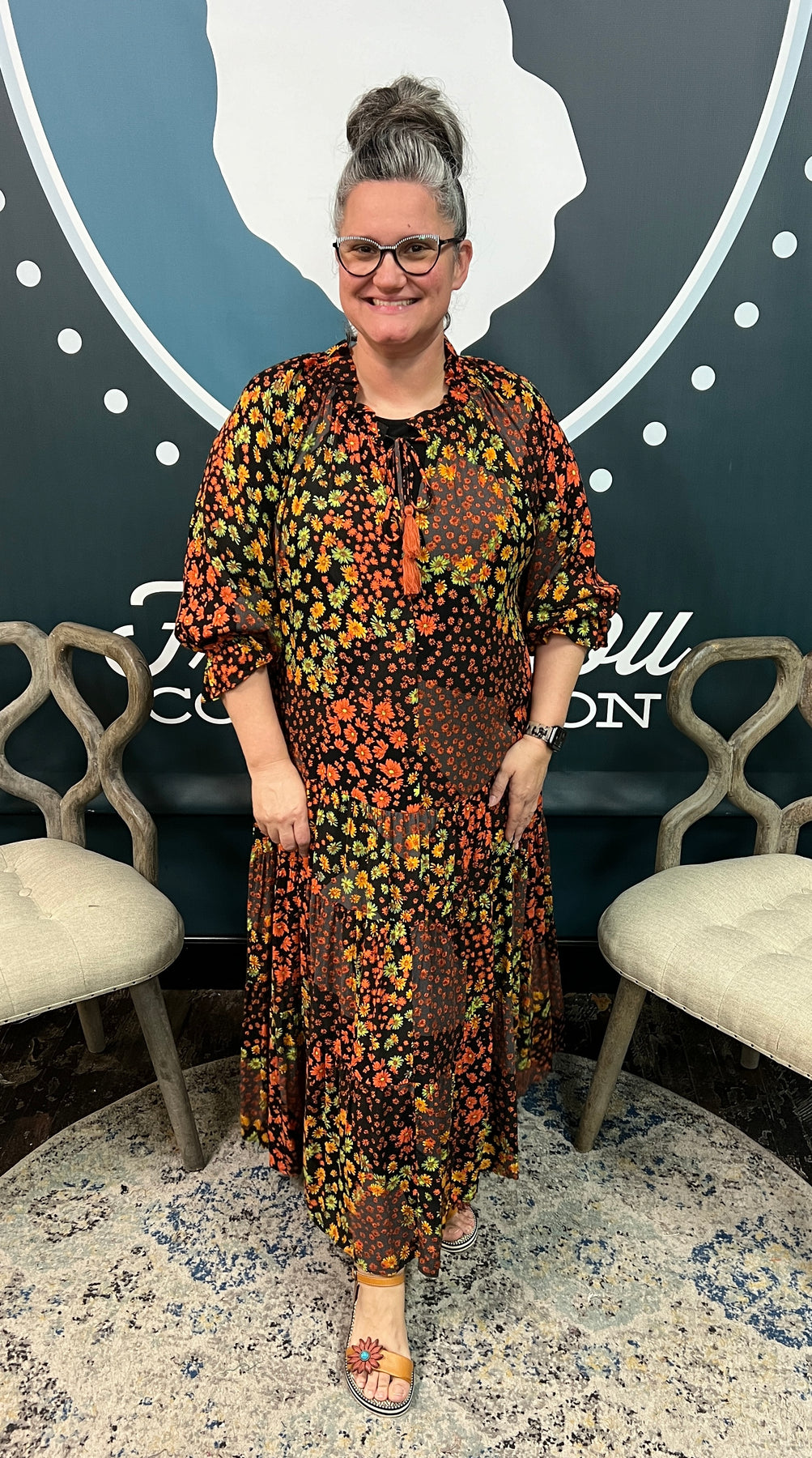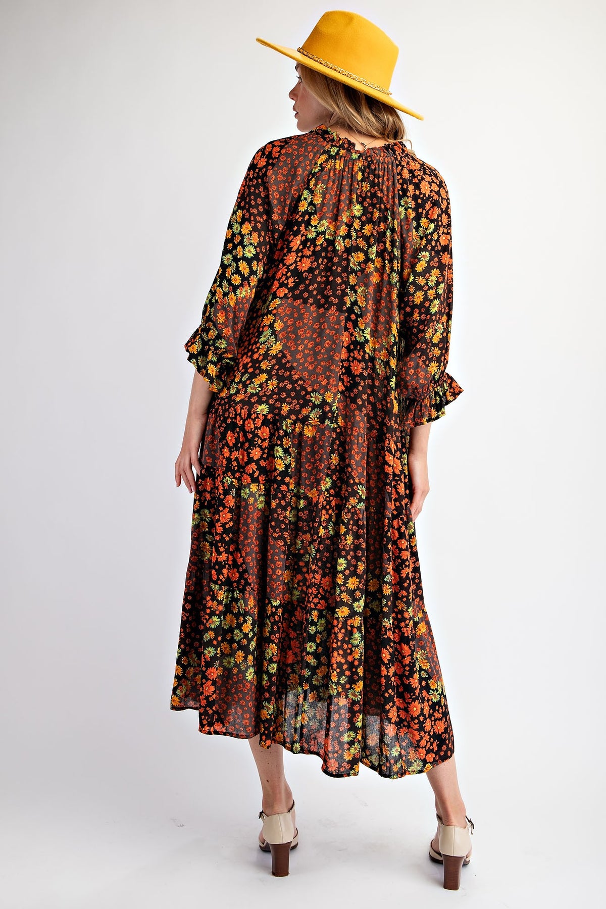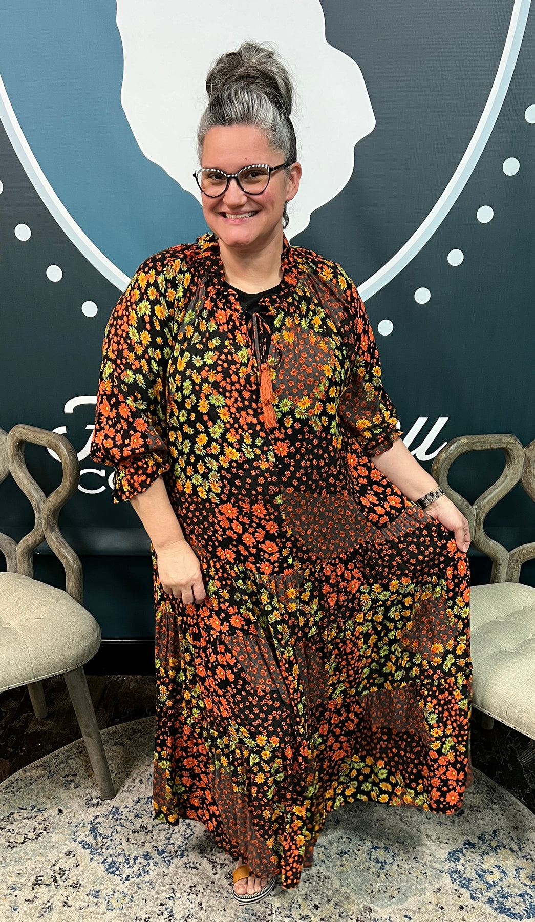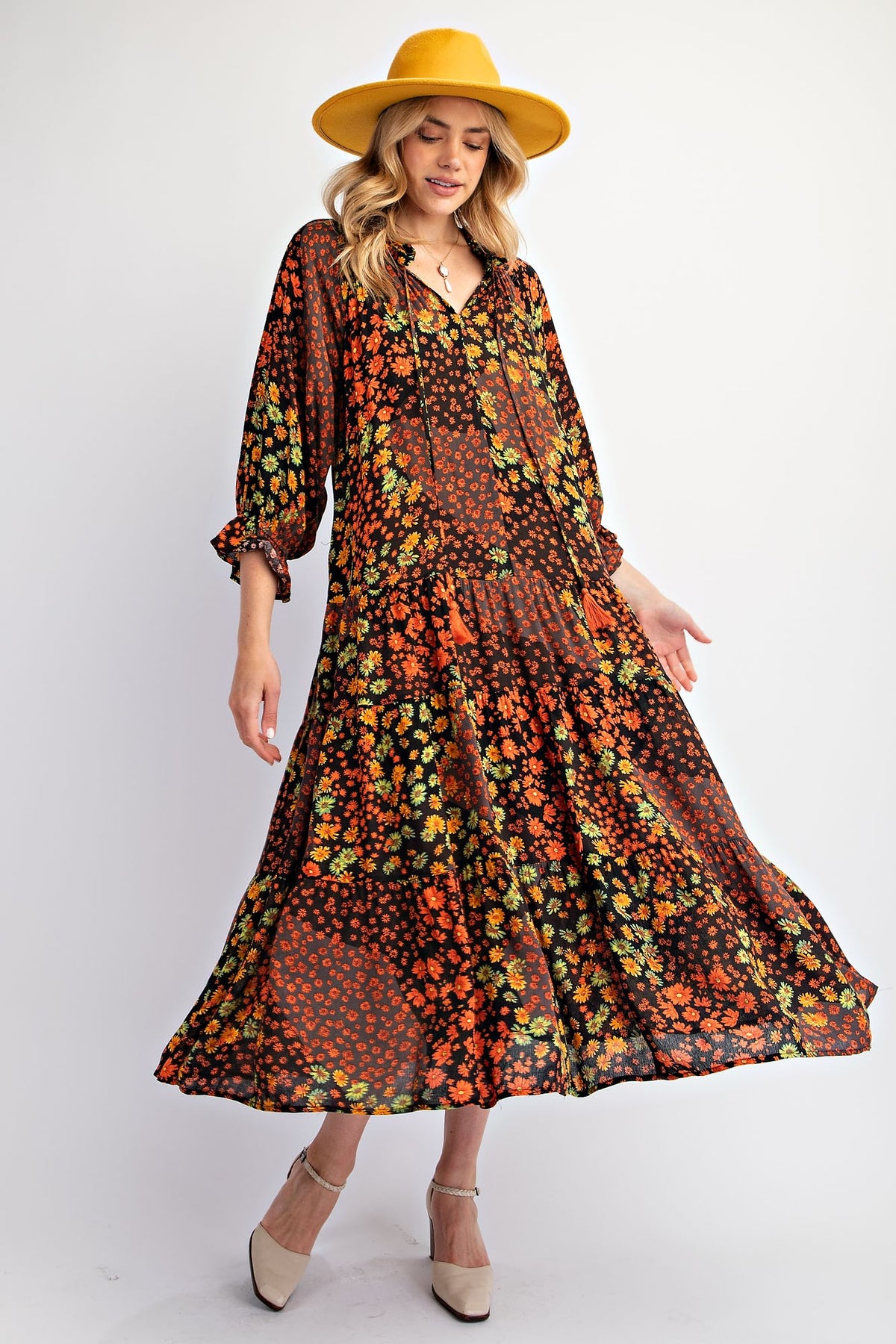 Awesome fit! Tiered skirting with elastic cuffs and neckline with tassel tie closure.