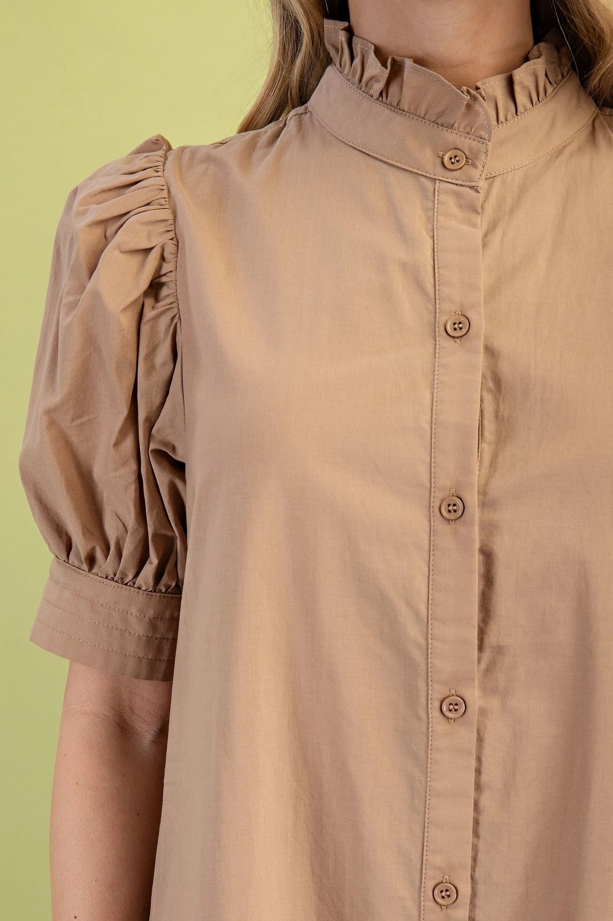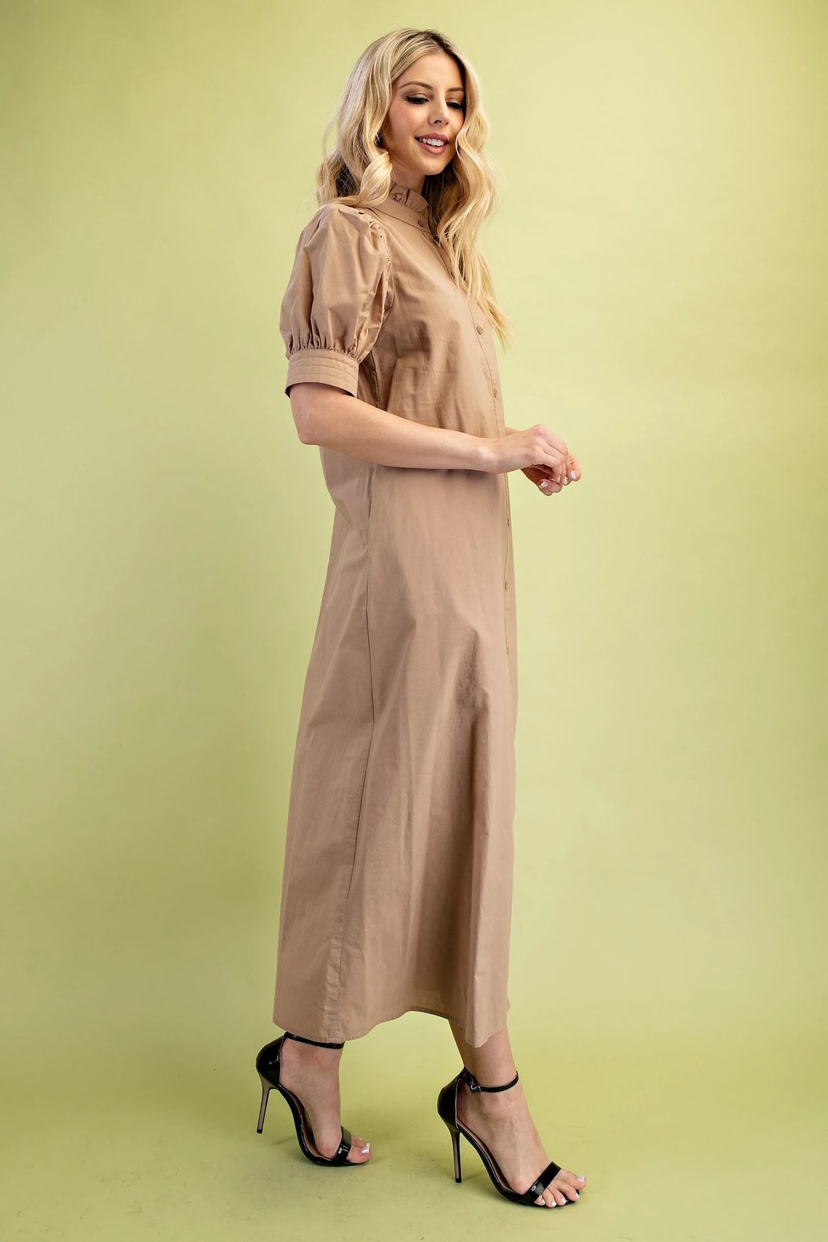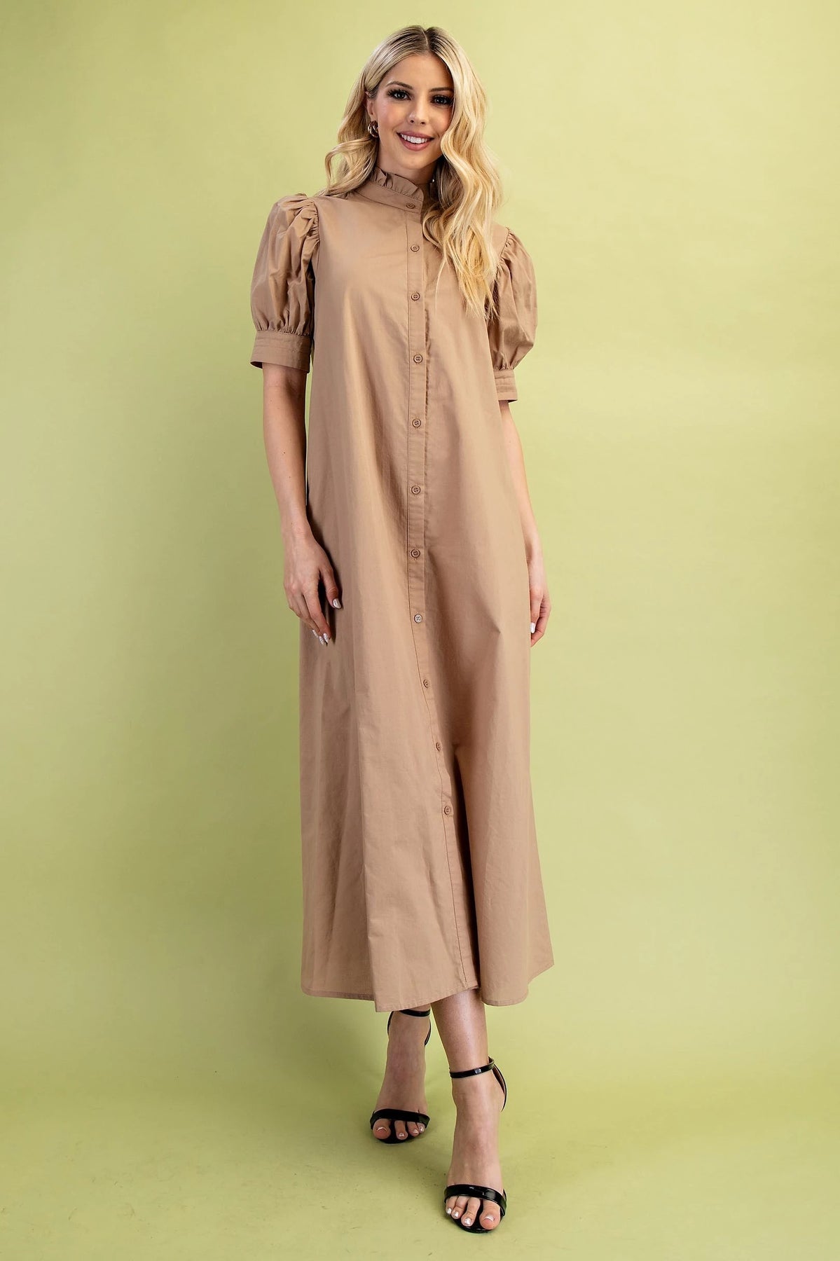 This dress features a soft latte color that offers a warm, versatile look perfect for any occasion. Its solid design is complemented by a classic button-down front, adding a touch of timeless elegance. The ruffled collar introduces a delicate, feminine detail that enhances the overall silhouette. Short sleeves provide comfort and ease, making this dress an ideal choice for both casual and refined settings.