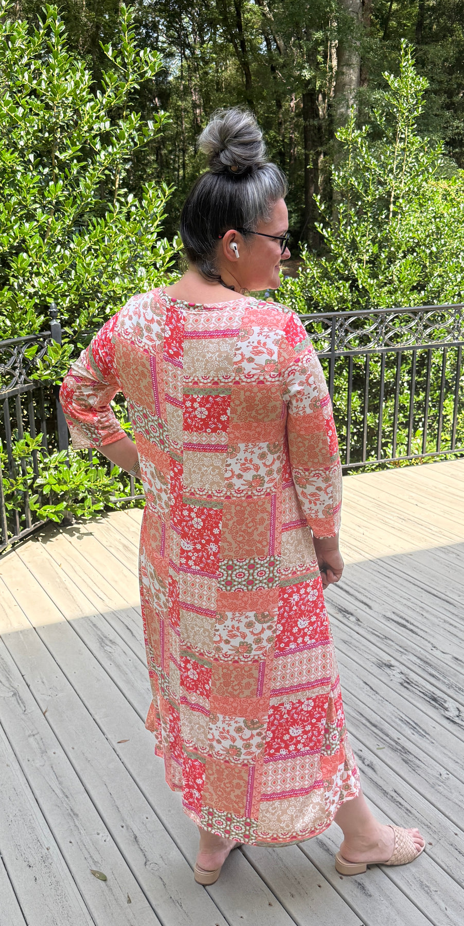 Modest neckline, 3/4 sleeve, pockets, swing style that looks great on all body shapes.