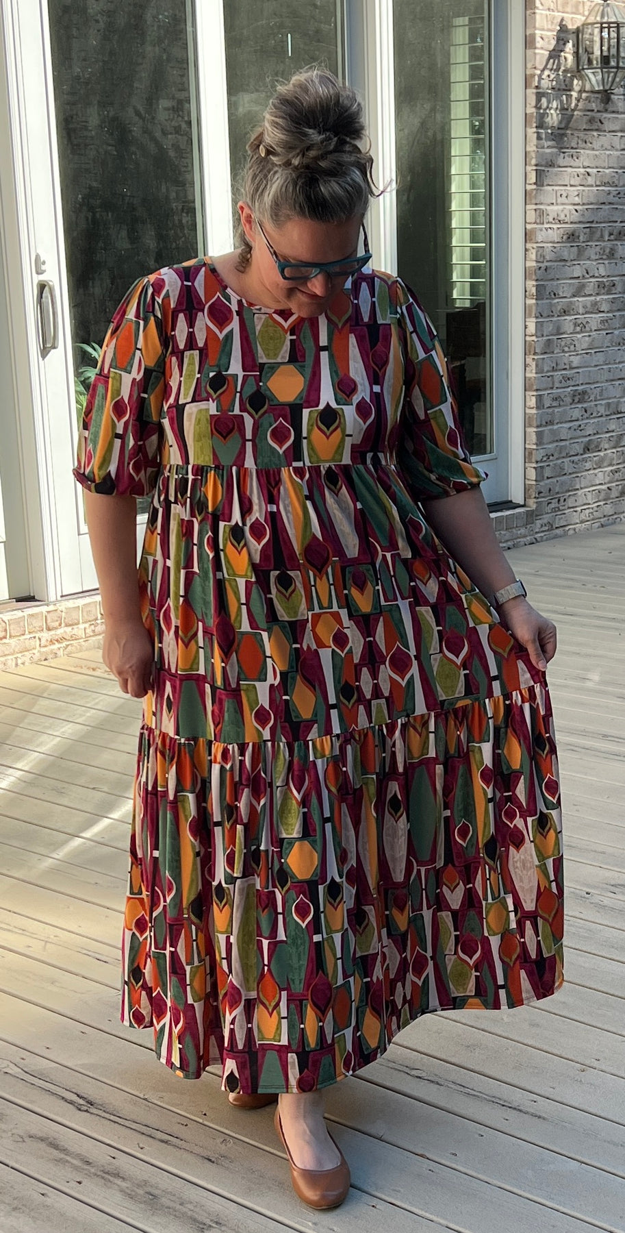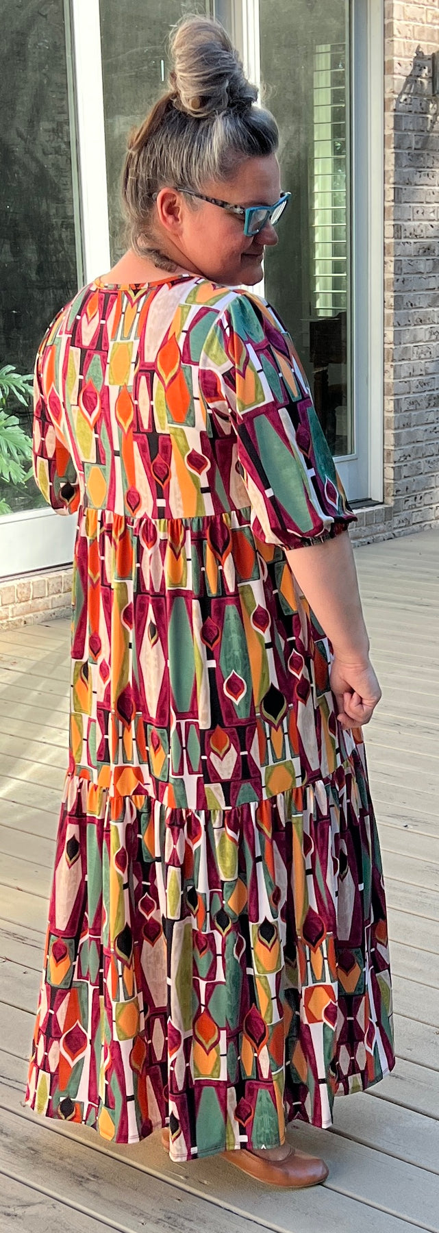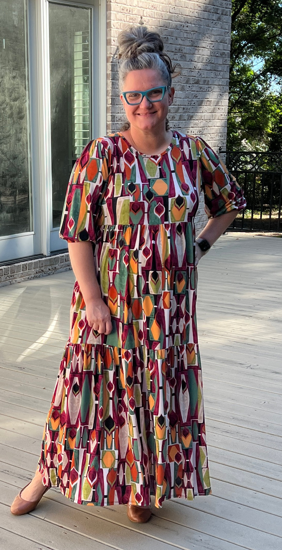 Meet Maggie, our custom design maxi dress! Made of stretchy polyester/spandex non wrinkle fabric is the perfect level of comfort. No layering required! Nice modest neckline, half sleeve with elastic cuff, tiered skirting and side pockets. Dress it up or down!