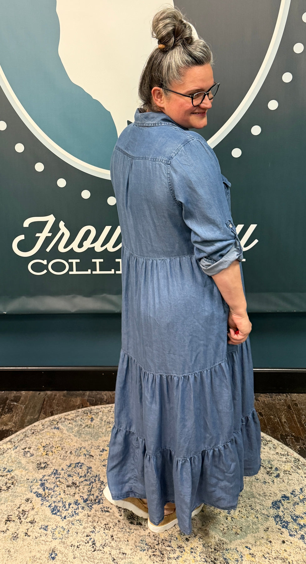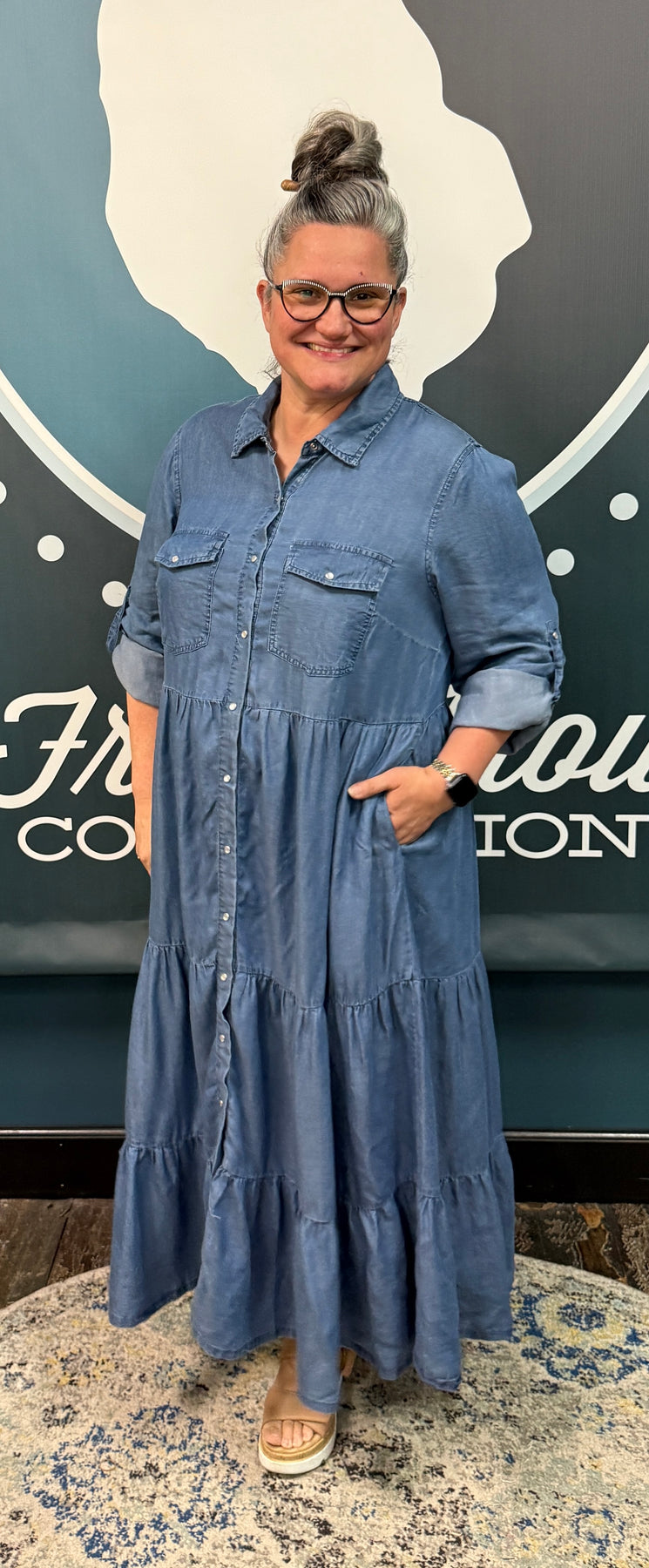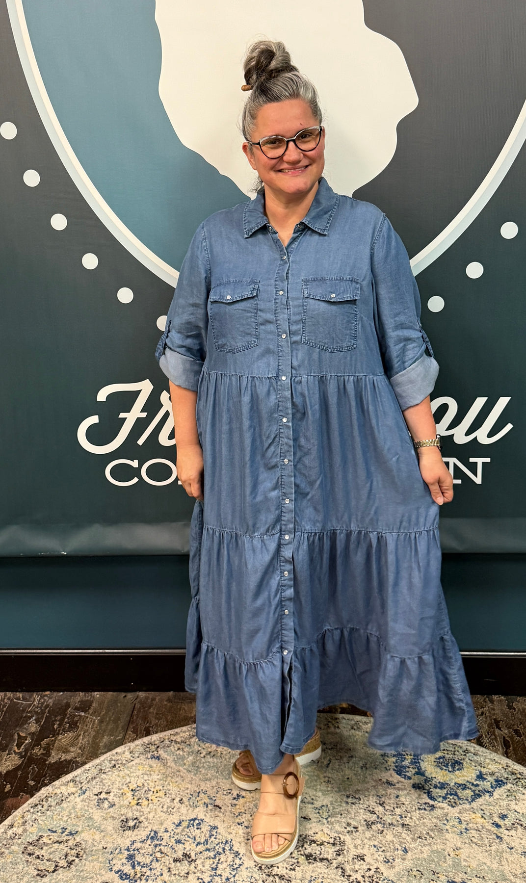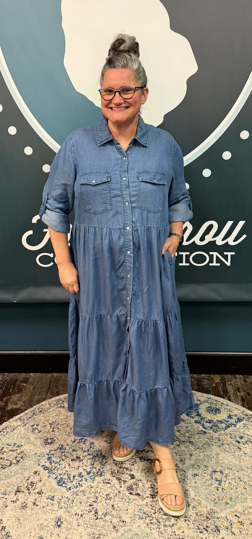 This lightweight chambray denim dress blends classic styling with feminine charm. It features a button-front bodice with chest pockets and a tiered skirt that adds movement and softness. The sleeves are adjustable, allowing you to wear them long or rolled up to a 3/4 length for versatile styling. Available in both dark and light denim, this dress offers a timeless look perfect for any season. Made from non-stretch fabric, it provides a structured fit while remaining breathable and comfortable.