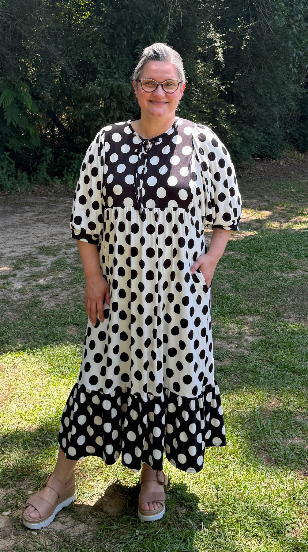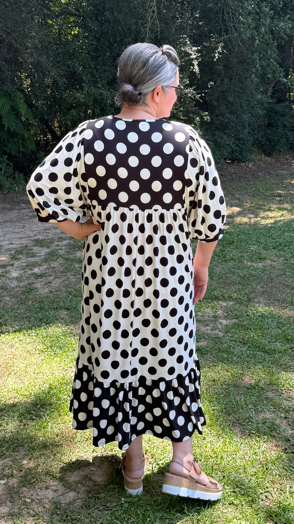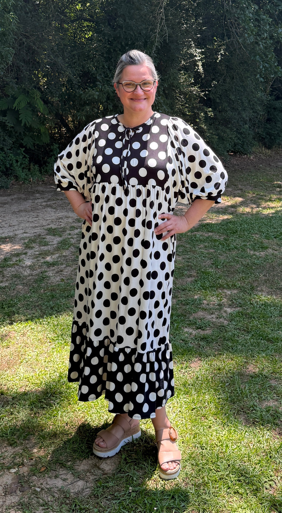This dress features a playful black-and-white polka dot pattern with a tiered design that alternates between inverted color schemes. It has a relaxed, loose fit with a gathered empire waistline that adds a soft silhouette. The dress includes elbow-length puff sleeves with a slight ruffle at the cuff, contributing to its whimsical charm. A bow-tied neckline adds a sweet, vintage-inspired detail at the top. The hem is finished with a wide ruffle that complements the overall flowy and feminine aesthetic.