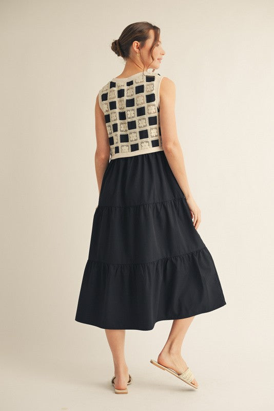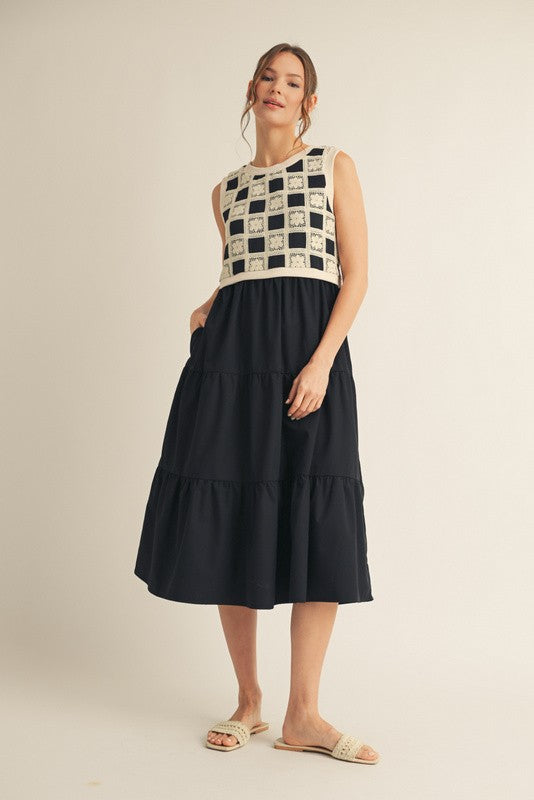 Mixed fabric sleeveless, tiered midi dress.