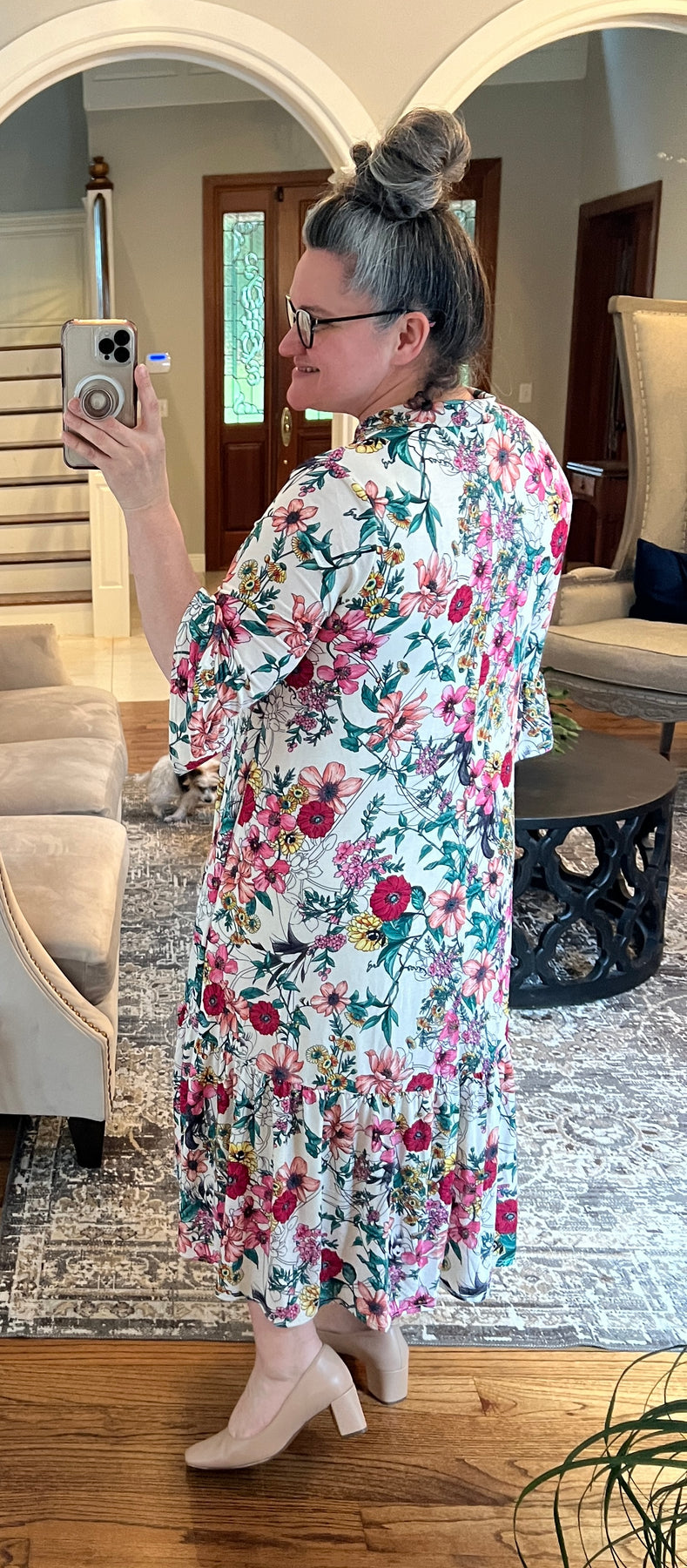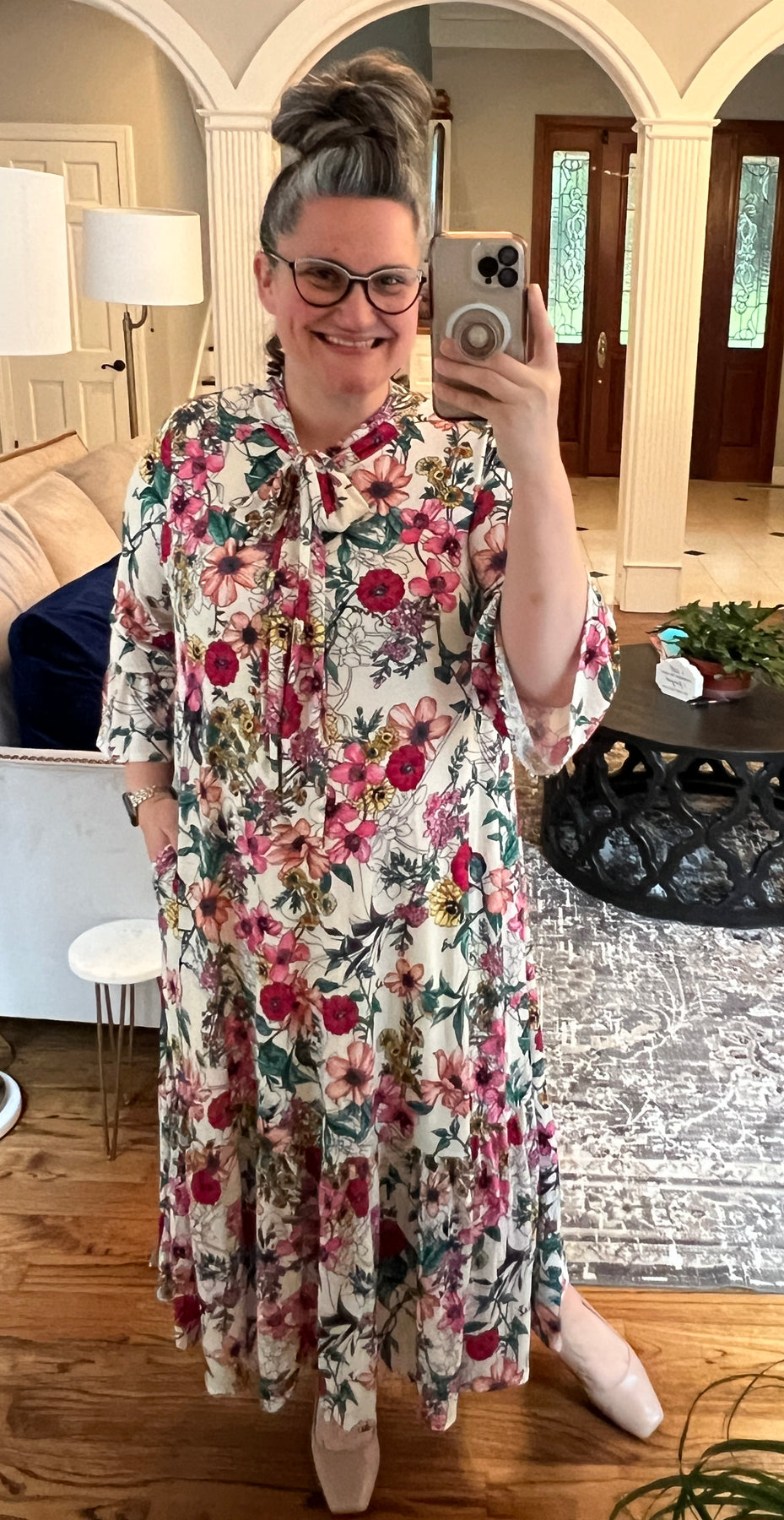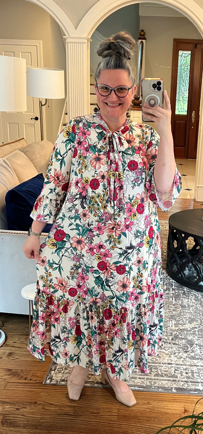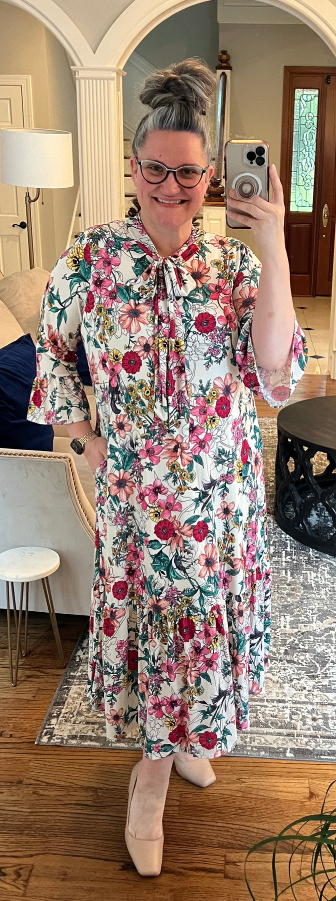 This is a cute style and perfect for any body type. Tie neckline, 3/4 sleeve e with flounce ruffle cuff. It has pockets and flounce ruffle hem. Loose fit and so comfortable! Fabric is simply amazing! Non wrinkle polyester/spandex blend. Beautiful floral print and lined to top of flounce
