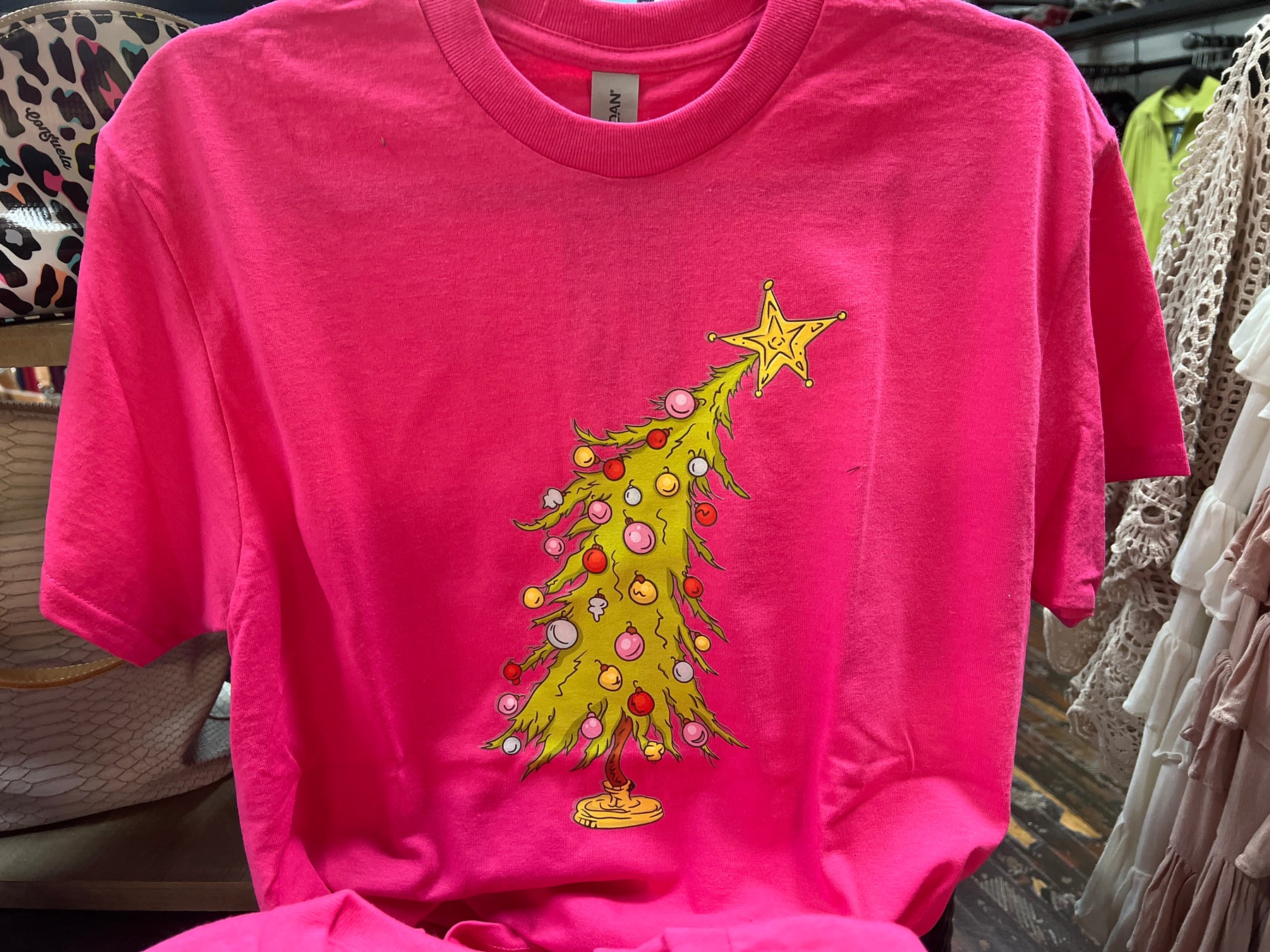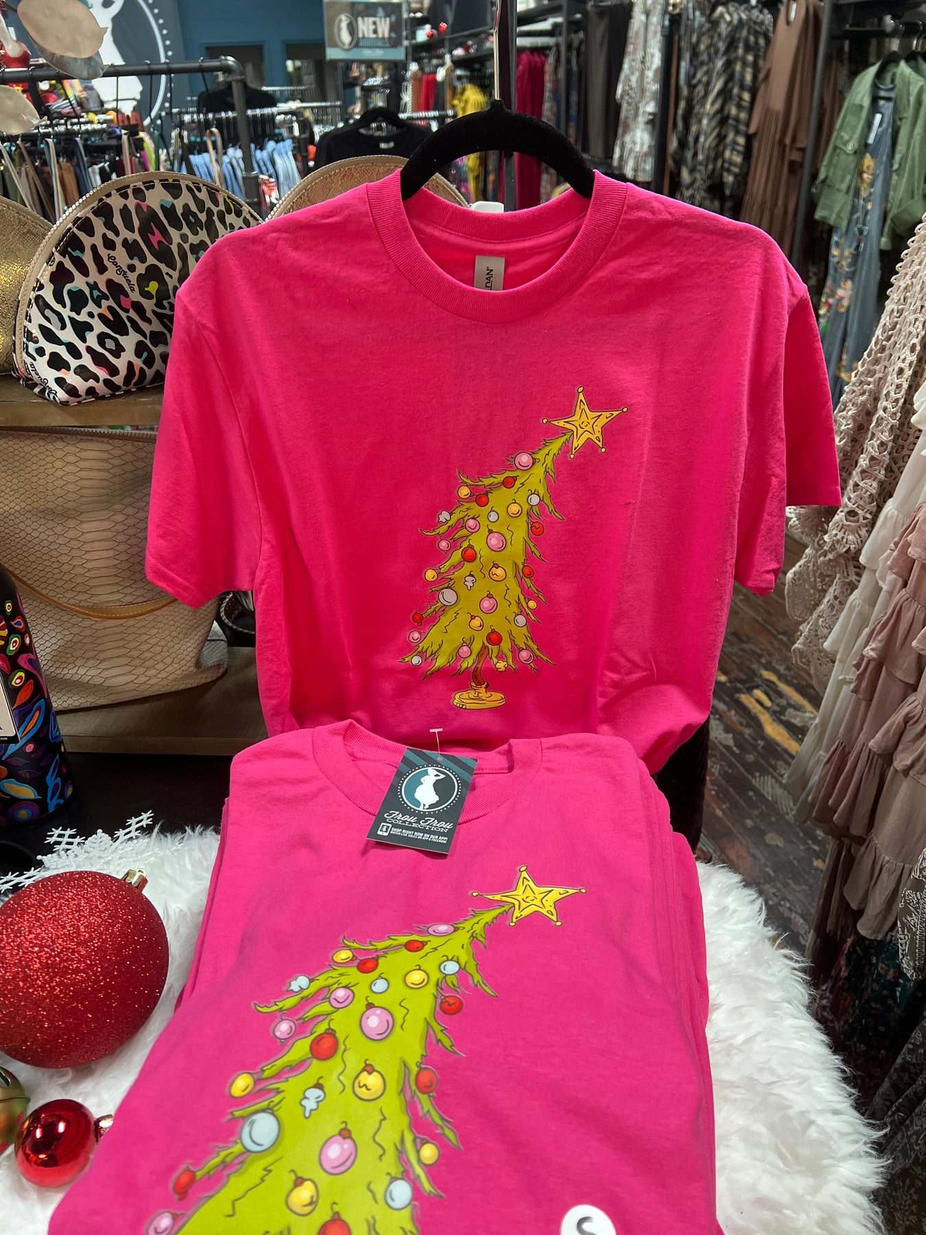 This pink t-shirt features a vibrant Grinch Christmas tree graphic on the front, blending festive cheer with a playful twist. Crafted from soft, breathable fabric, it ensures comfort throughout the holiday season. Its eye-catching design makes it a perfect choice for those looking to celebrate Christmas with a unique and stylish flair.