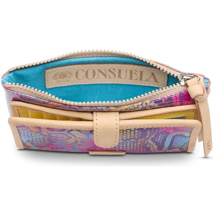 Our Slim Wallet carries cards and cash without weighing you down. Open the snap closure to reveal an ID window pocket, 12 card slots, and 4 slide pocket compartments in this versatile and colorful wallet.