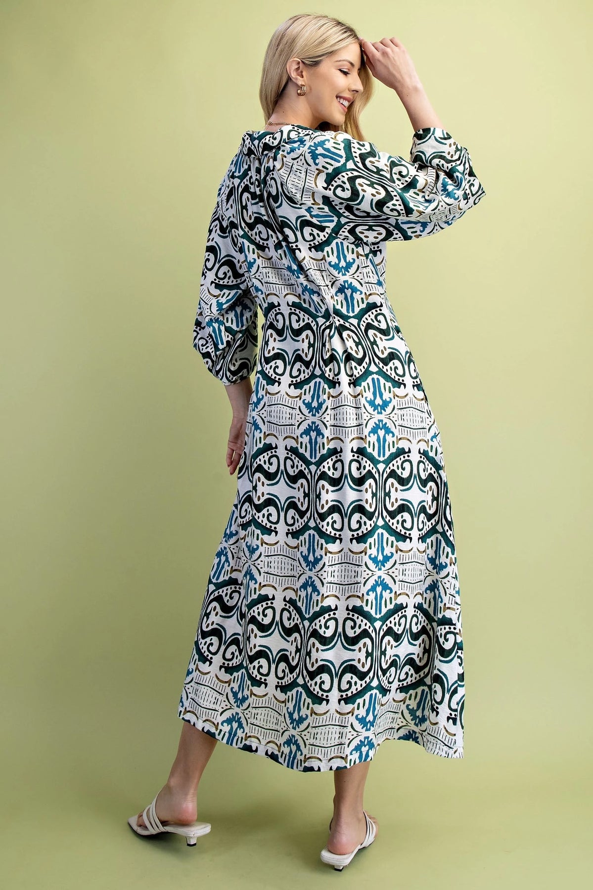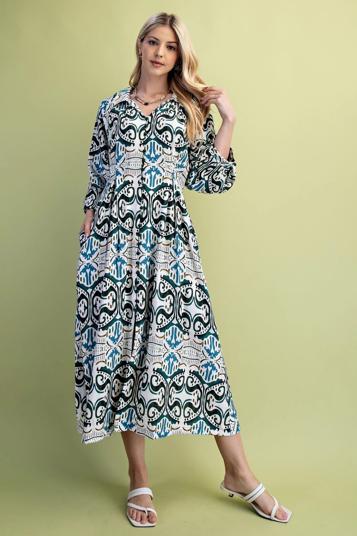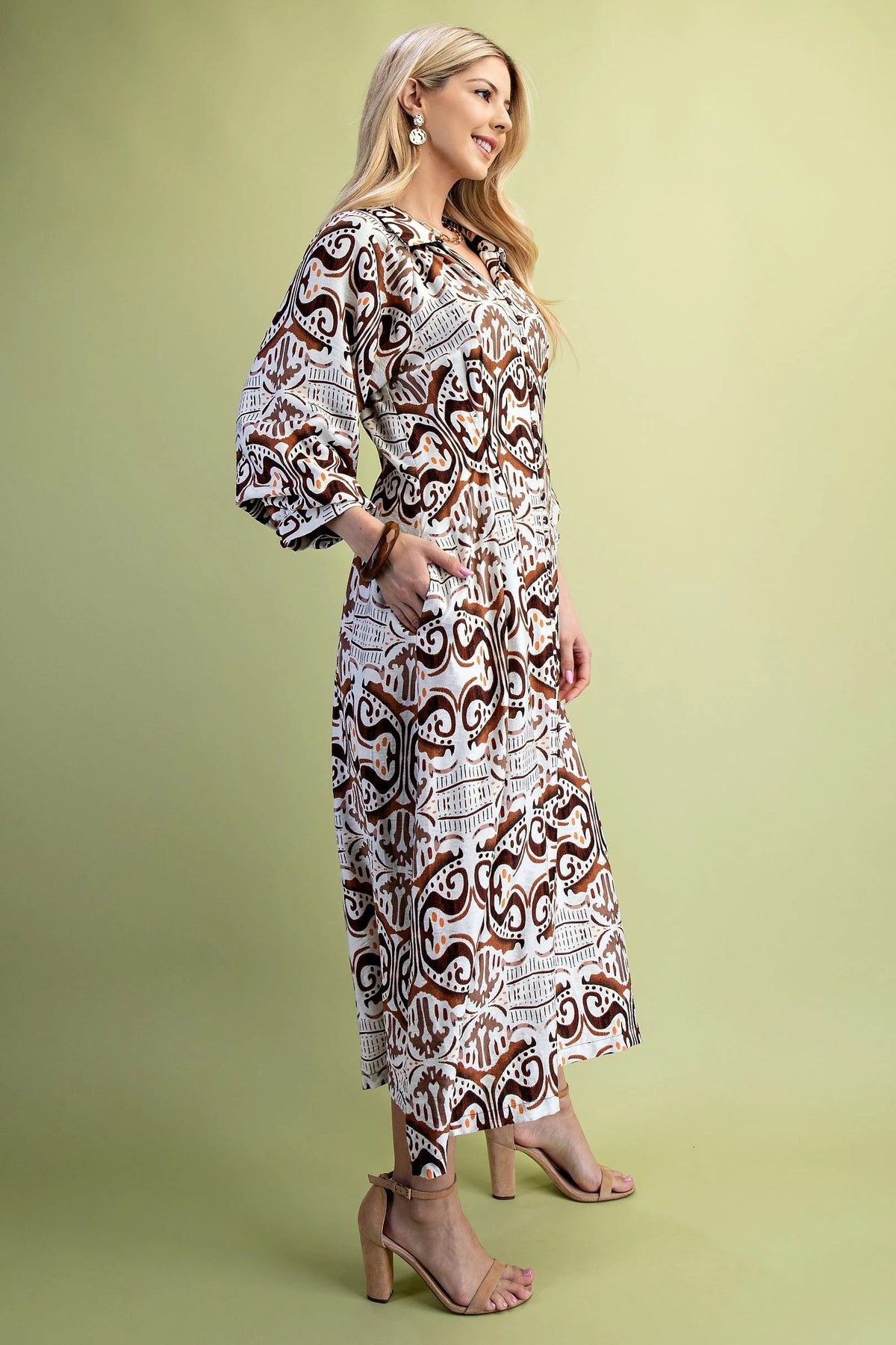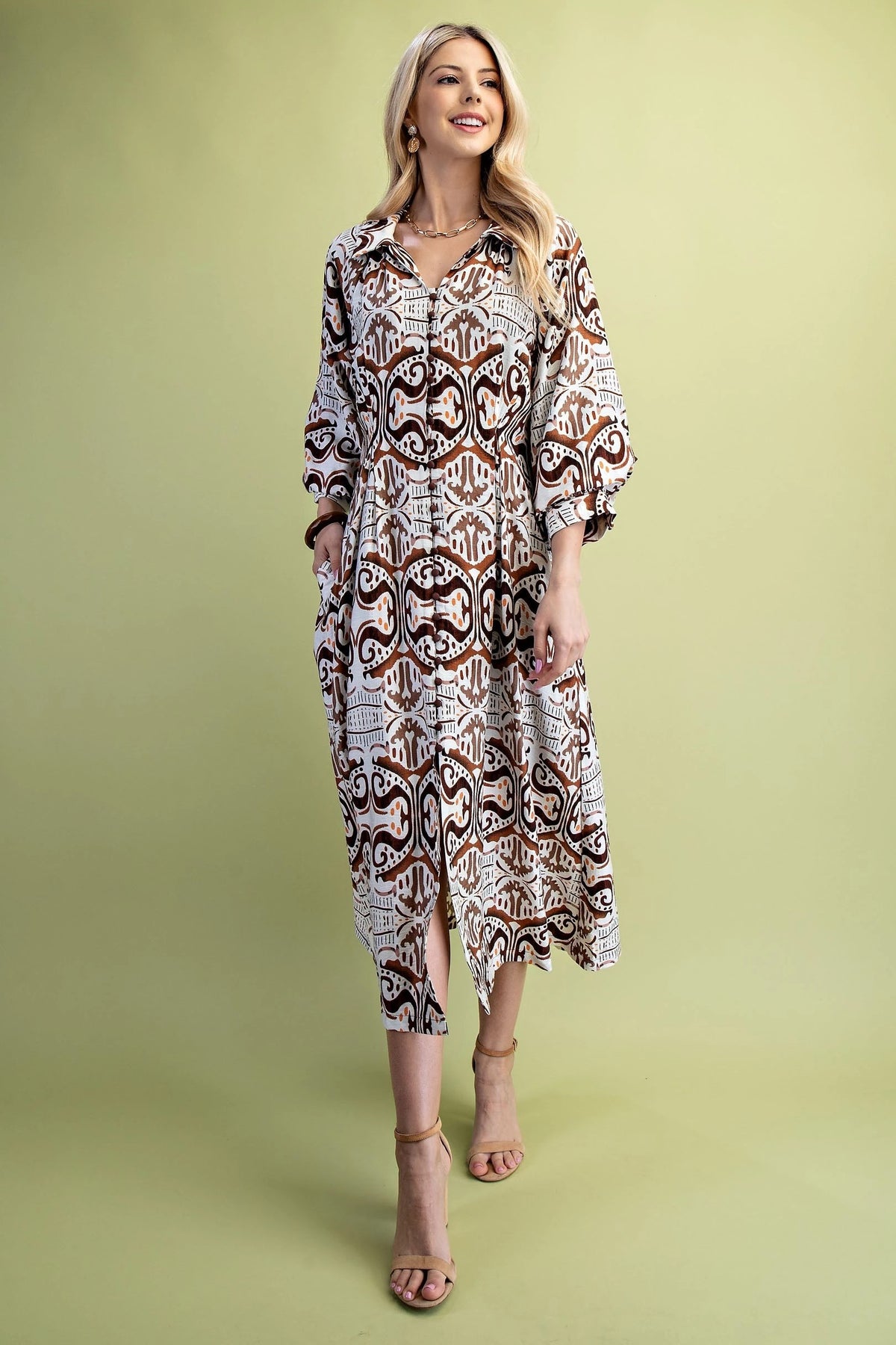 The Natalie Dress features a stylish printed fabric that adds visual interest and versatility. Its pleated waist creates a flattering, cinched silhouette that enhances the figure gracefully. Balloon sleeves provide a contemporary touch, balancing volume with elegance for a sophisticated look. This shirt dress effortlessly combines classic structure with modern details, making it suitable for both casual and refined occasions.