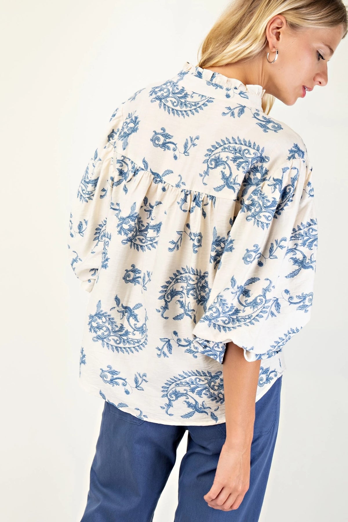 Chinoiseries Print Button Down Blouse with 3/4 Length Balloon Sleeves