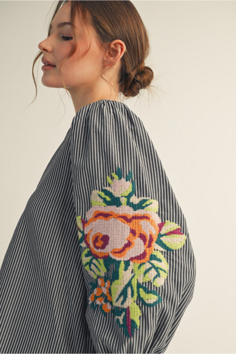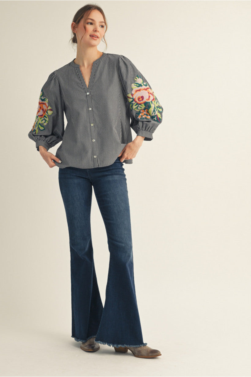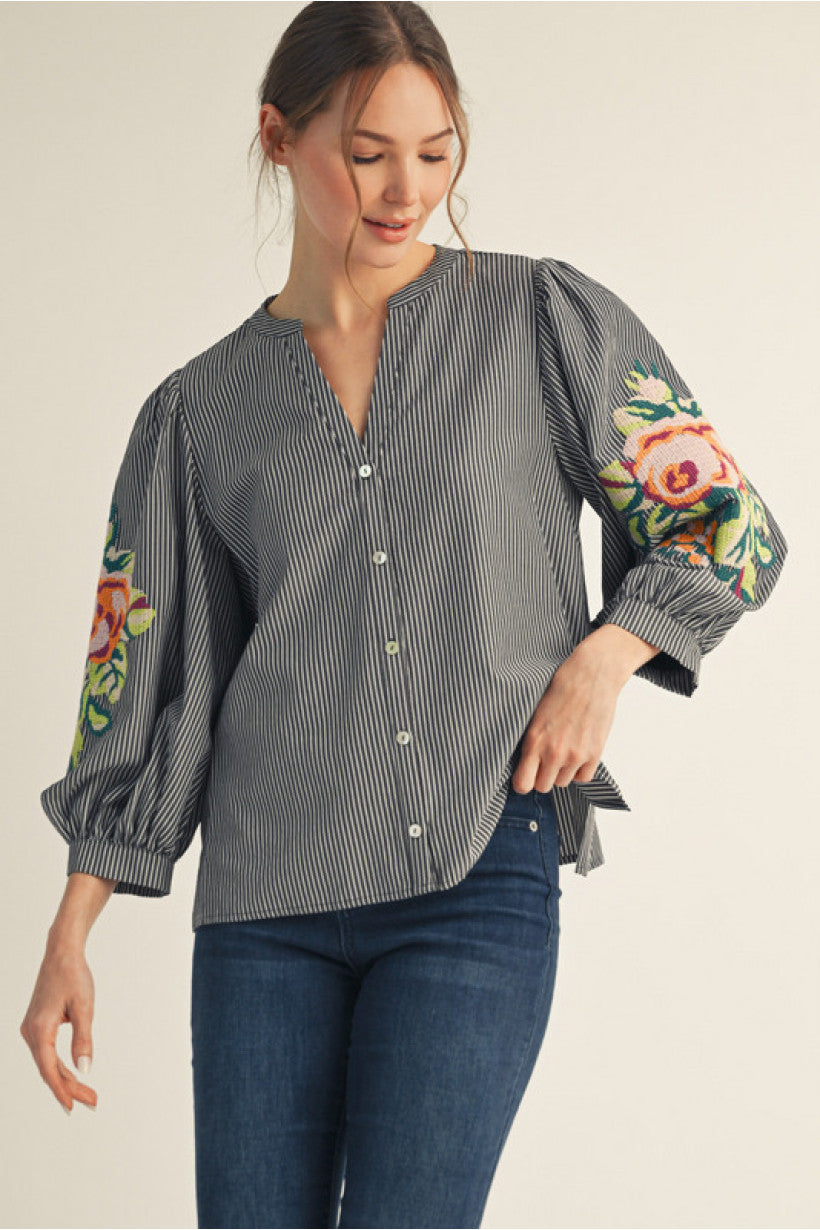 This button-down stripe top features elegant 3/4 length puff sleeves adorned with delicate embroidered flowers, adding a refined touch to your look. The slightly slit sides enhance comfort and provide a subtle, flattering silhouette. Crafted with attention to detail, it pairs effortlessly with both casual and dressier outfits. Perfect for those seeking a blend of classic style and intricate craftsmanship.