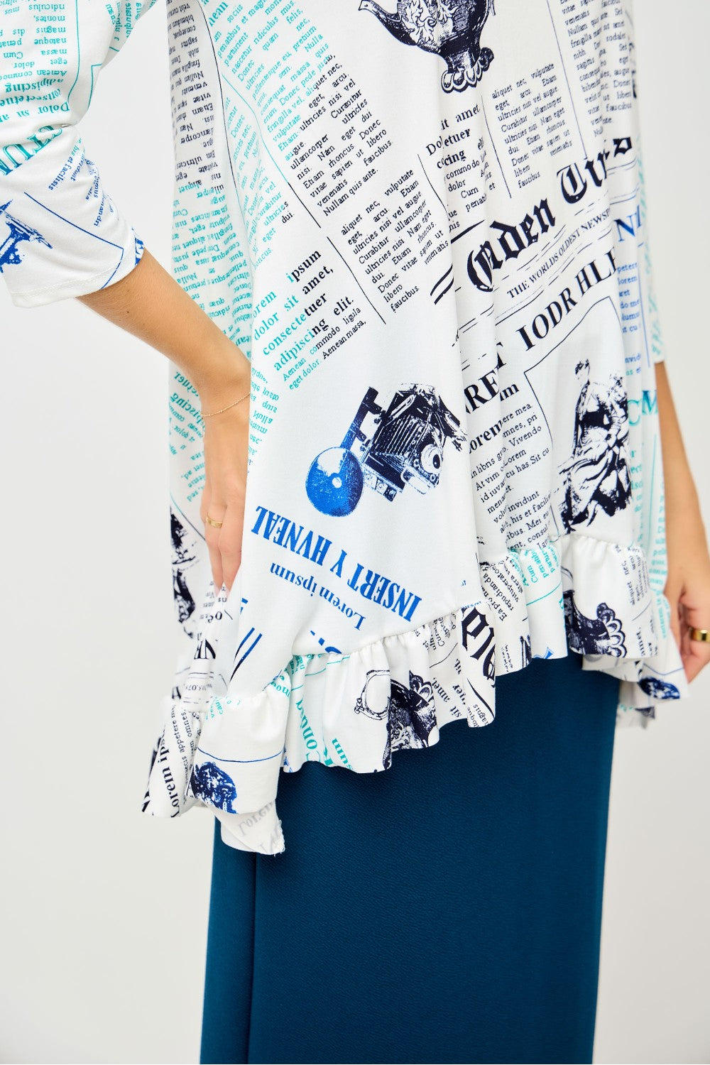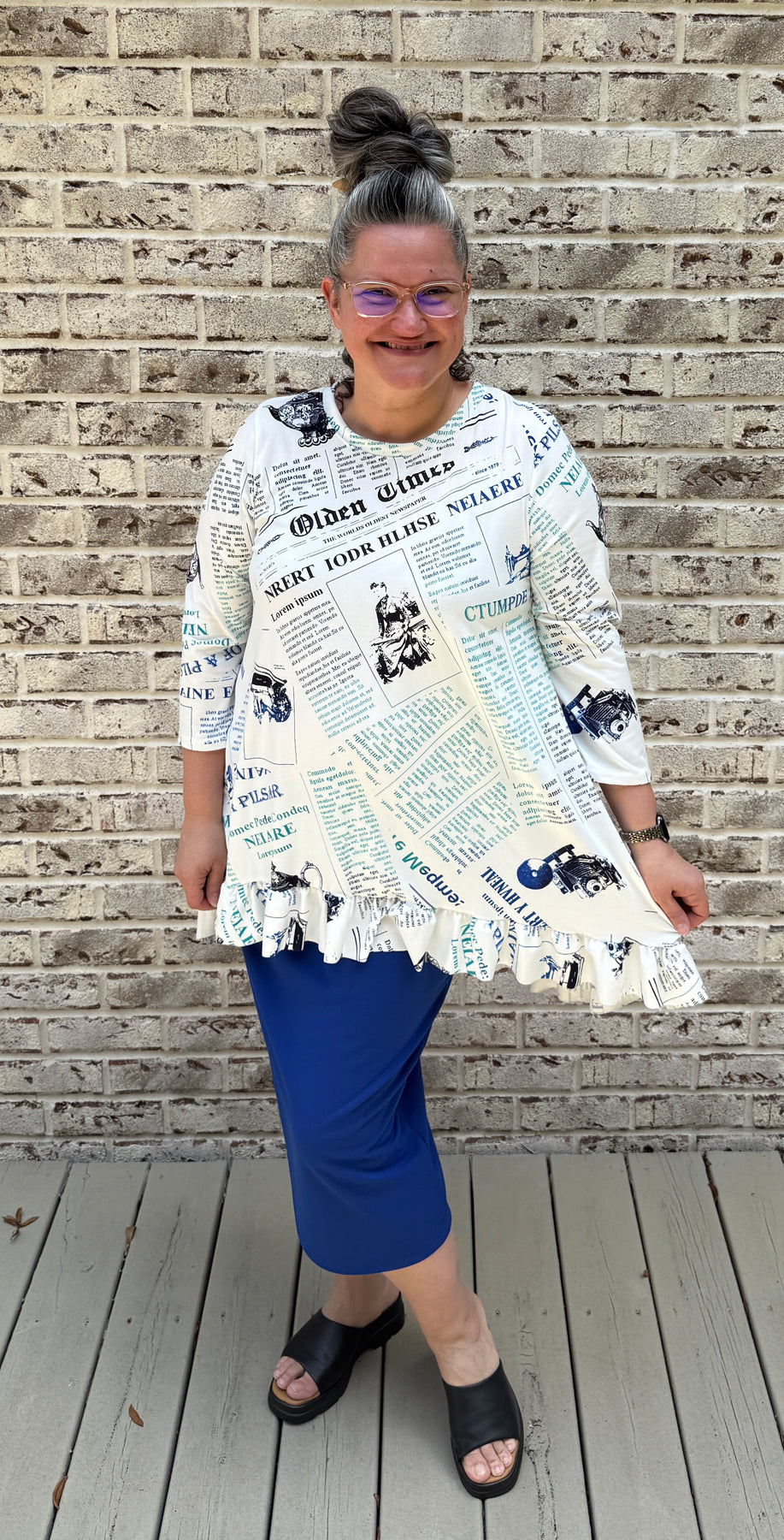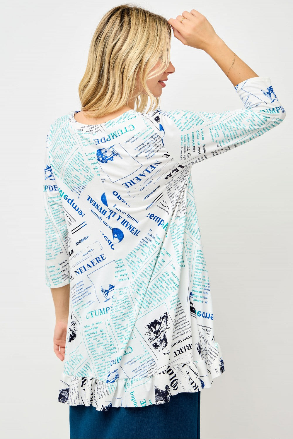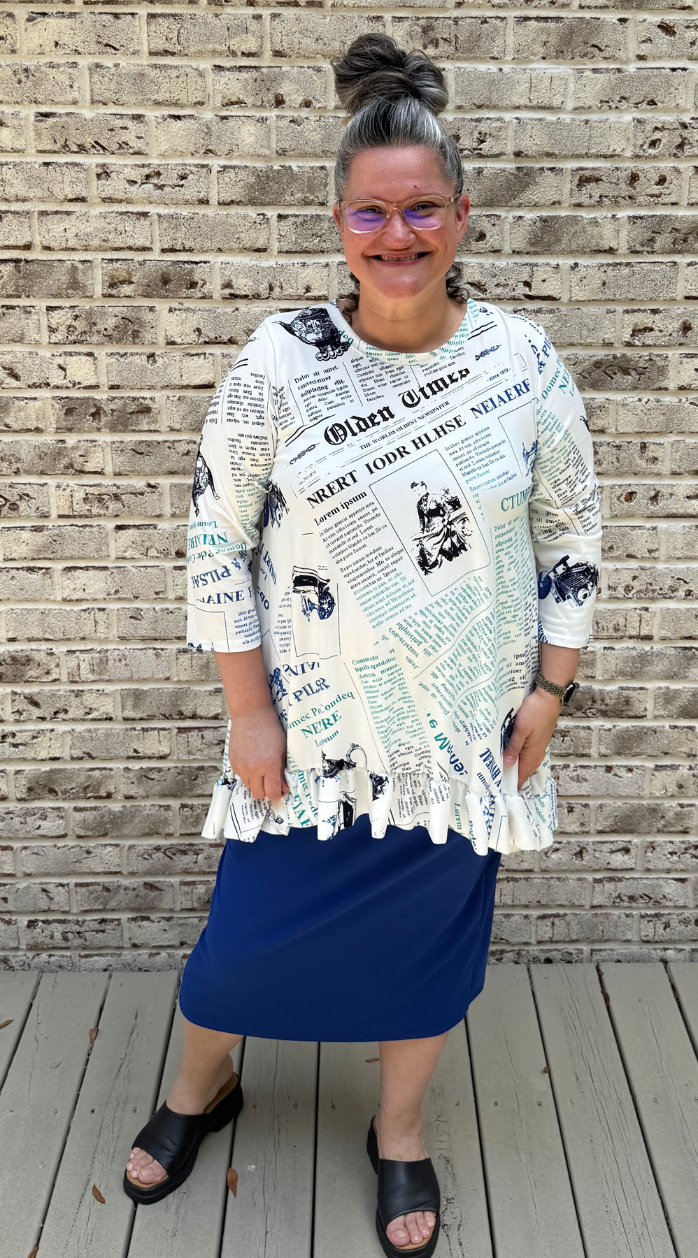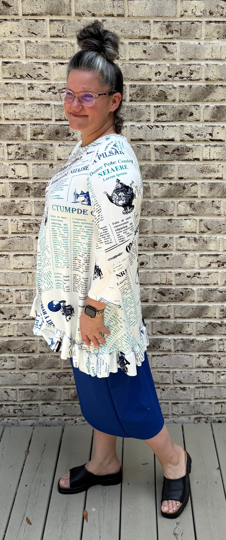 Black/Royal Newsprint print with a dainty ruffle detail in the hi/lo hem. 3/4 sleeves and nice modest neckline. Non wrinkle fabric and cool to the touch.