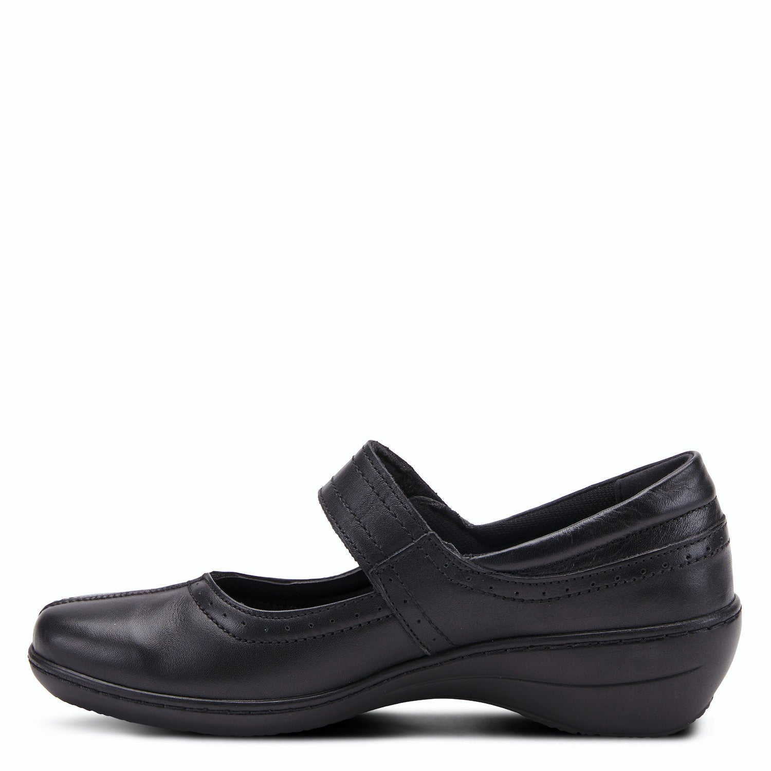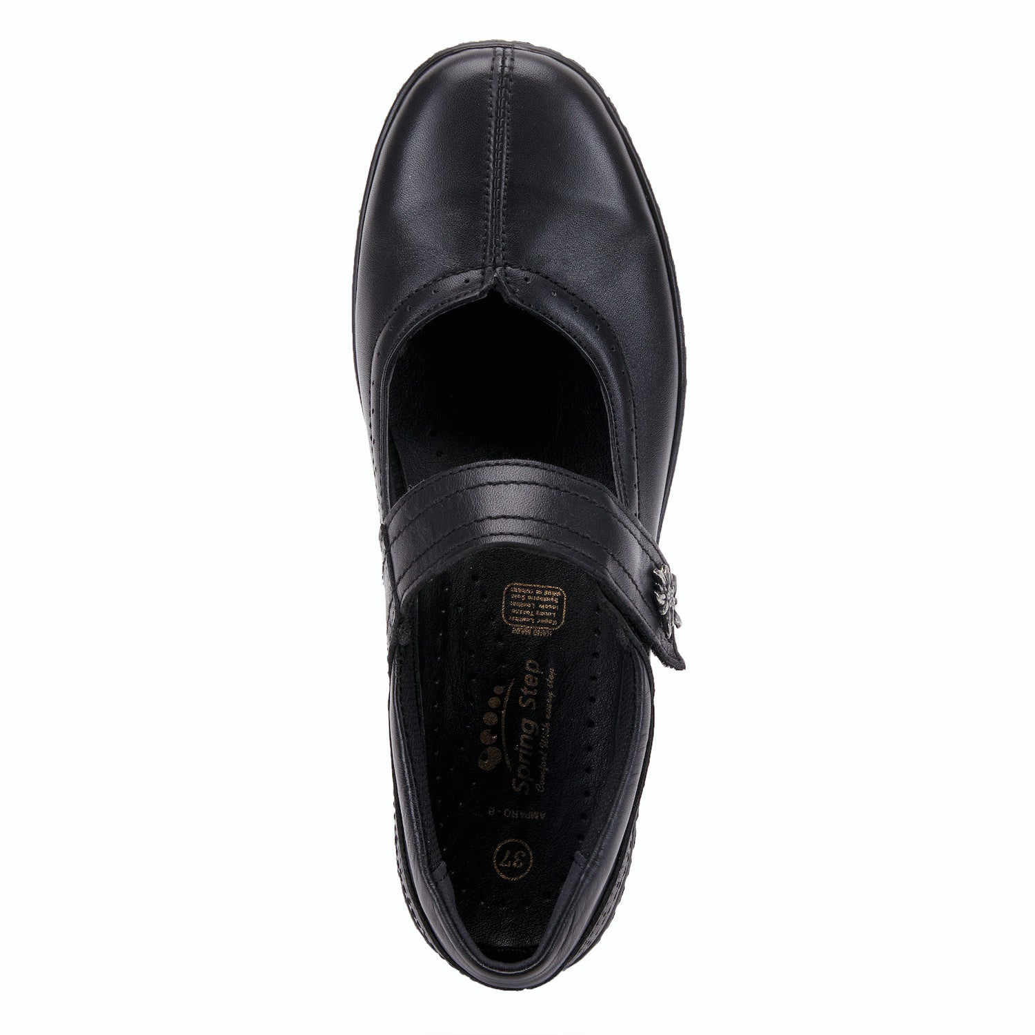 Smooth leather Mary-Jane with decorative floral button and padded heel collar.