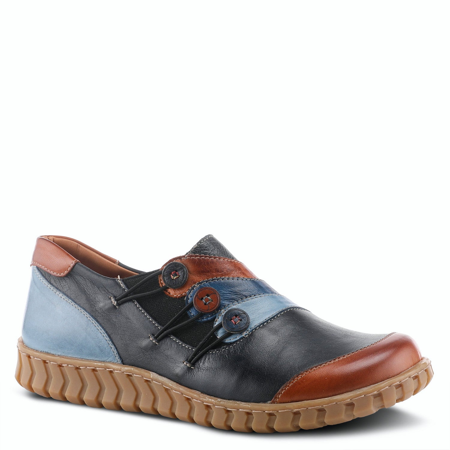 Premium, high-quality leather shoe featuring striking color blocking and unique colorful buttons on a flexible comfort sole.