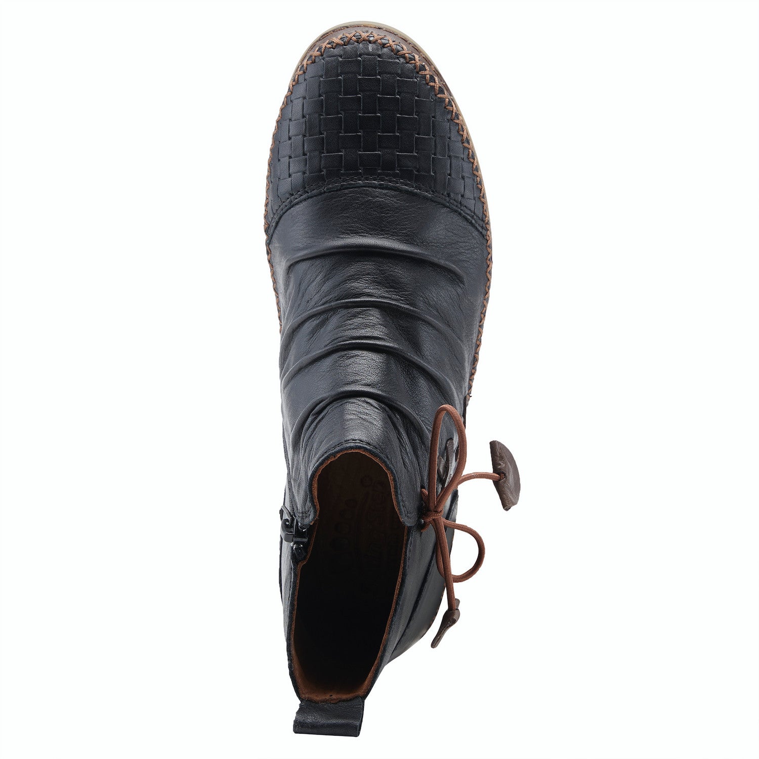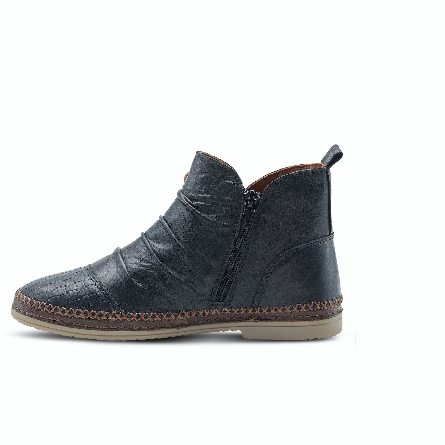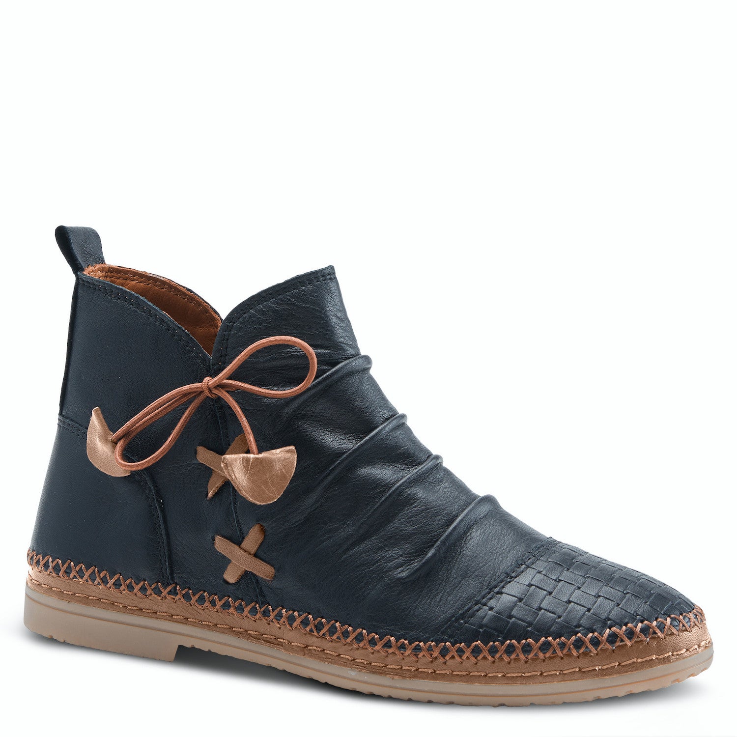 A butter soft leather bootie designed with a basket weave cap toe and decorative elastic tie detail on one of our most popular, comfortable outsoles.
