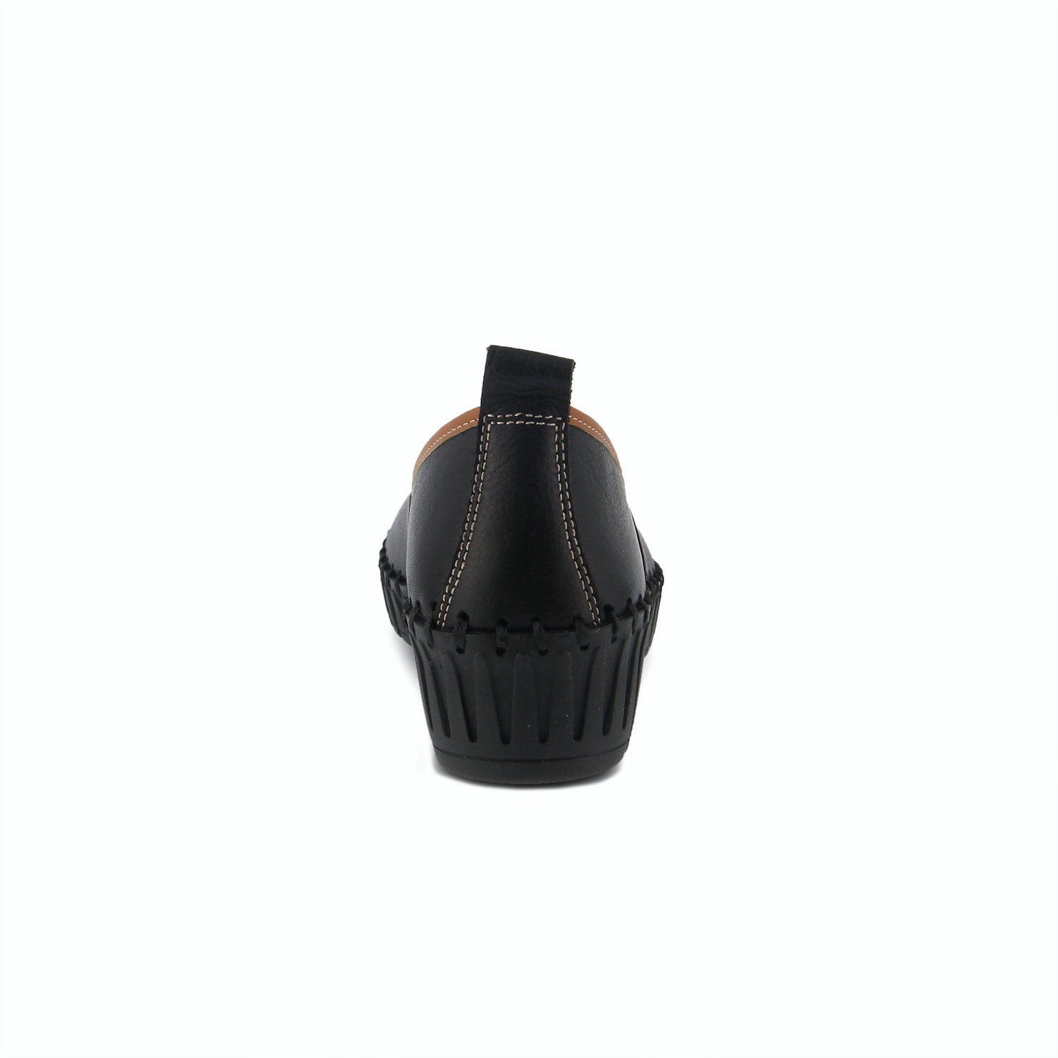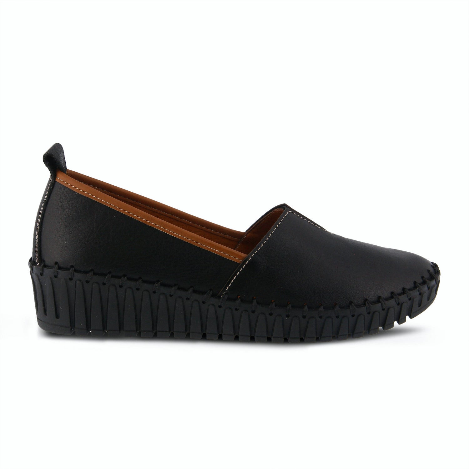 Dainty and trendy premium leather slip-on loafer featuring an incorporated stretch elastic v-cut vamp and a contrast stitching design all on a sculpted rubber wedge outsole.