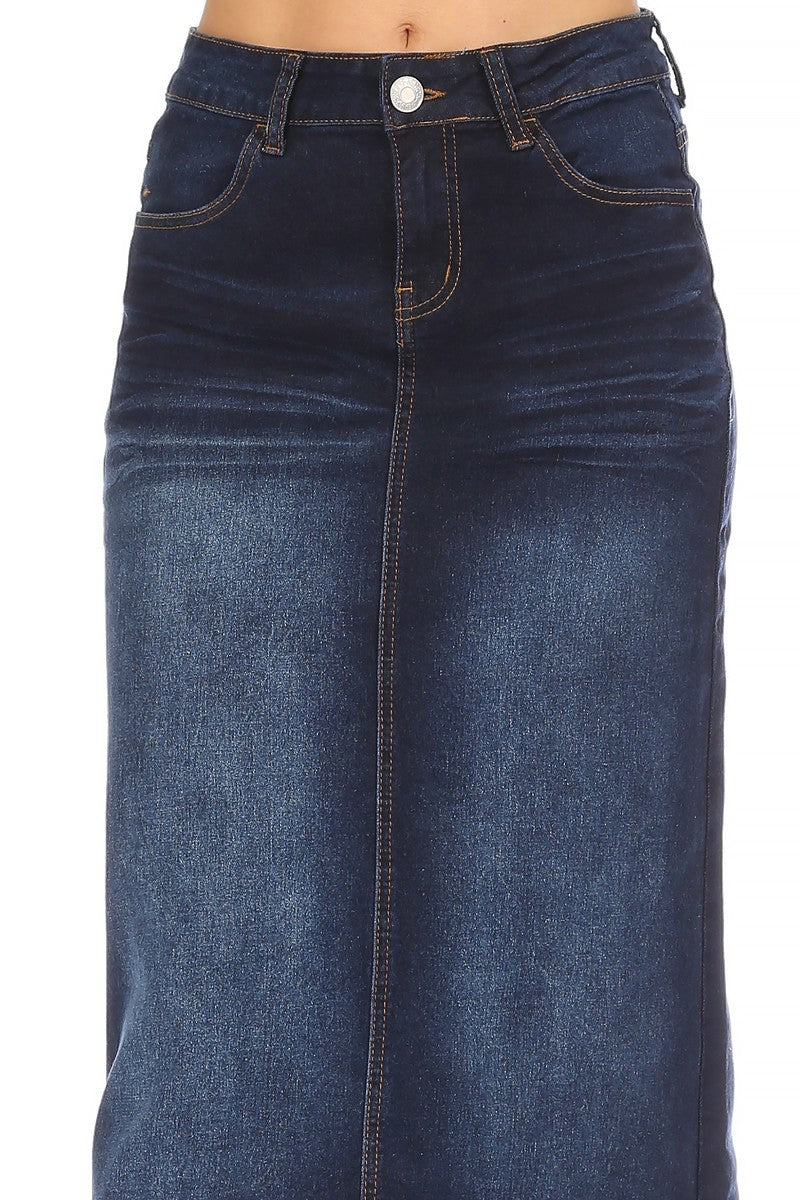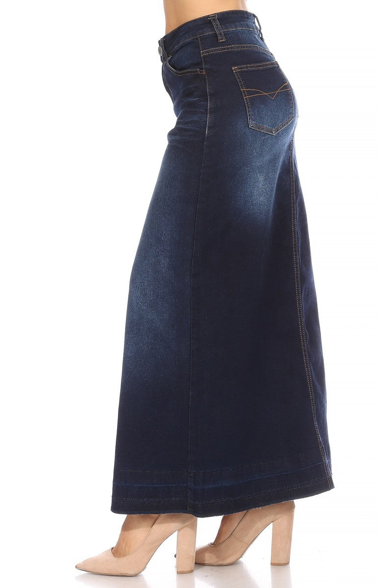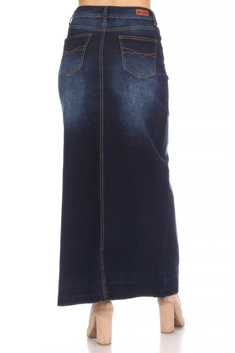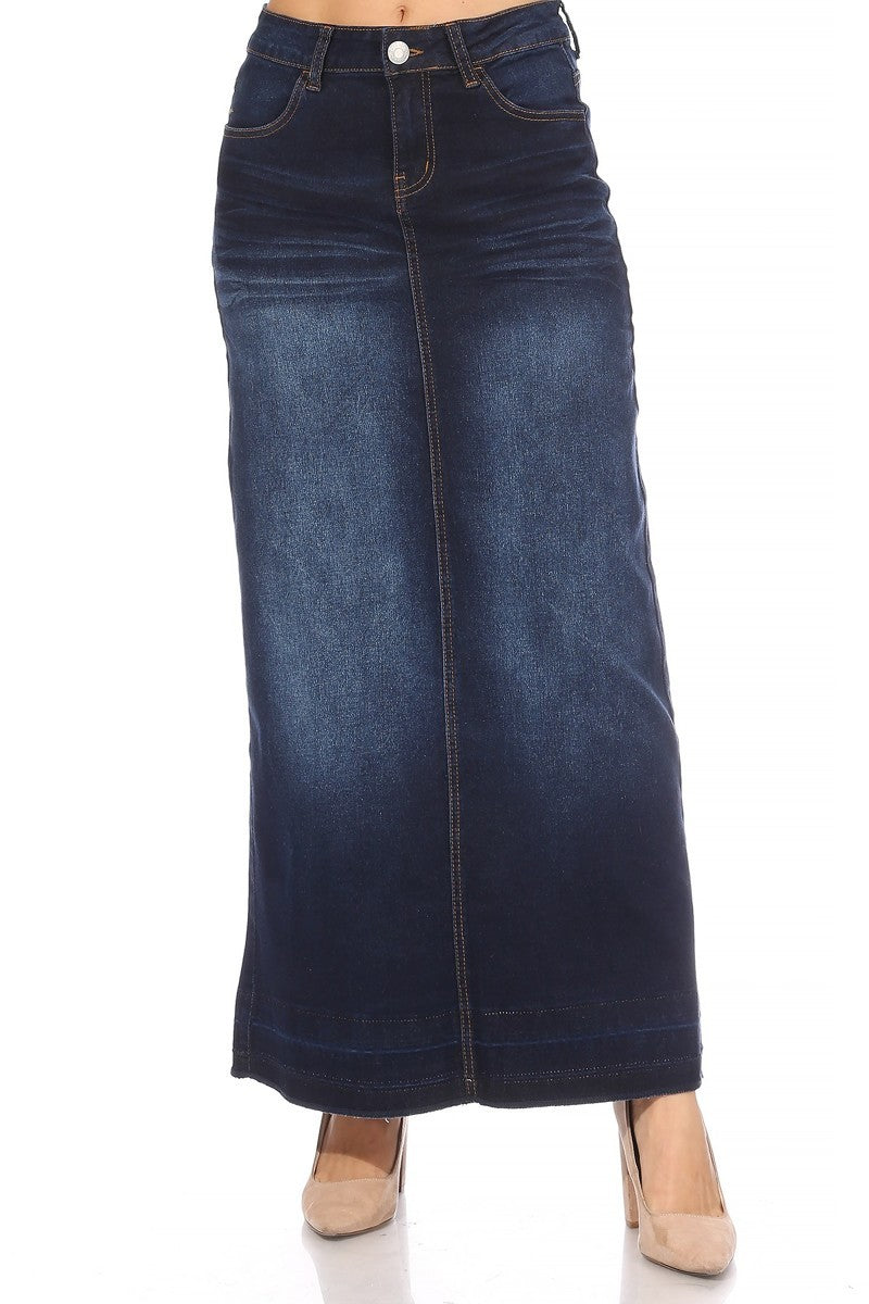 Dark Indigo Raw Hem Long Denim Skirt