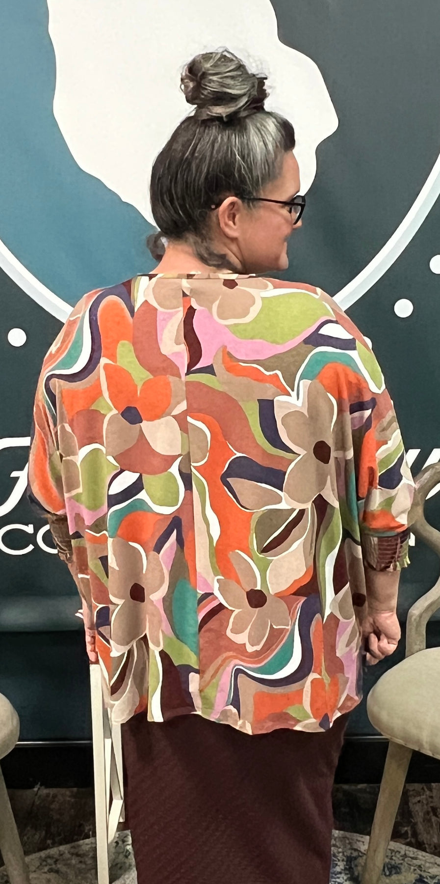 This fun top is perfect for all 4 seasons! Non wrinkle fabric and flowy. It features a beautiful autumn color tone with shirring 3/4 dolman sleeves, poncho flowy style. Runs generous! Size down.