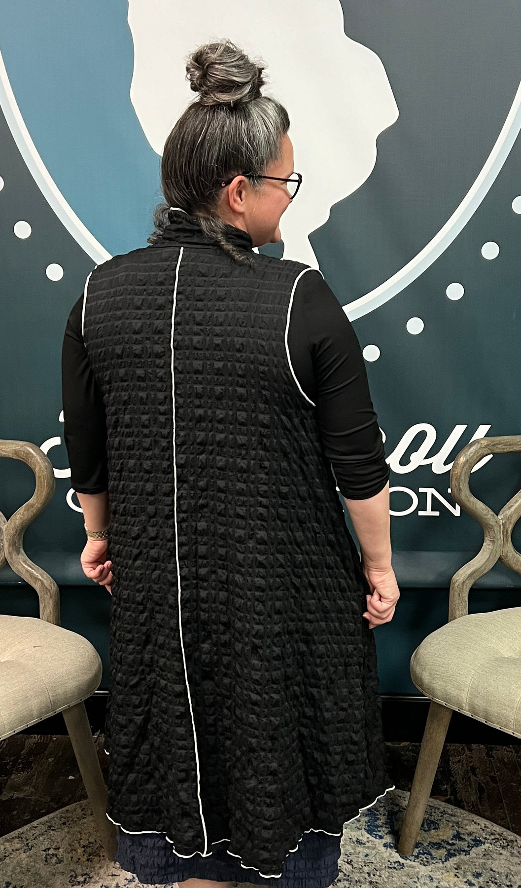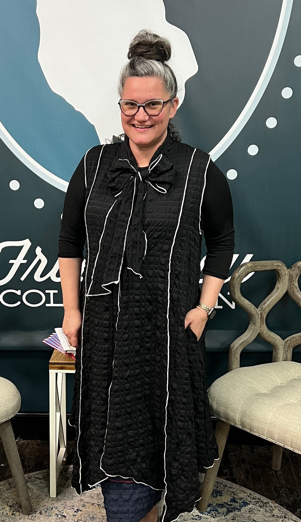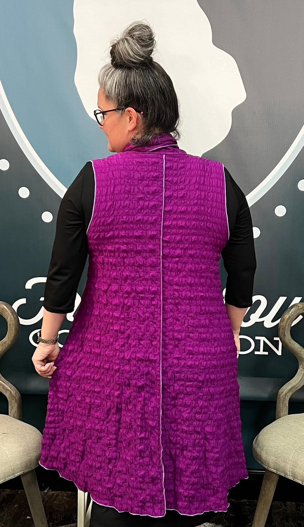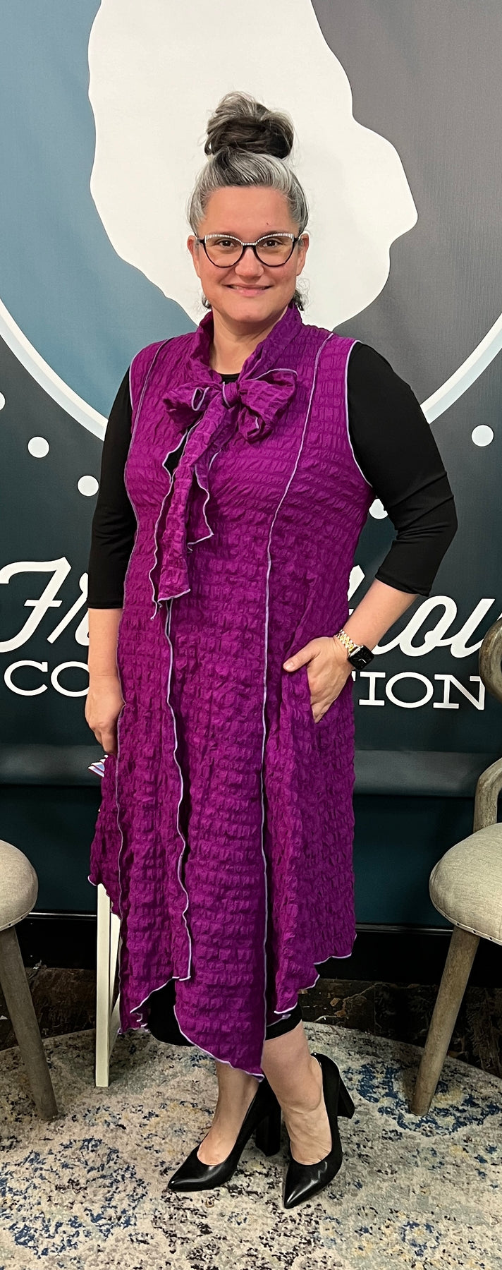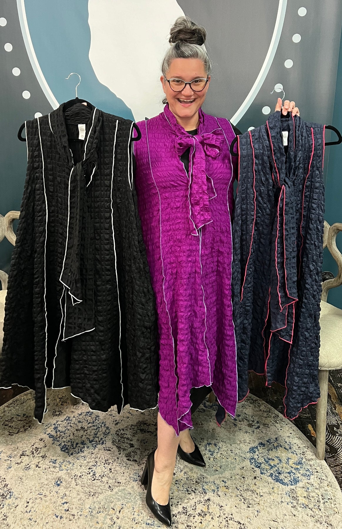 This style is simply amazing! Crinkle puff fabric that is fun and easy to wear, travels well and has a nice elevated look. Made out of high-end polyester/spandex fabric, rammed in a contrast, threading and available in three colors. Runs true to size! Buttons at the chest and has a tie, neckline handkerchief style him line that is long and hits about midcalf.