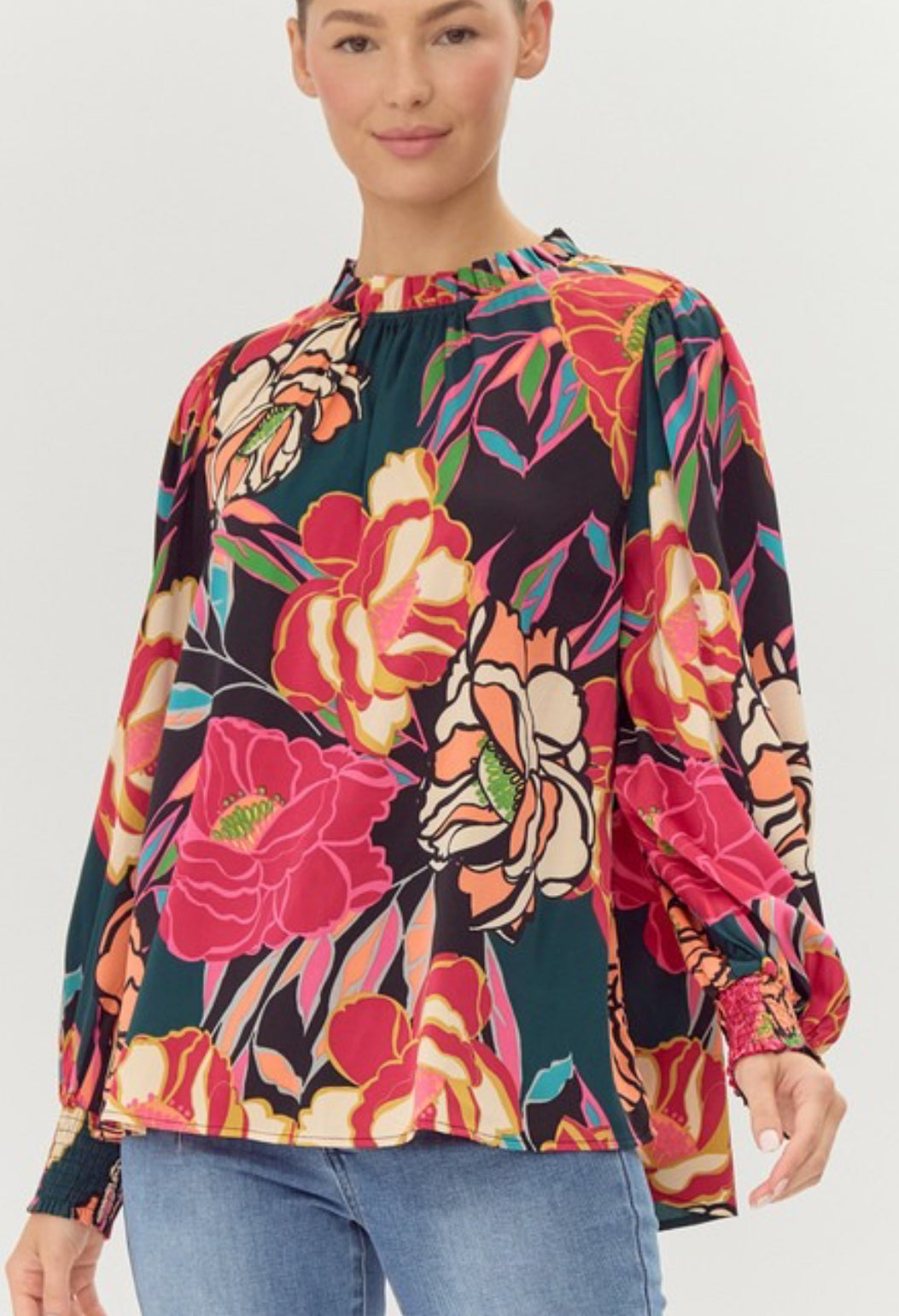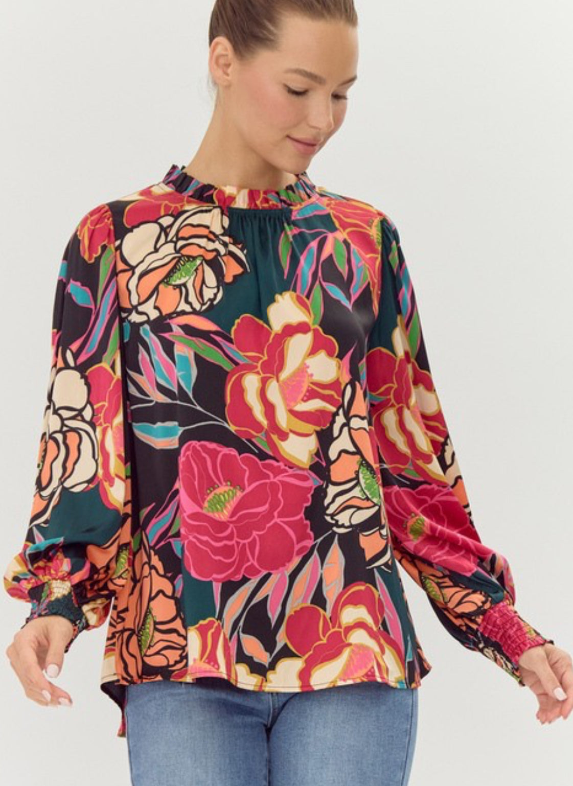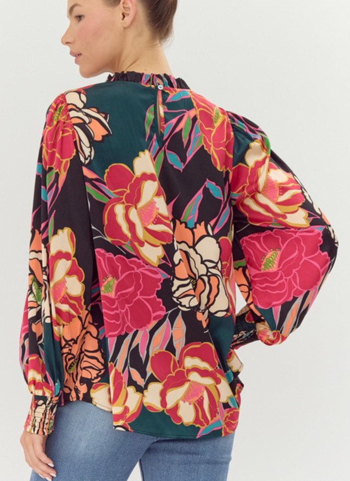 Floral print, frill neckline, bubble sleeve