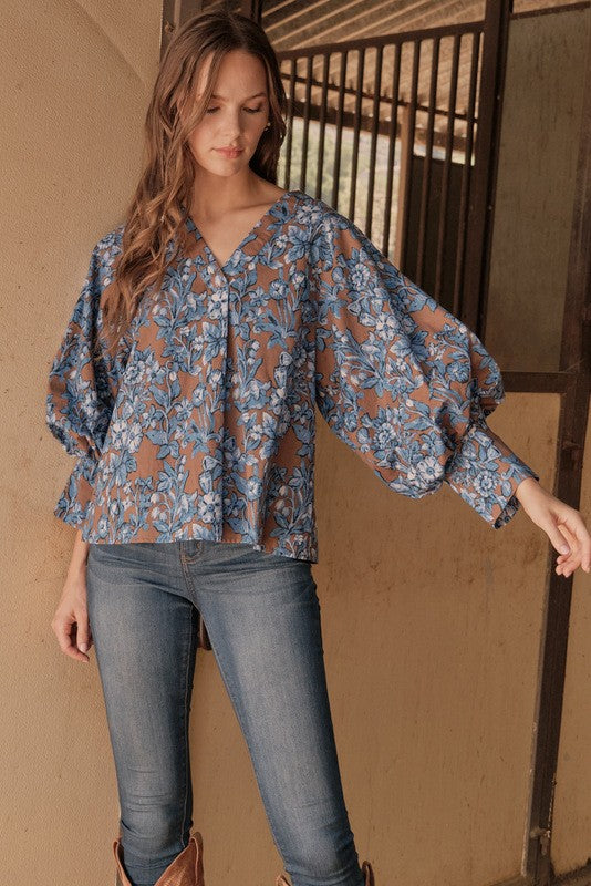 Mocha Blue Floral Print Top