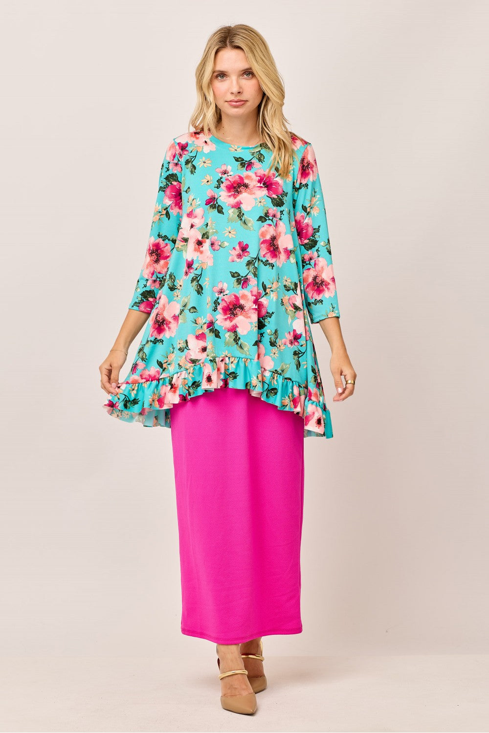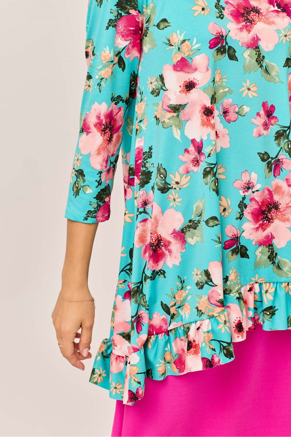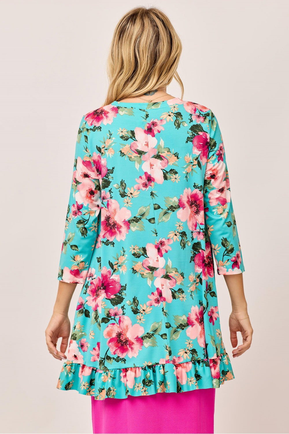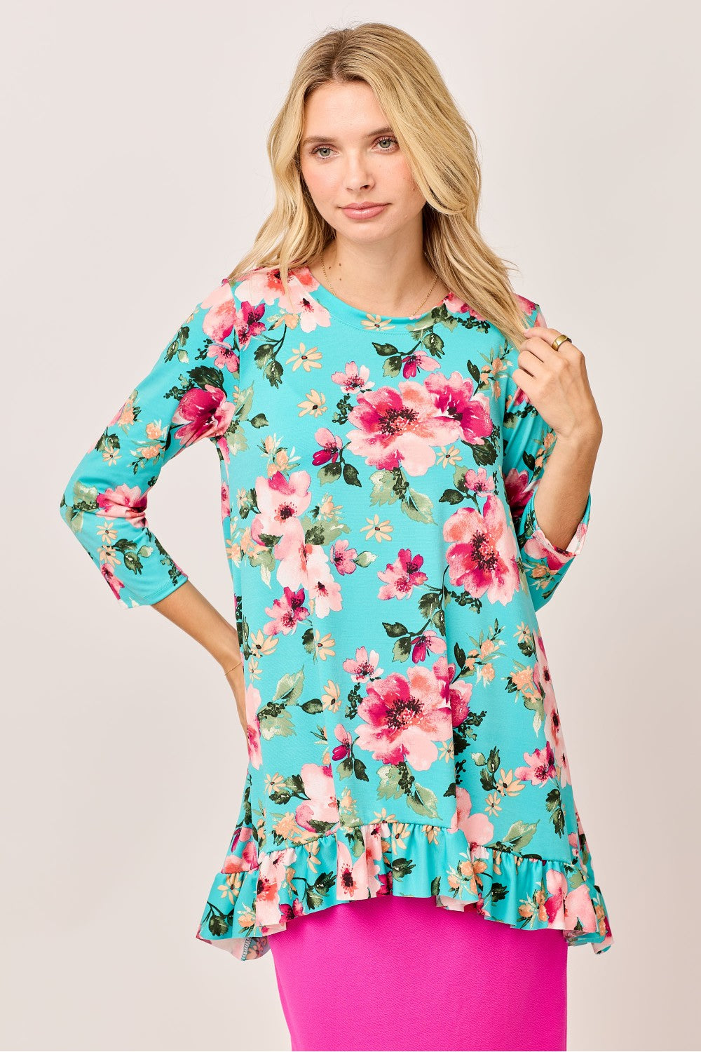 Aqua floral print with a dainty ruffle detail in the hi/lo hem. 3/4 sleeves and nice modest neckline. Non wrinkle fabric and cool to the touch.