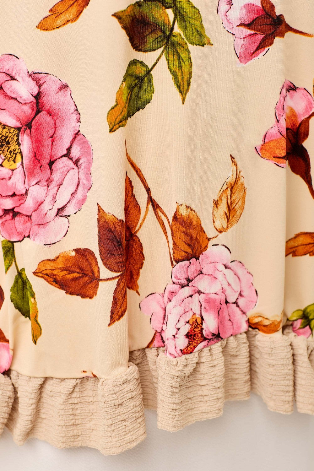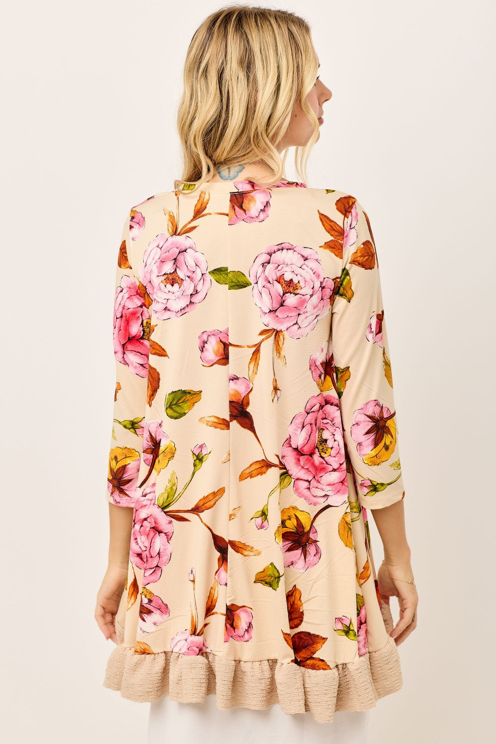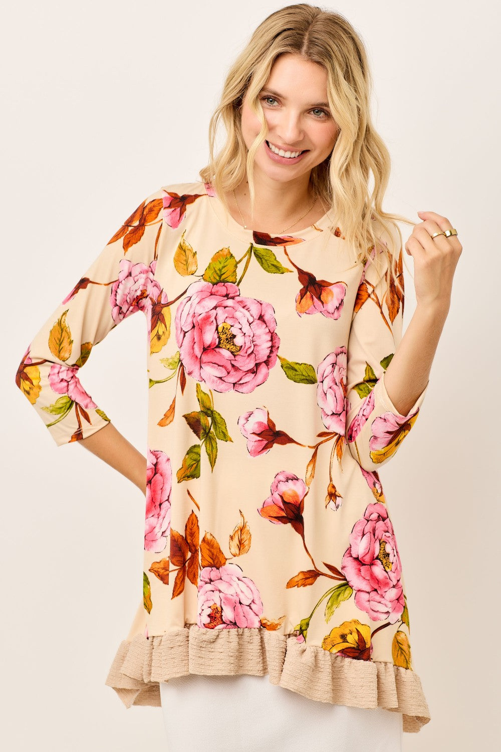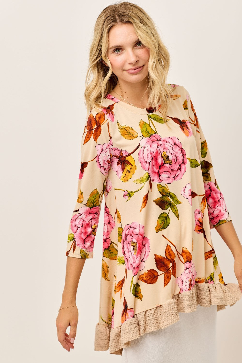 Taupe Floral print with a dainty ruffle detail in the hi/lo hem. 3/4 sleeves and nice modest neckline. Non wrinkle fabric and cool to the touch.