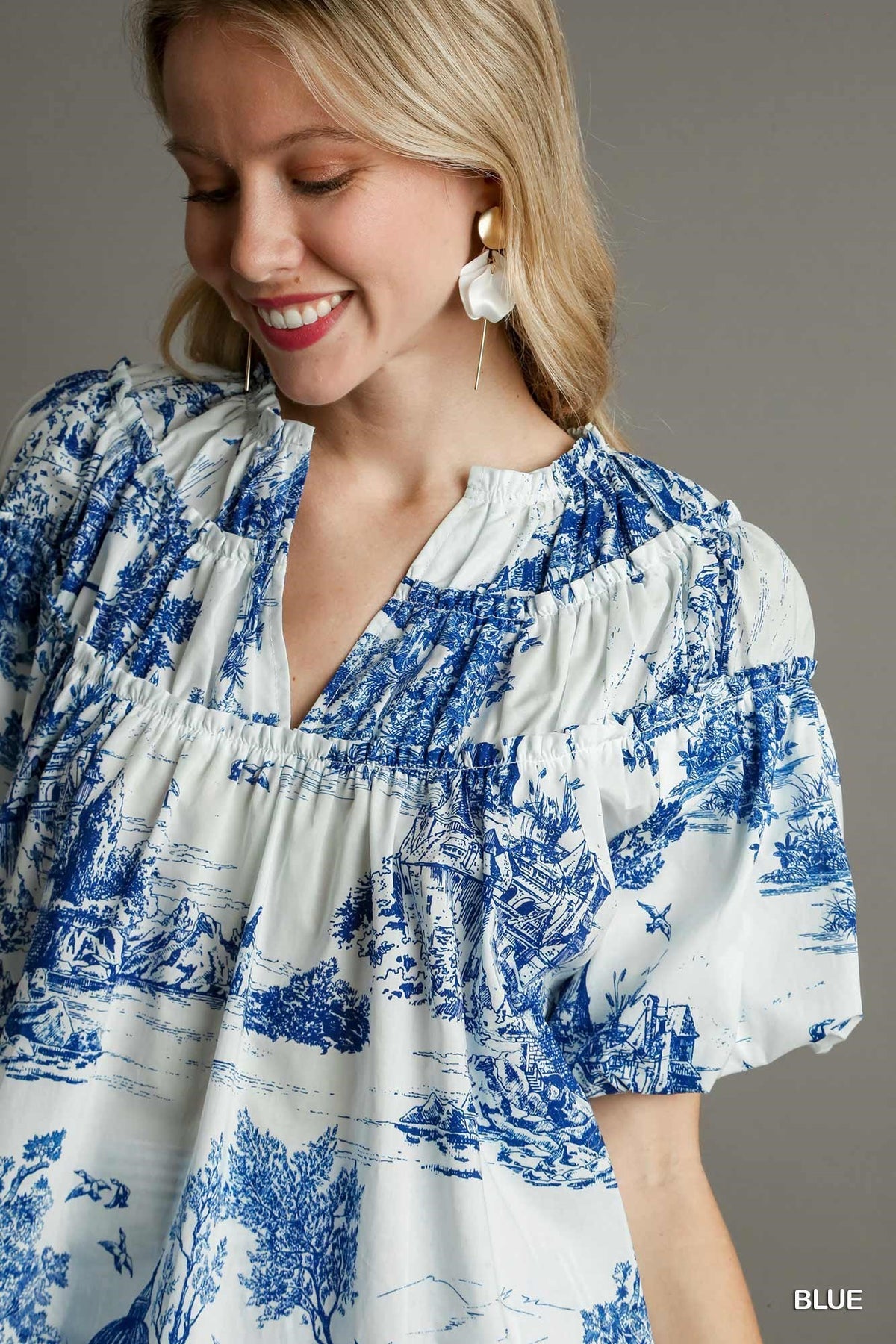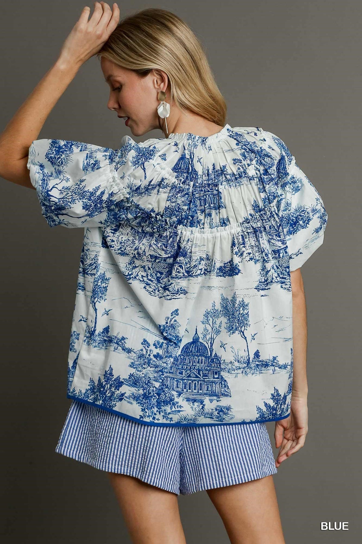 This boxy cute short sleeve blue toile top is perfect for dressy or casual!