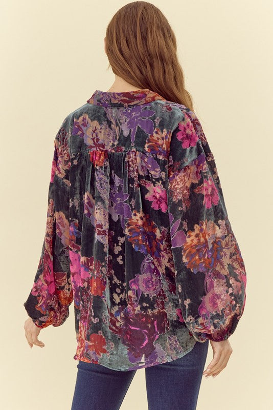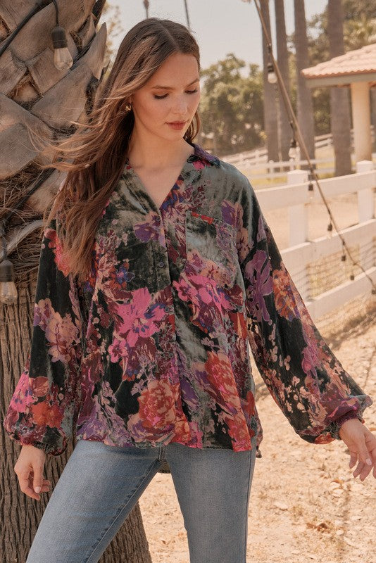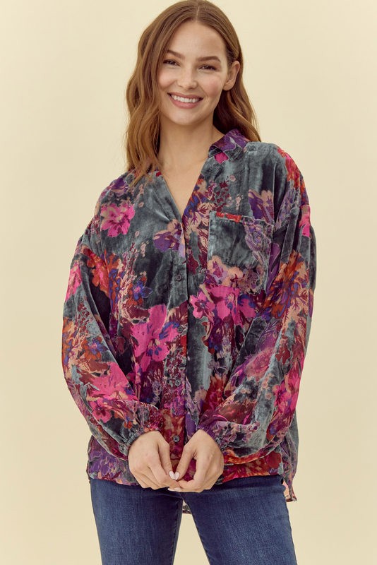 Velvet flower print top with open collared neck, front pocket detail