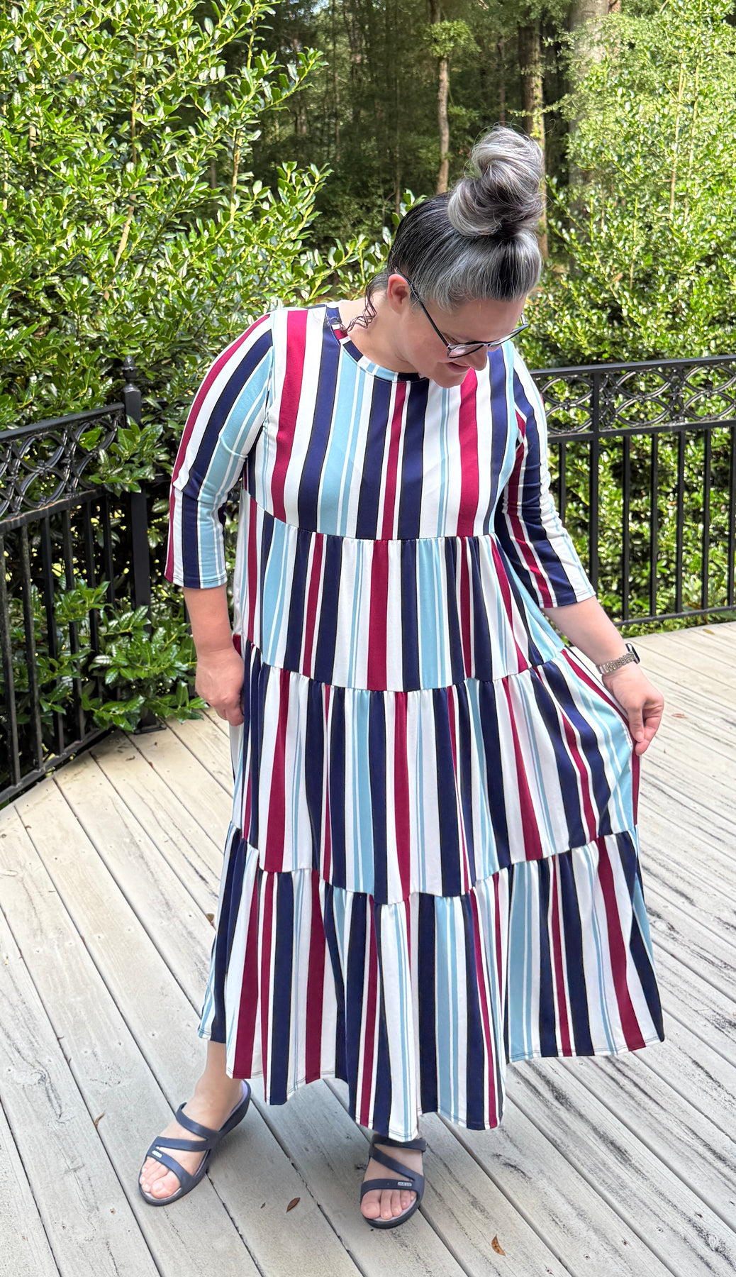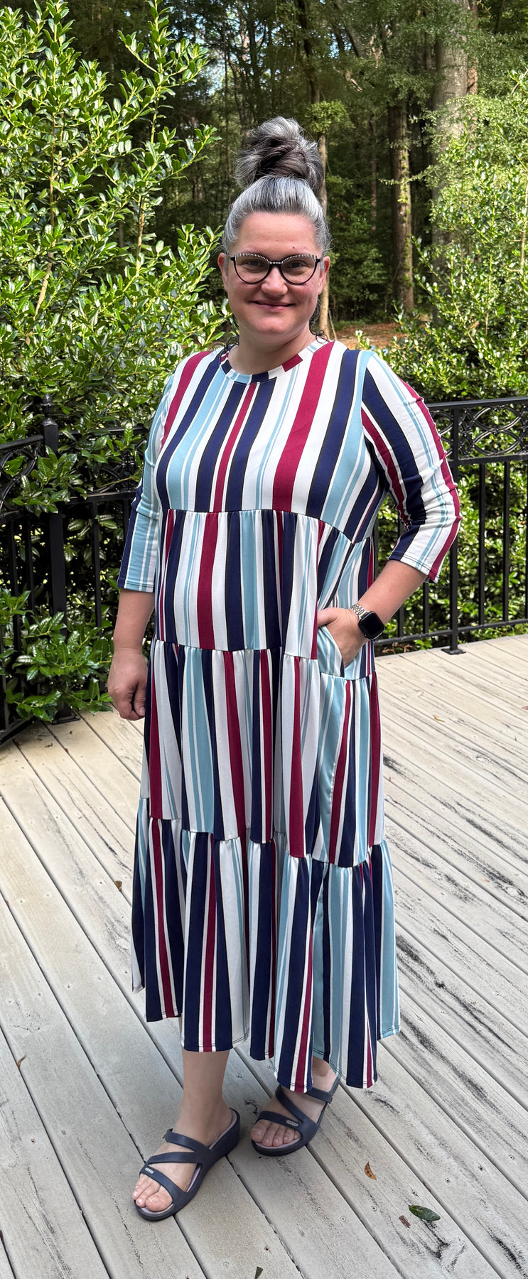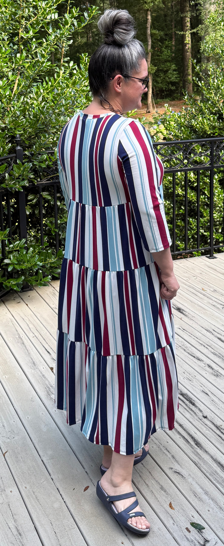 The All American Dream Dress features bold vertical stripes in dark red, ivory, navy, and light blue, giving it a subtle yet festive patriotic flair. Crafted from a soft, stretchy polyester-spandex blend, it offers unbeatable comfort and flexibility. This tiered dress includes practical pockets and a modest cut with a high neckline and 3/4-length sleeves. Its lightweight, breathable fabric makes it perfect for everyday wear or casual gatherings. With its classic Americana color palette and flattering silhouette, this dress is both timeless and fun.
