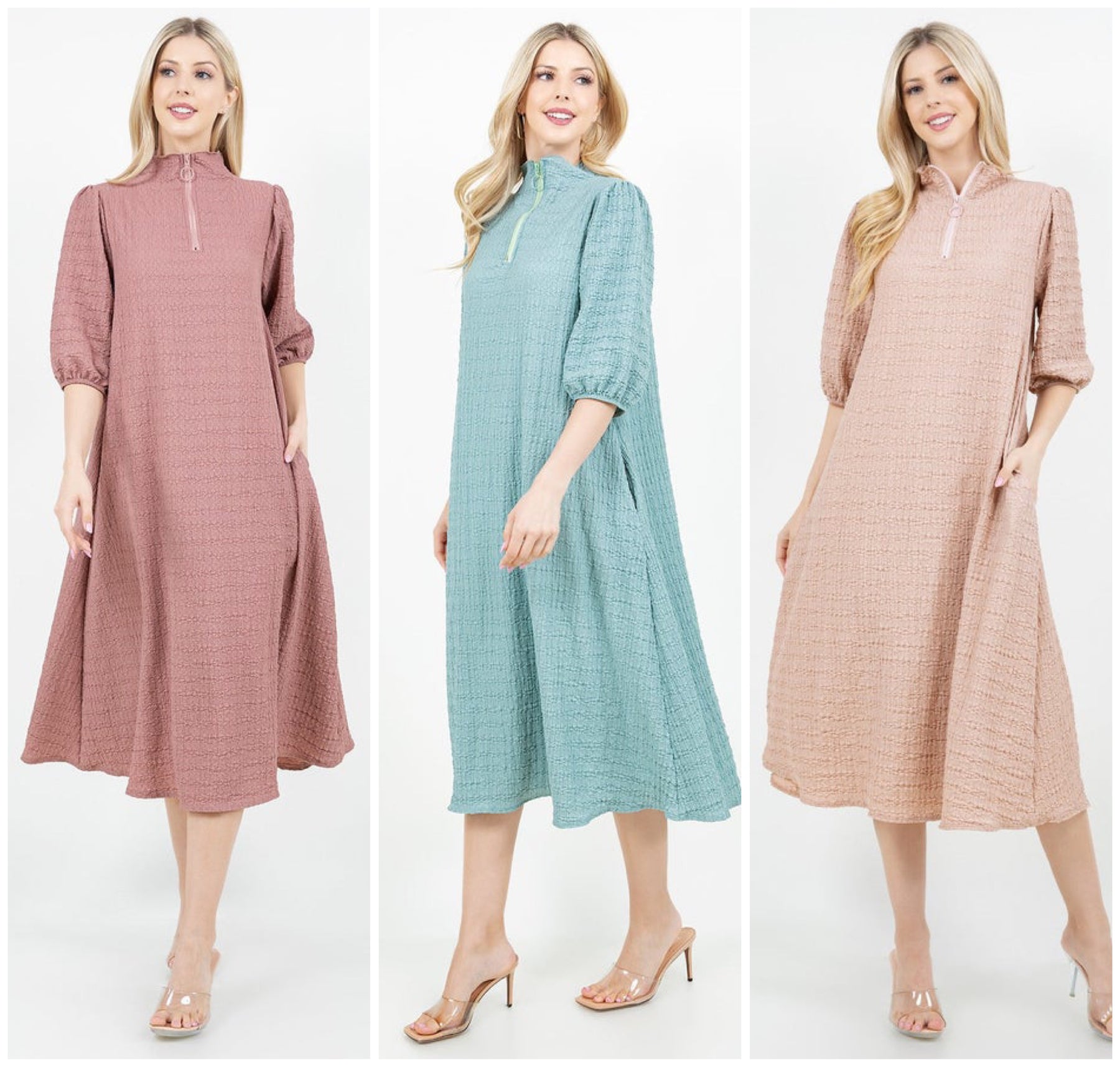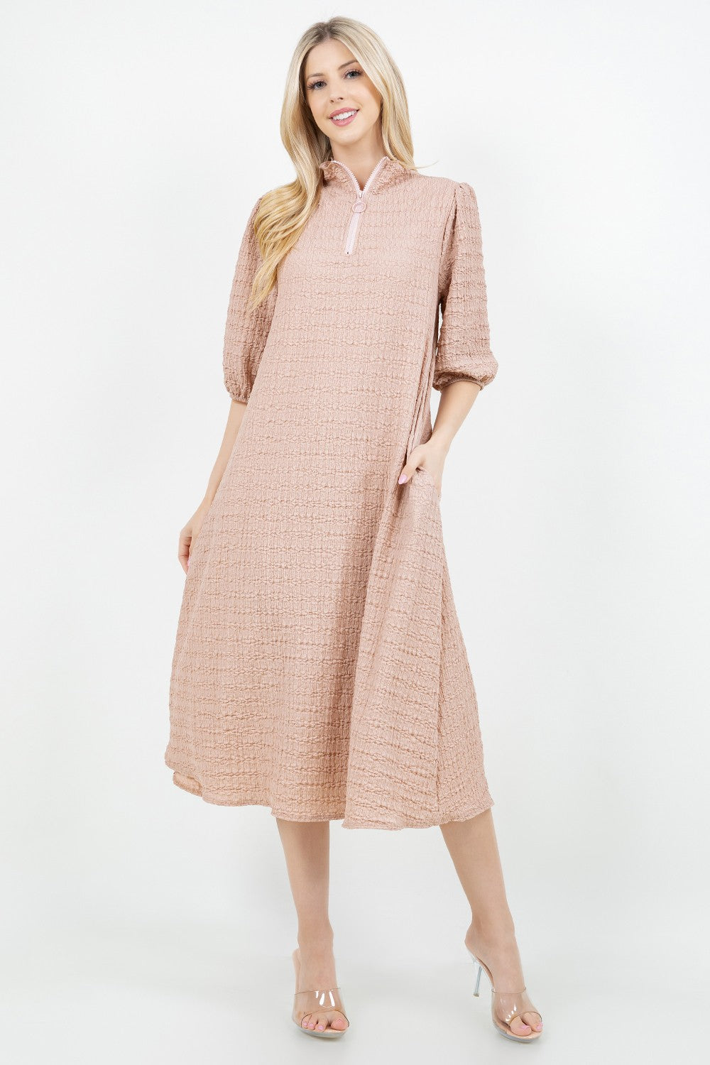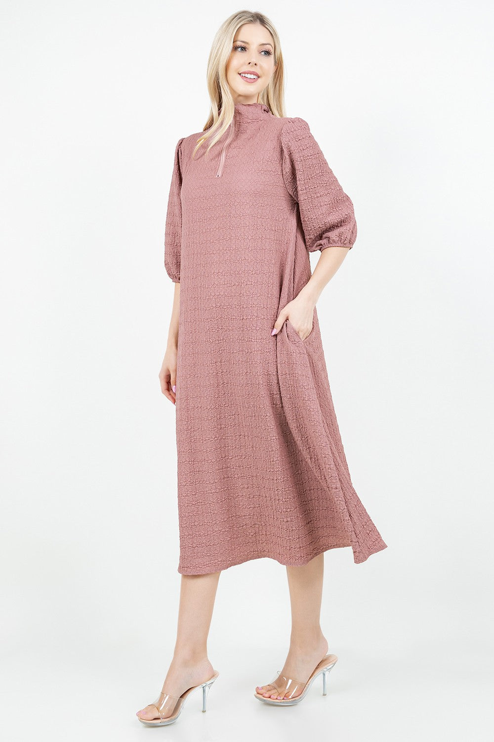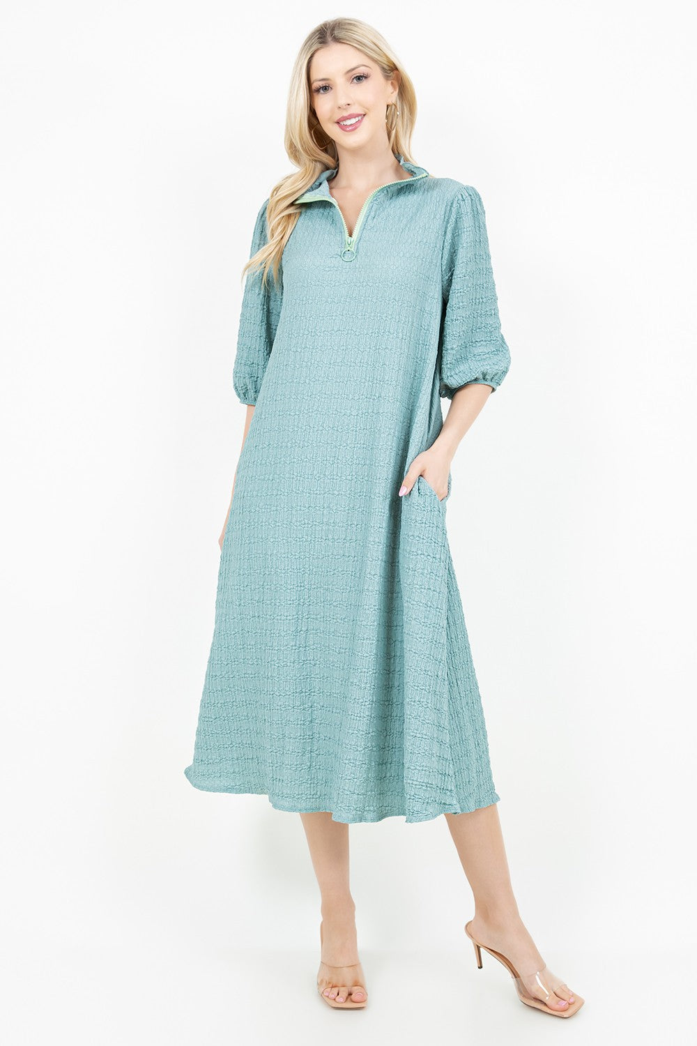 Crinkle fabric with high neckline, elastic cuff sleeve, a line body and pockets!