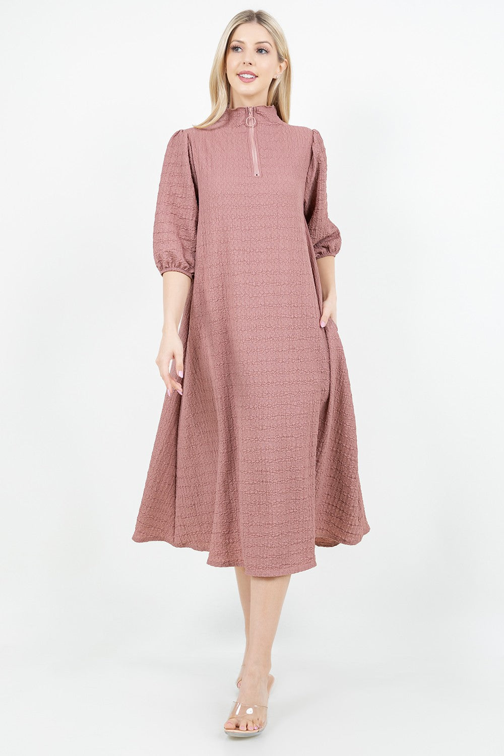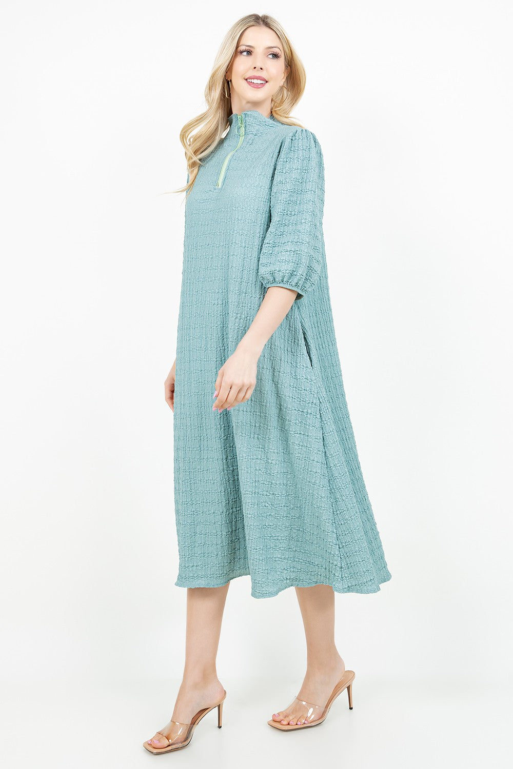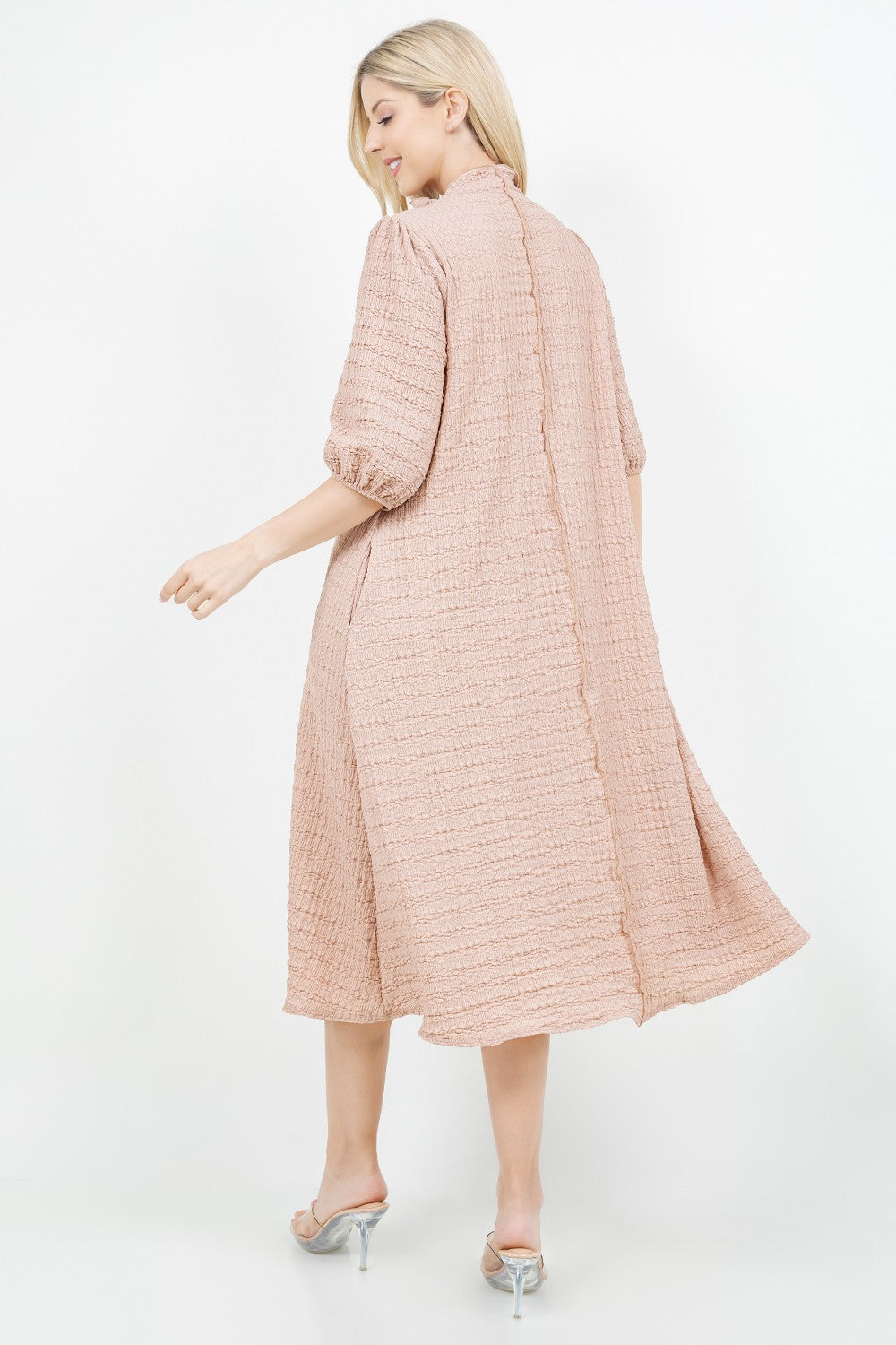 Crinkle fabric with high neckline, elastic cuff sleeve, a line body and pockets!