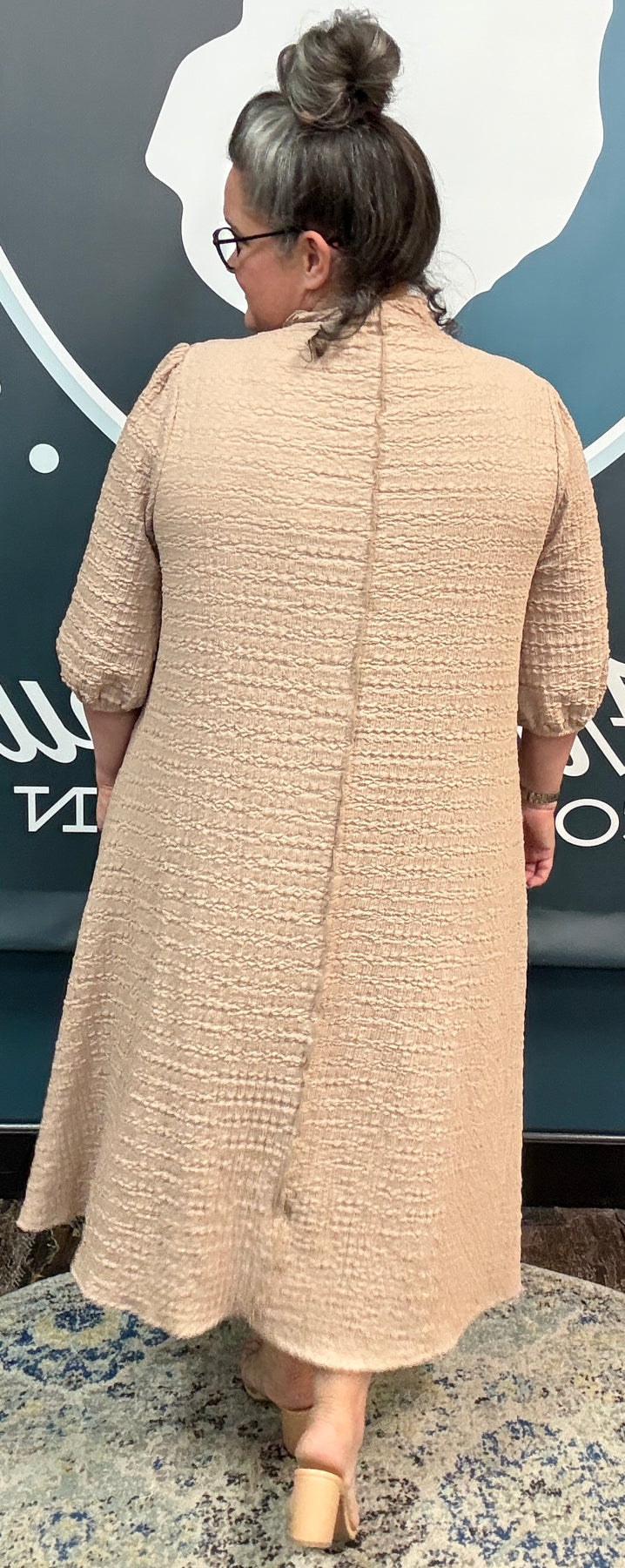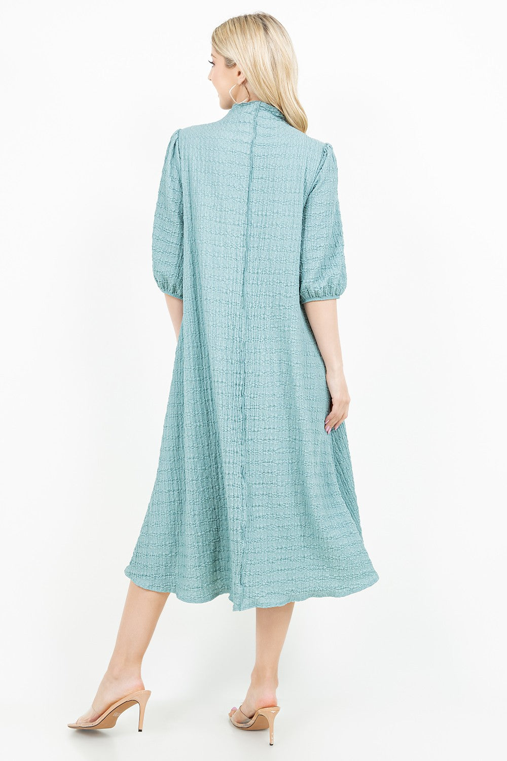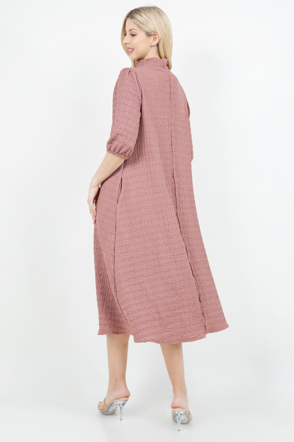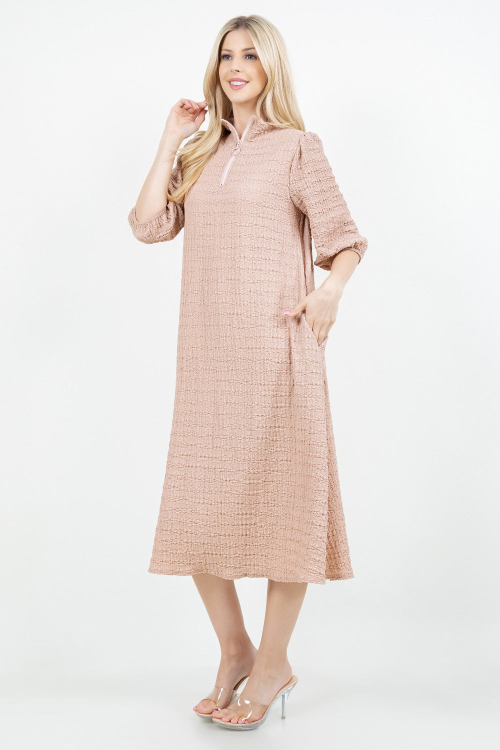 Crinkle fabric with high neckline, elastic cuff sleeve, a line body and pockets!
