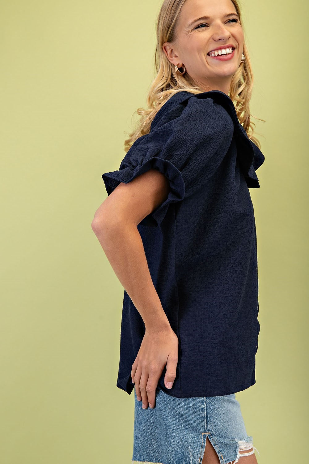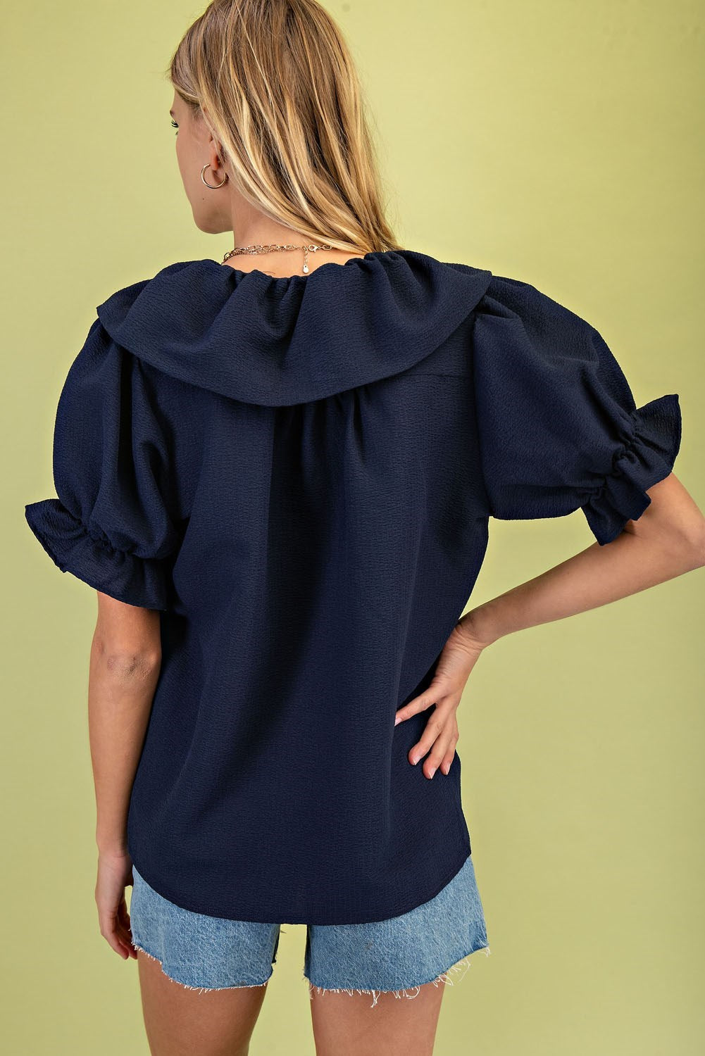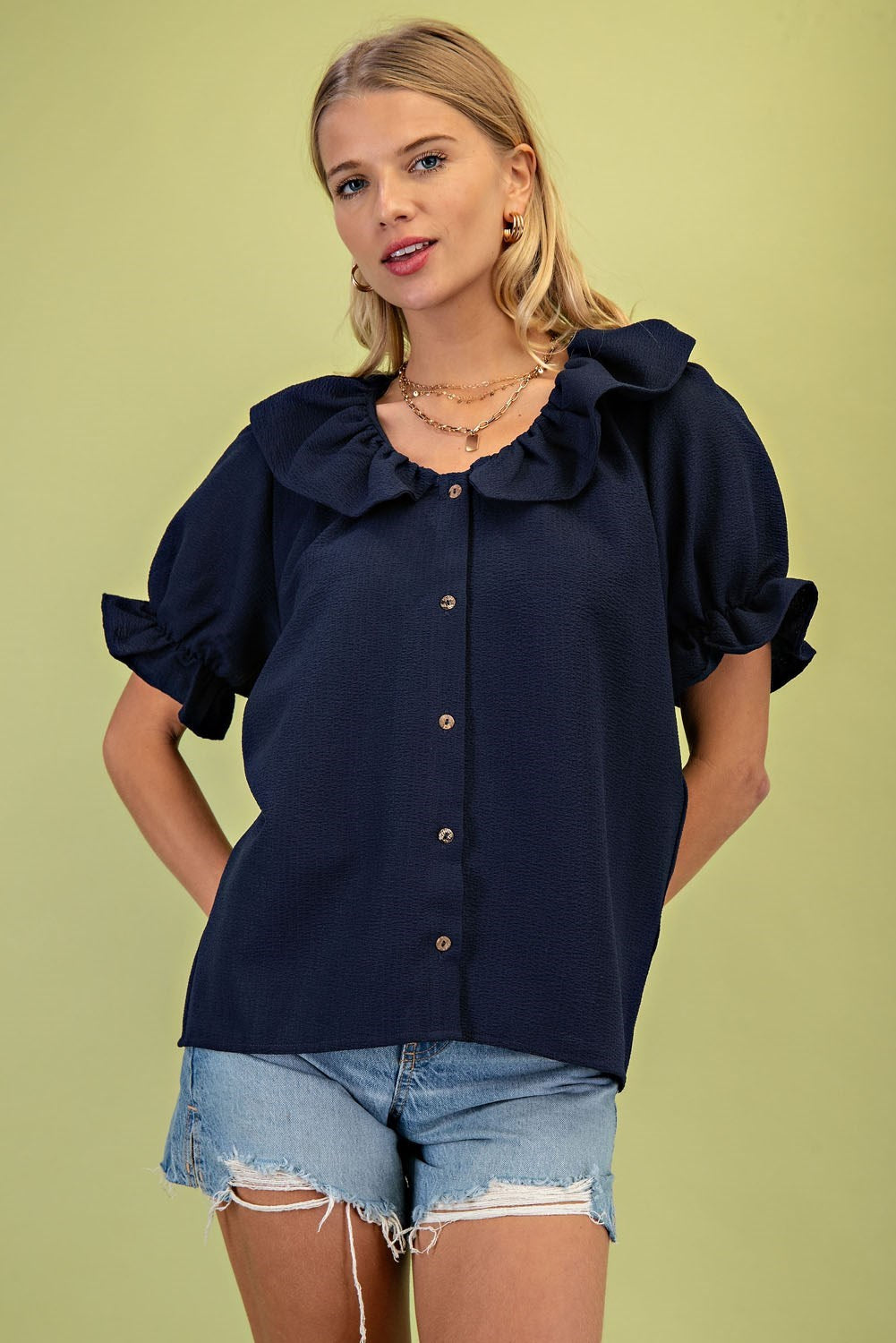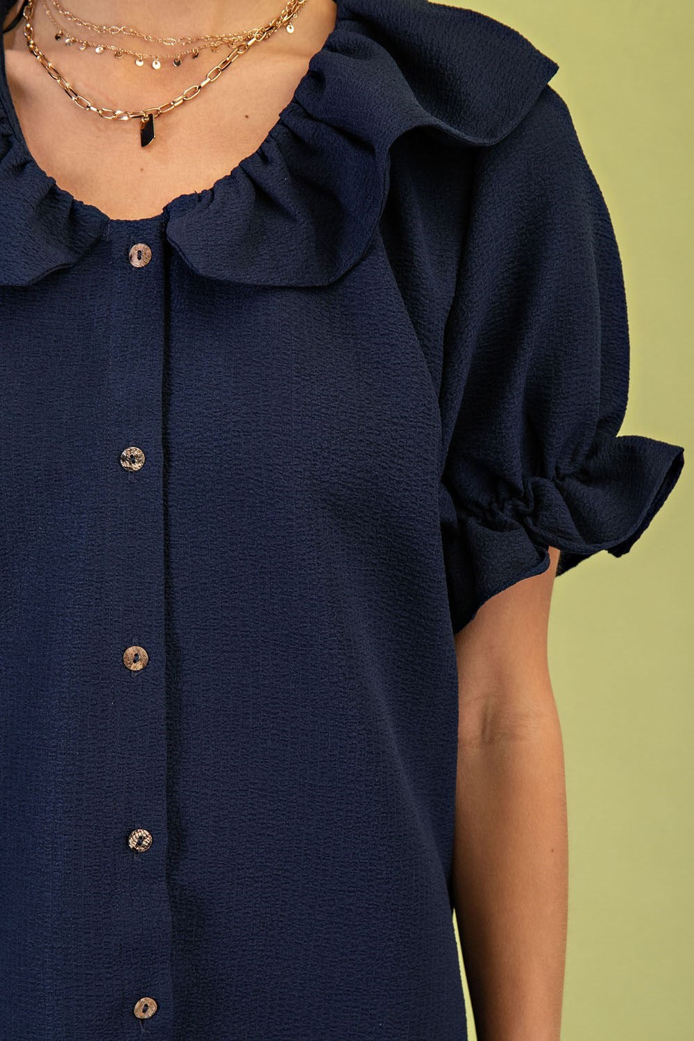 This navy button-up blouse features a delicate frilled collar that adds a touch of elegance to your outfit. The short sleeves are designed with a poofy silhouette, finished with elastic ruffles that provide both comfort and style. Crafted for a refined yet playful look, this blouse pairs effortlessly with both casual and formal ensembles. Its tailored fit and thoughtful details make it a versatile addition to any wardrobe.