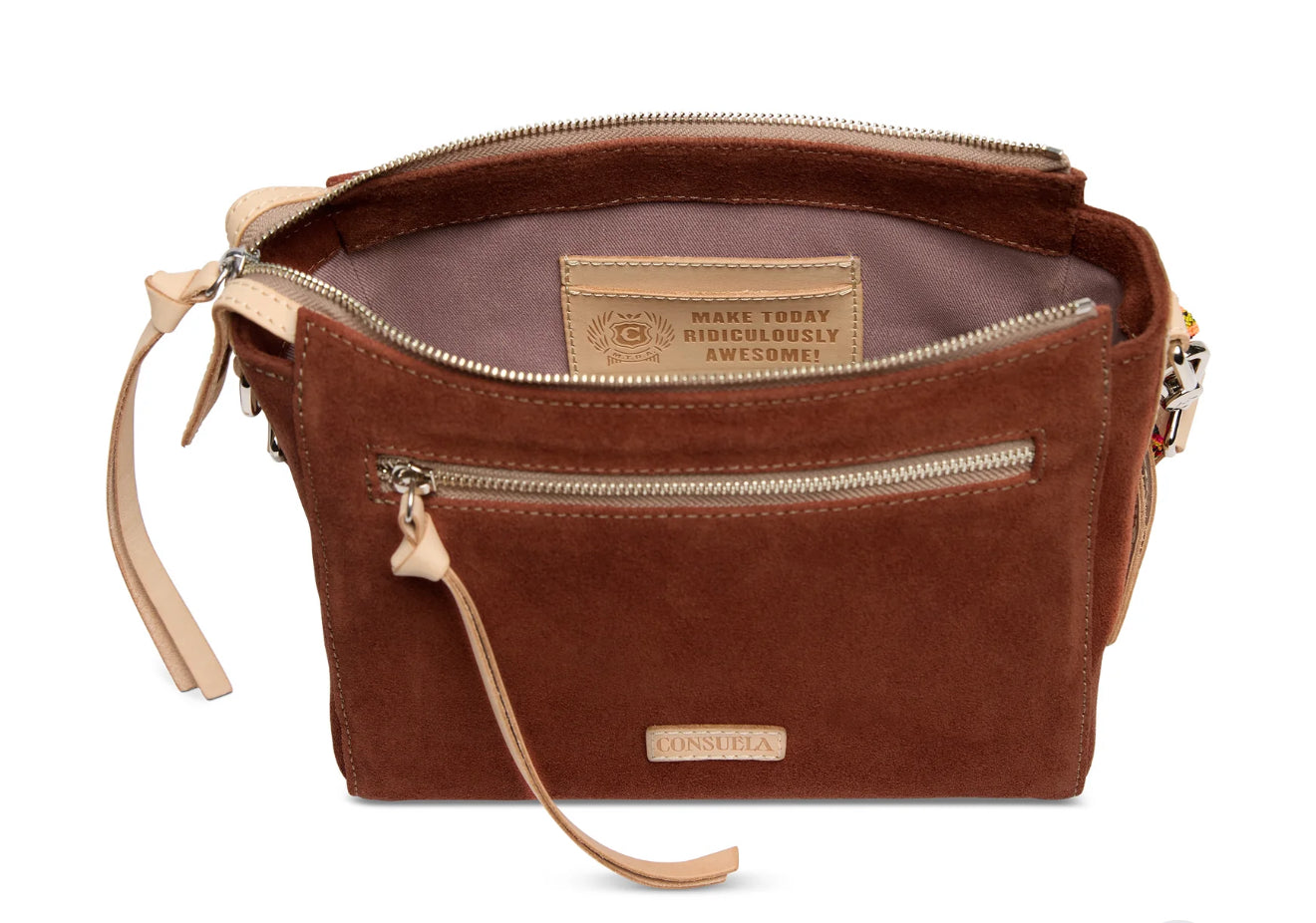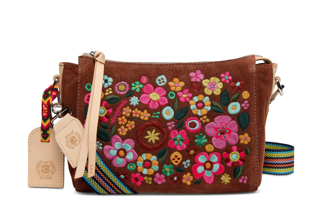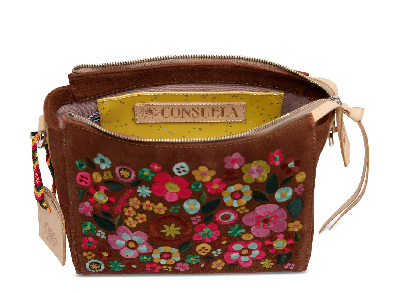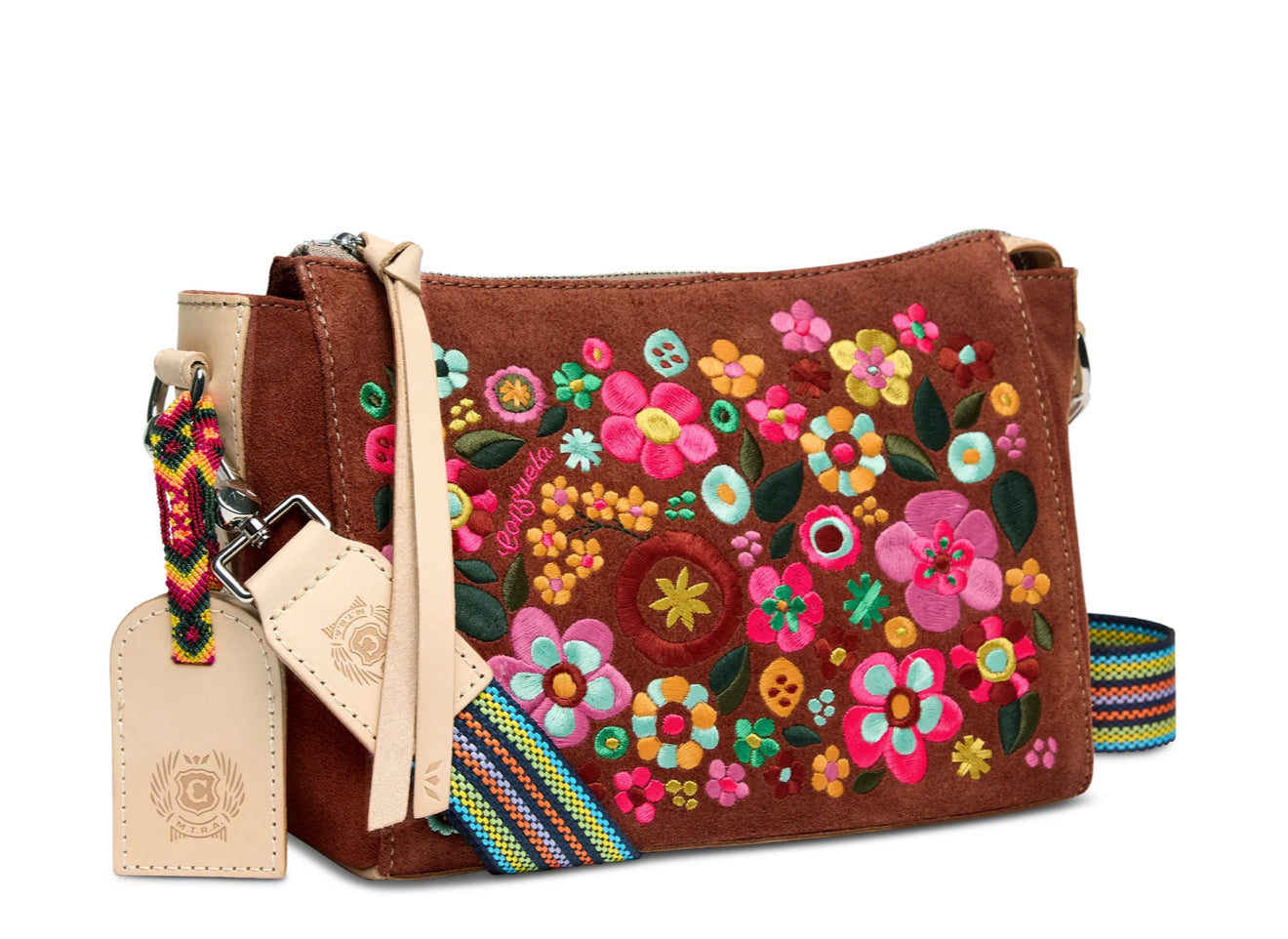 • Embroidered floral on a Sienna suede exterior