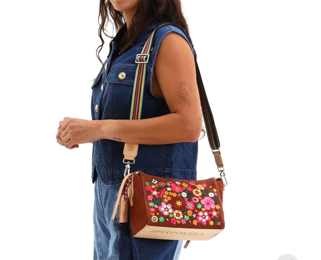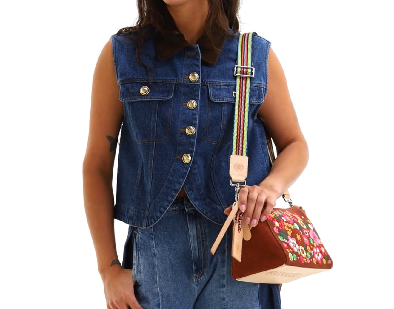 • Includes detachable and adjustable woven crossbody strap