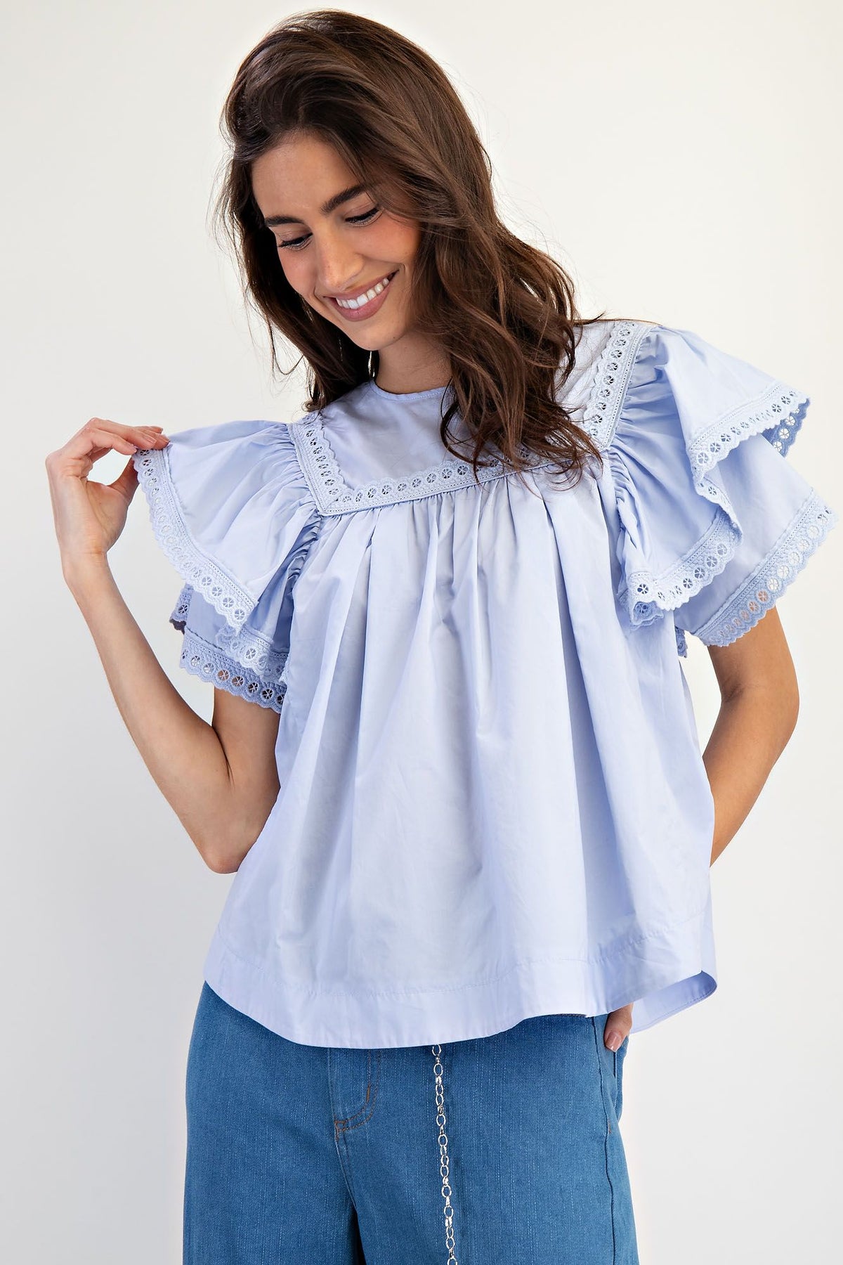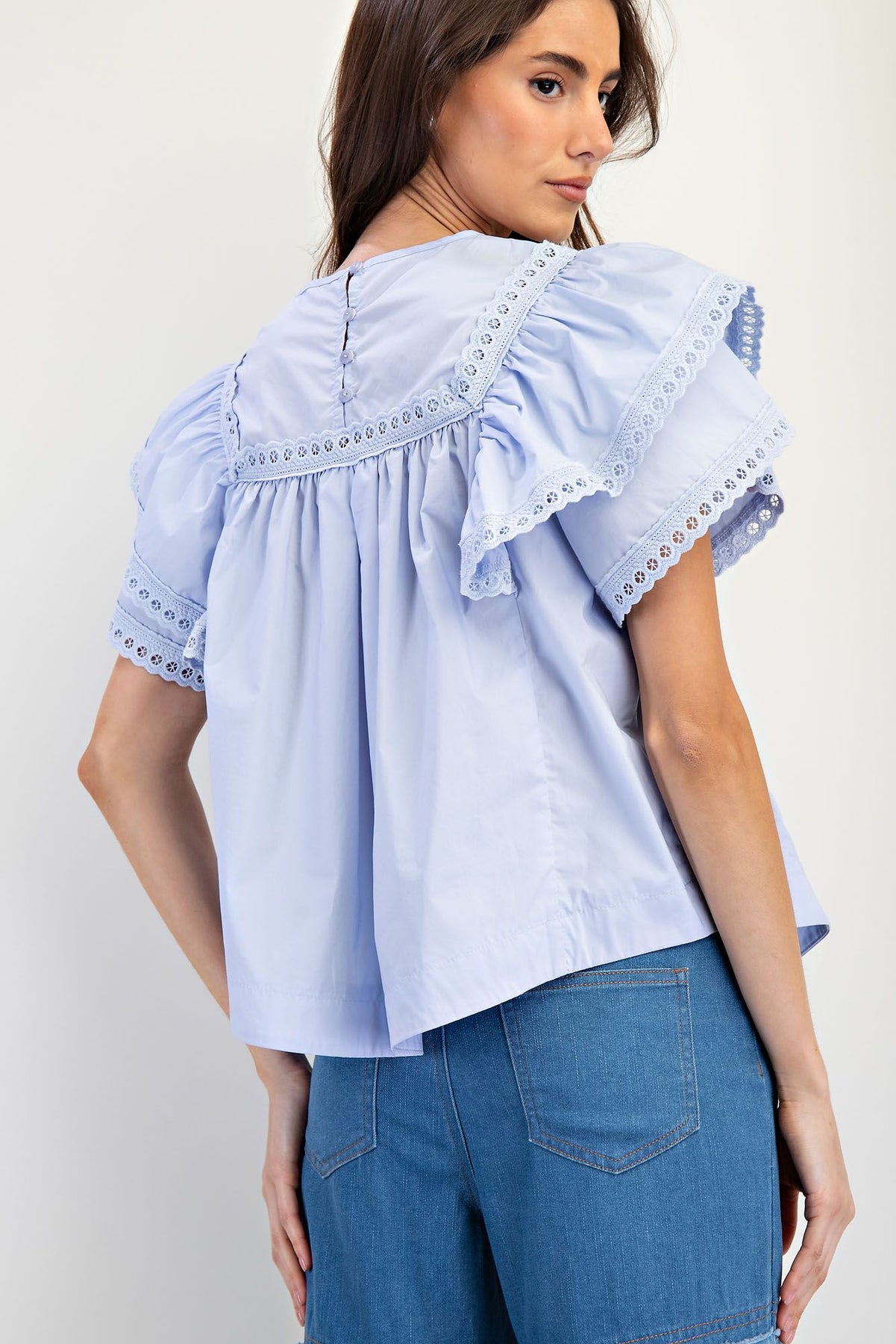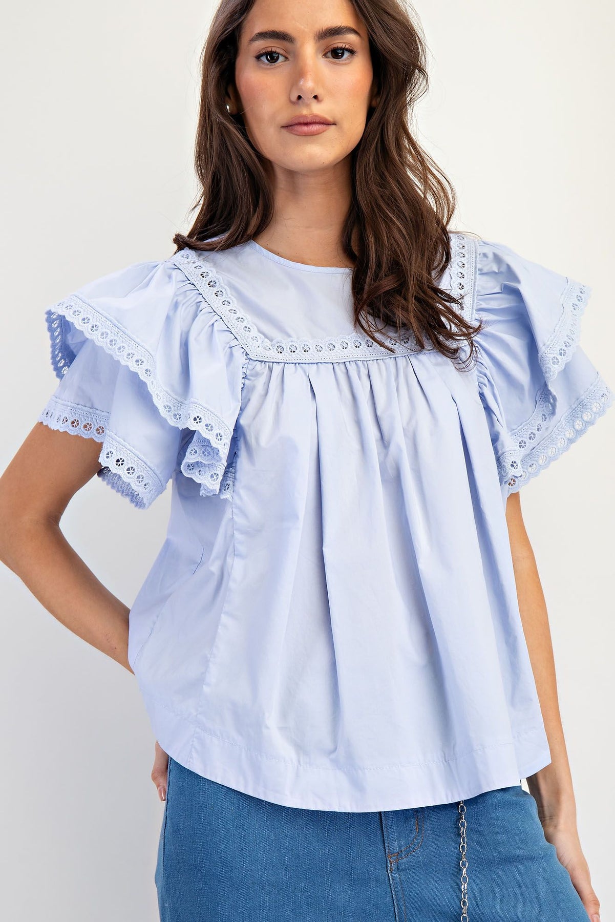 Short Double Wing Sleeve with Scalloped Crotchet Lace Trim Detailing