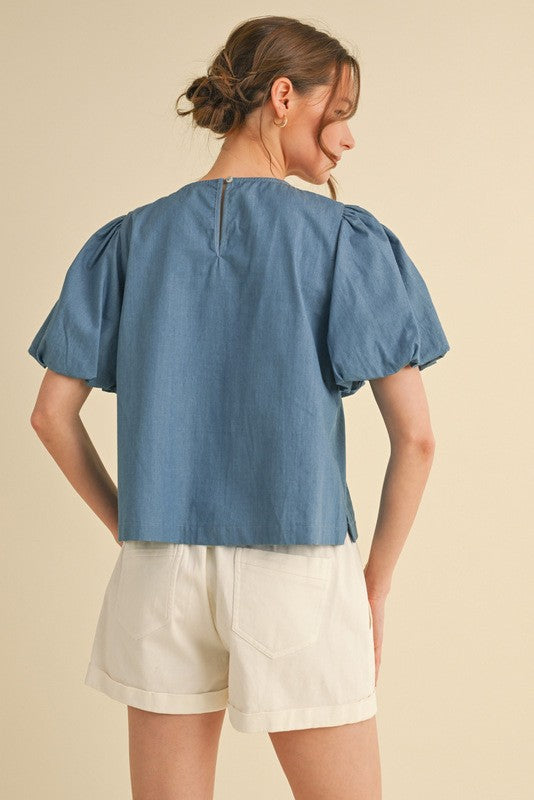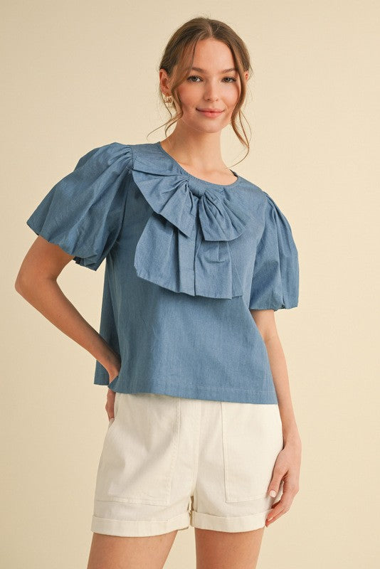 The Denim Color Bow Top is a wardrobe essential that can transition from day to night and embodies a perfect blend of comfort and style