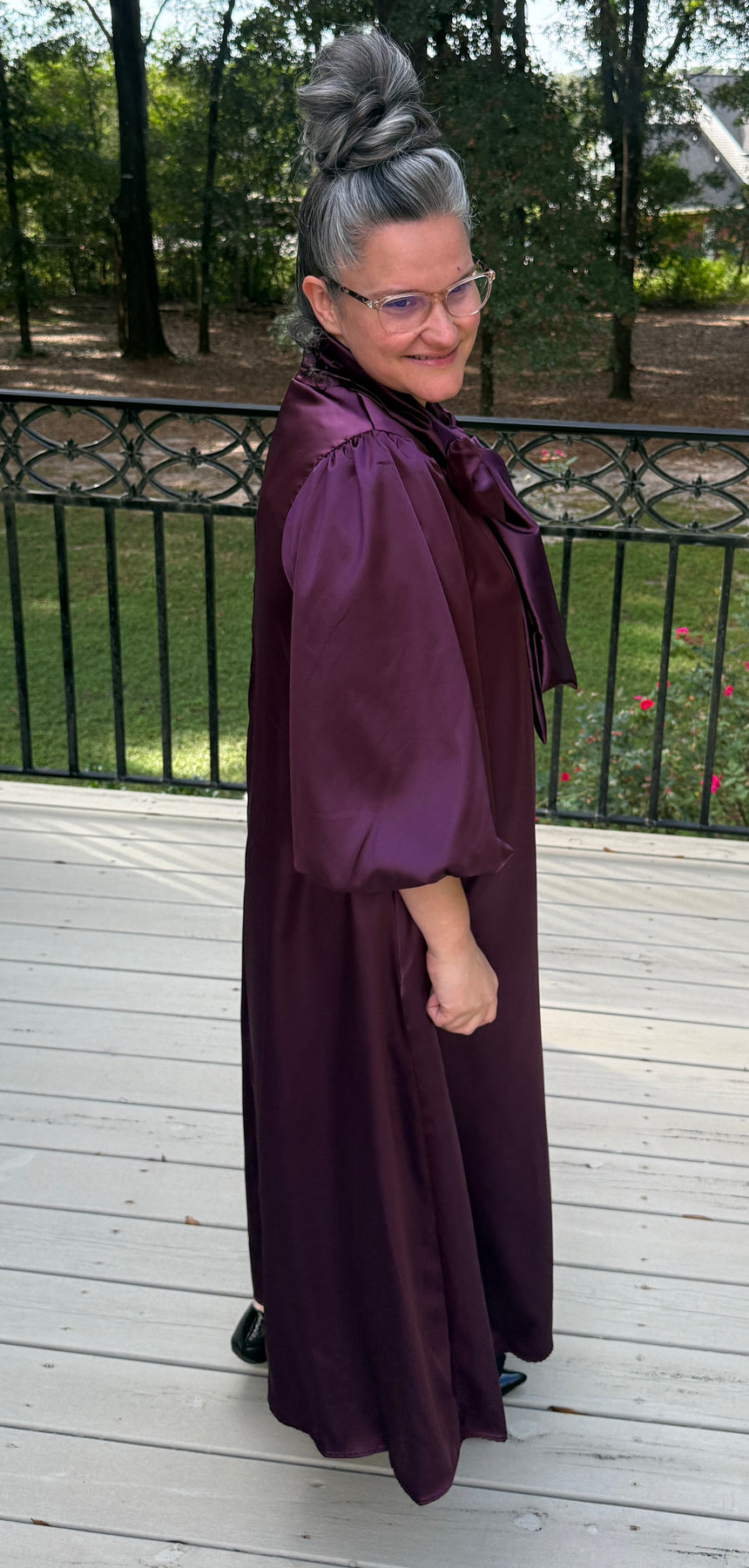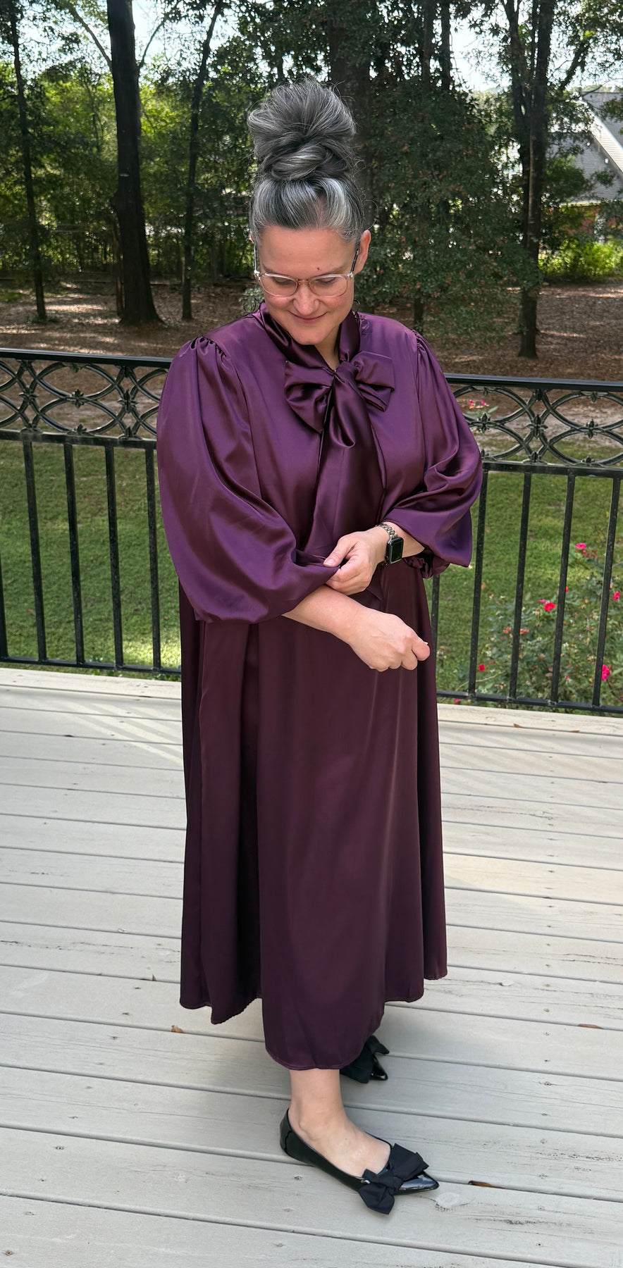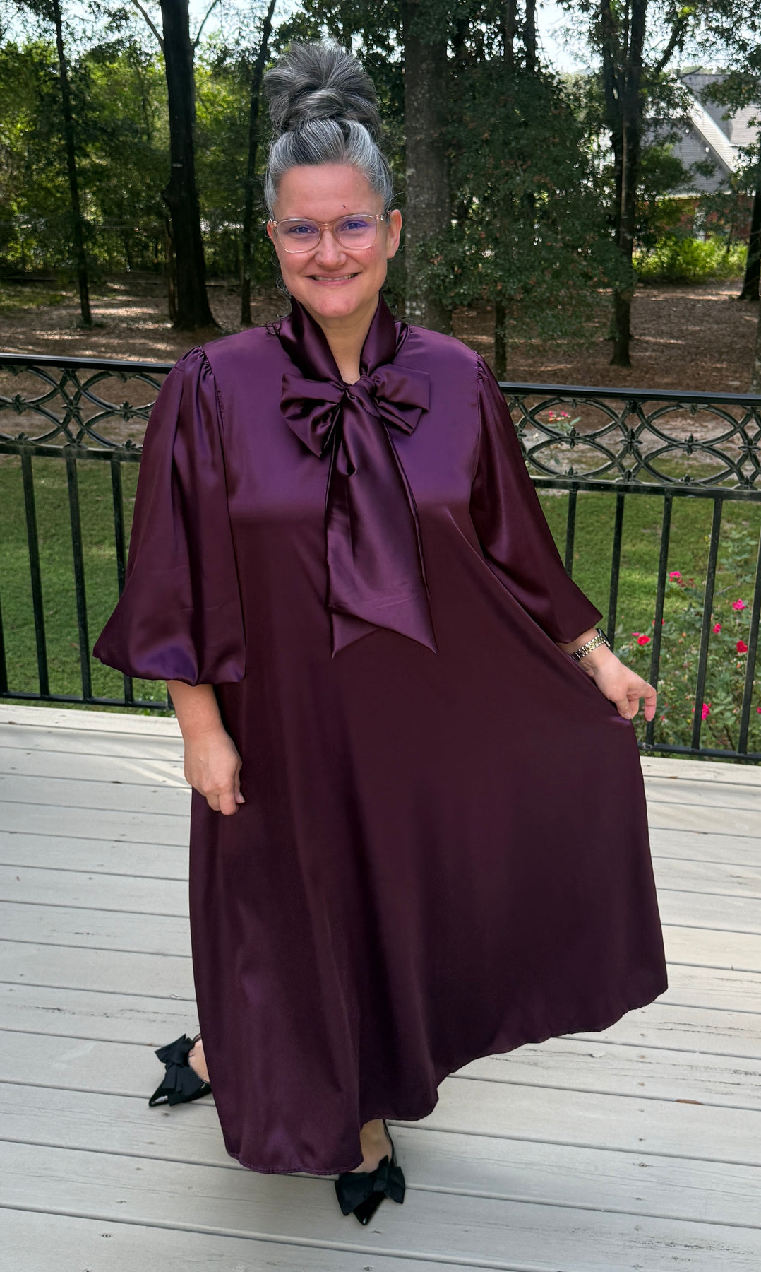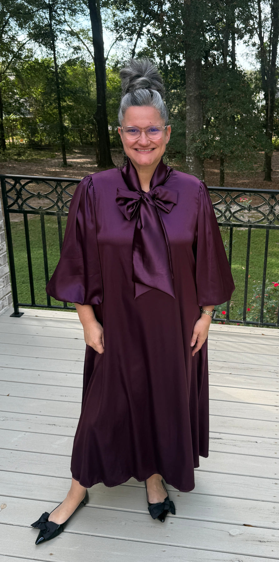 Beautiful satin like fabric featuring scarf like collar with elegant bow tie. Bubble 3/4 sleeves, swing style dress with pockets.