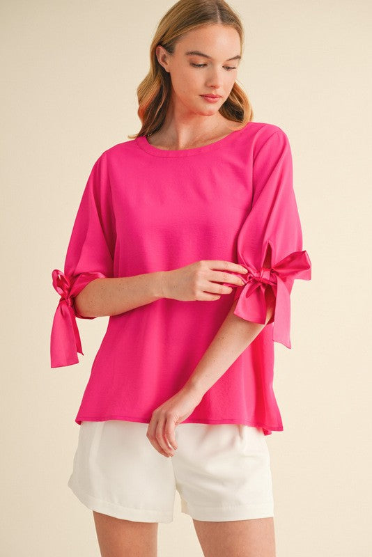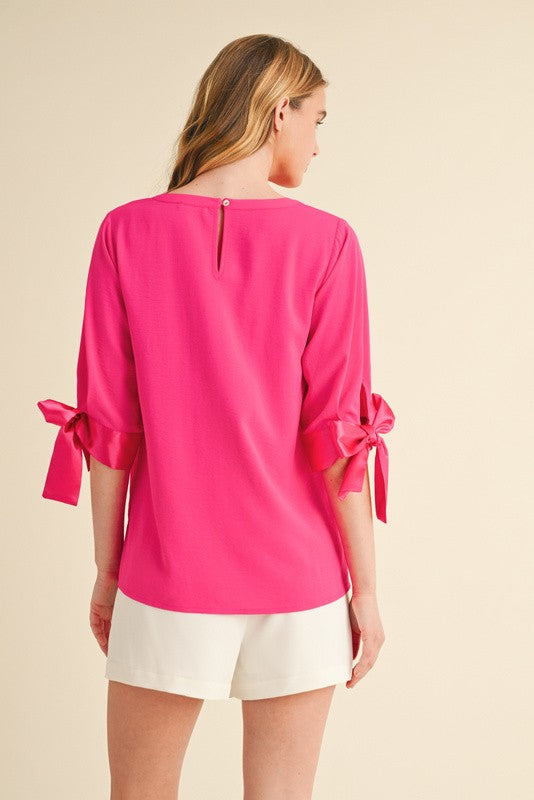 Solid top with U-neck, back buttoned closure, three quarter sleeves,