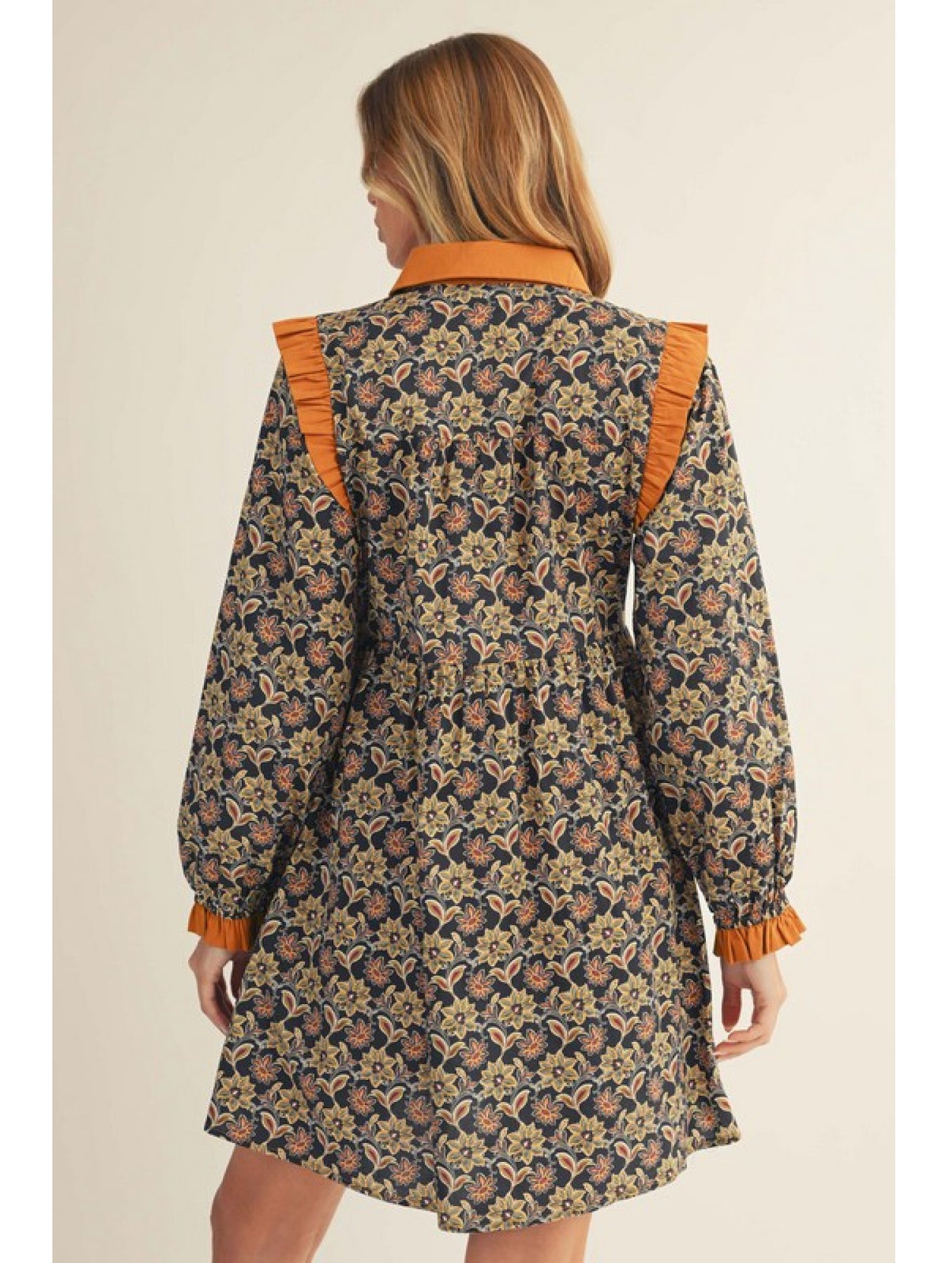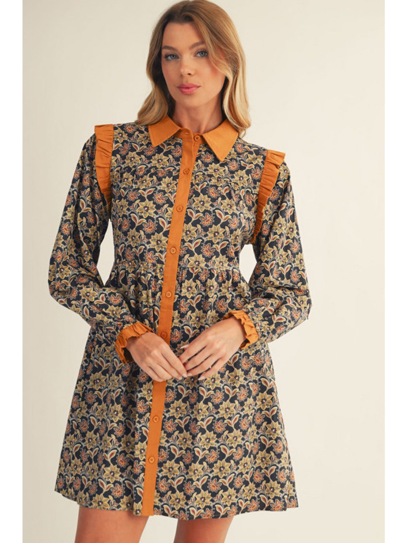 Long sleeves button down boho floral dress with ruffle detail, solid contrast detail. (Camel trim appears brighter in picture)