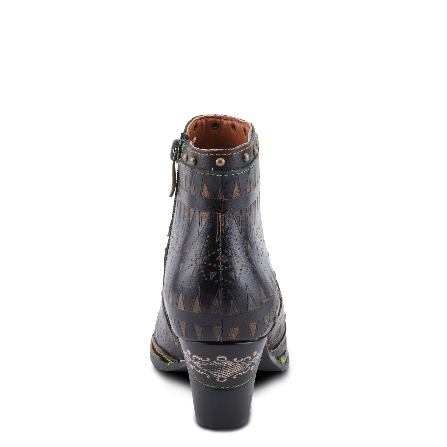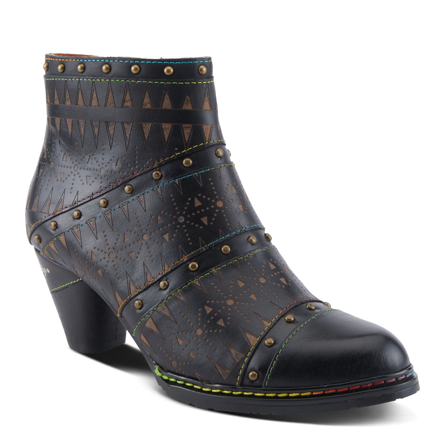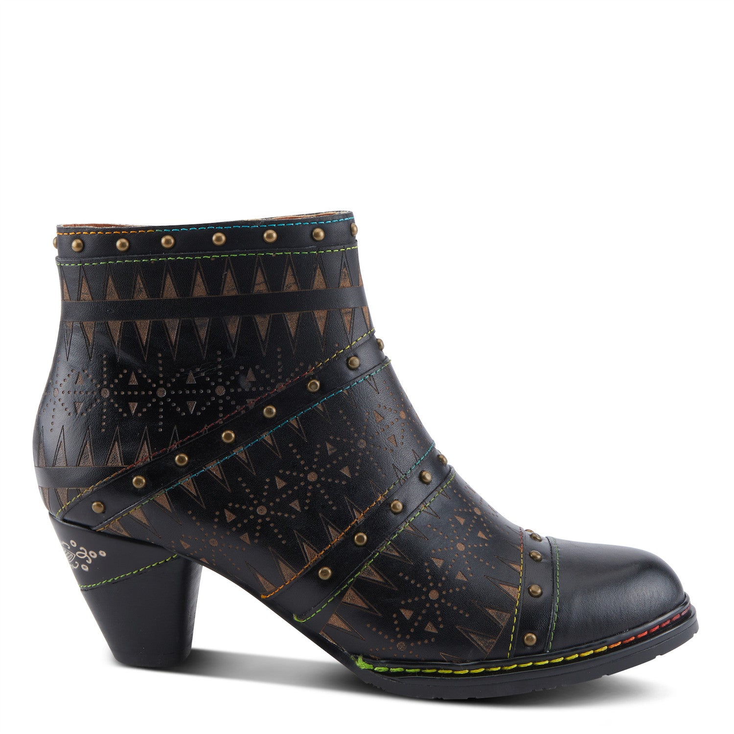 For the fashionista who wants a standout bootie to give an edge to any outfit, the NIOBE delivers bold style with impeccable quality. The striking design will have you looking forward to wearing these beauties for years to come. Upper: Leather Lining: Velvet Insole: Synthetic Leather Outsole: Rubber Closure: Zipper Heel Height: 2 1/2" Shaft Height: 5 1/2" Circumference: 9 1/4" Features: - Fit Recommendation: Fits true to size - Tonal leather upper with subtle burnishing on toe and back heel - Etched patterns between gold studding details - Inside zipper for easy on and off - Intertwined signature rainbow stitching on welt Disclaimer: L’Artiste products are made with natural tanned leather using traditional hand painting techniques. This unique finishing process is used to create a natural effect with color variations to deliver authentic look and beauty.