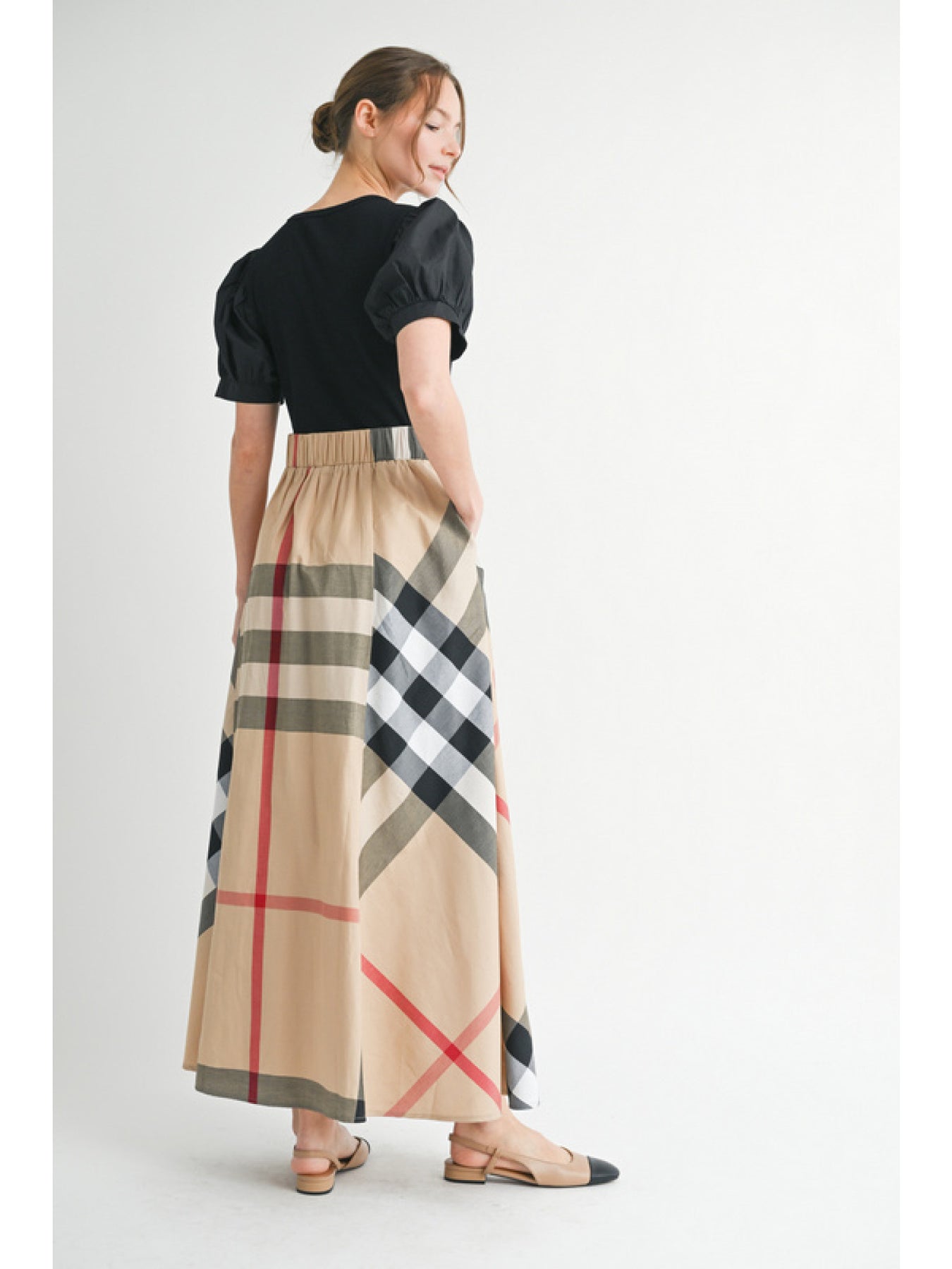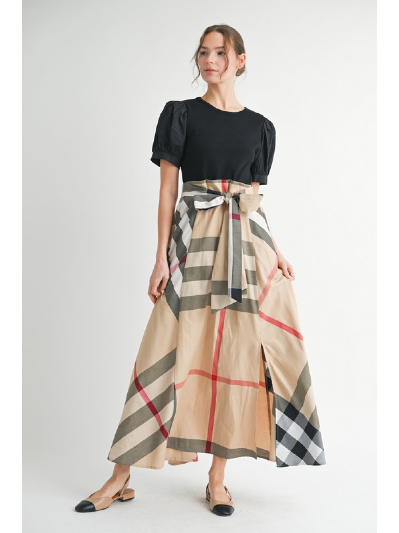 Consisting of a black top with short puff sleeves and a high-waisted, maxi skirt with a classic checkered pattern print. The skirt is tied at the waist with a matching fabric belt, creating a cinched silhouette. A high slit on one side adds.